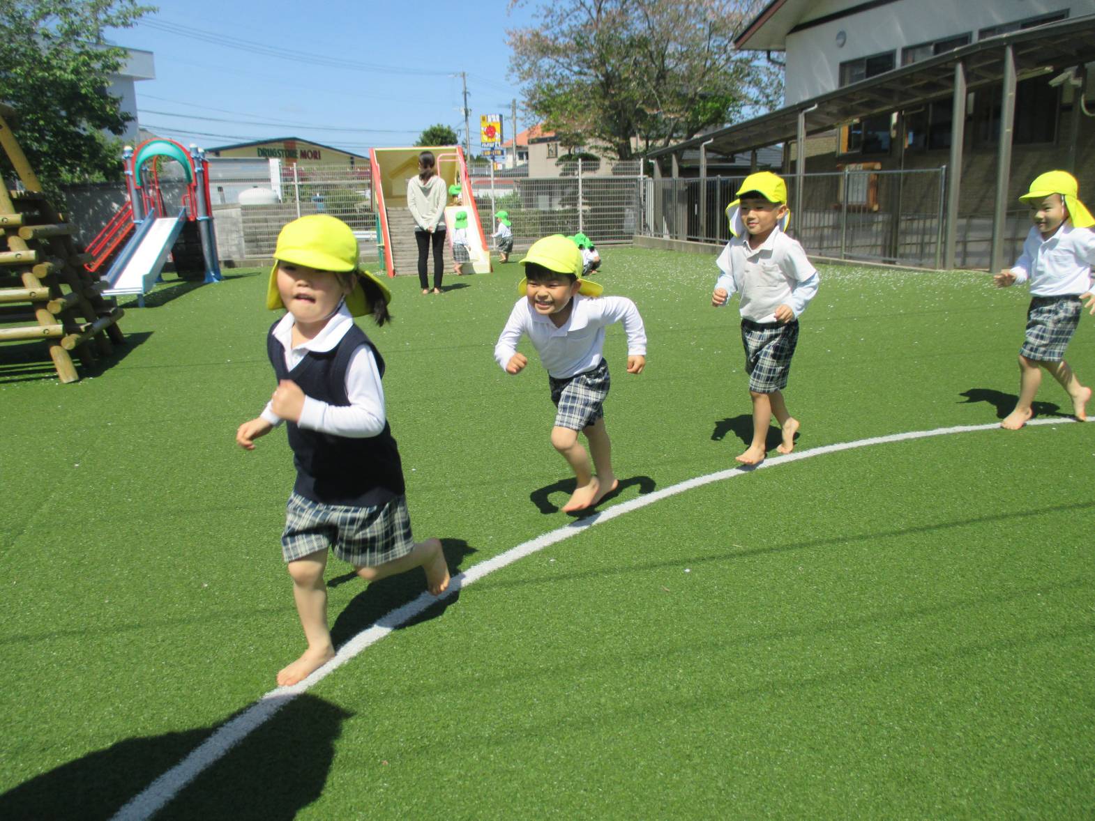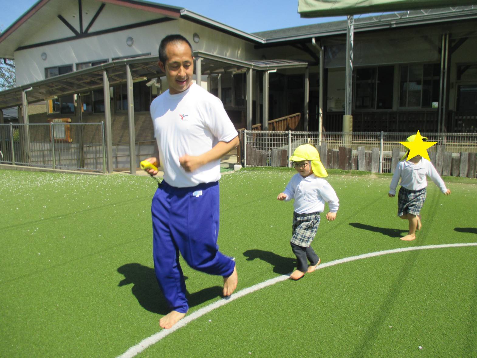 そして子どもたちが楽しみにしていた、大浦先生と鬼ごっこをしました。また大浦先生から、早く走るコツも教えてもらいました。「手をたくさん振ったら早く走れてるんだって。」、「転ばない、ぶつからない、飛び出さないの約束をしっかり守ろうね。」と、友だち同士で確認し合う姿が見られました。