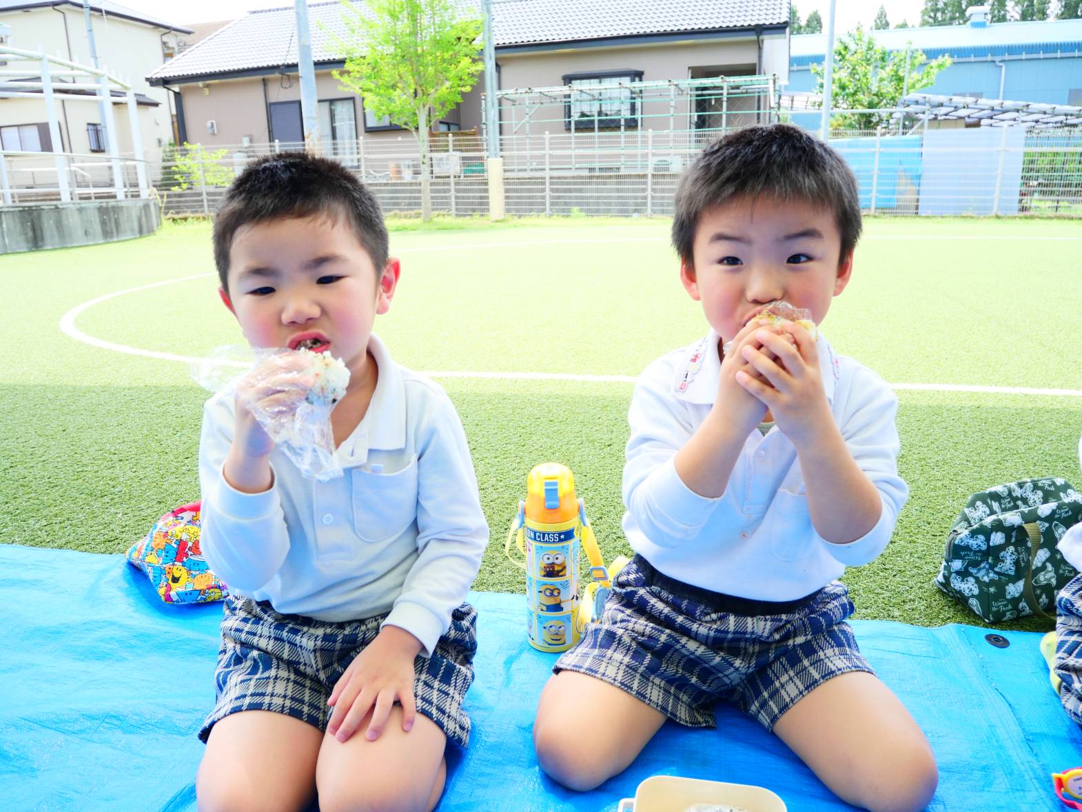 そして散歩を終え保育園に着くと、子どもたちがとても楽しみにしていたおむすびの時間です。「私のおにぎりは星の形をしているよ♪」、「僕のおむすびの中はツナマヨだった!」と、友だちと会話を弾ませる姿が見られました。