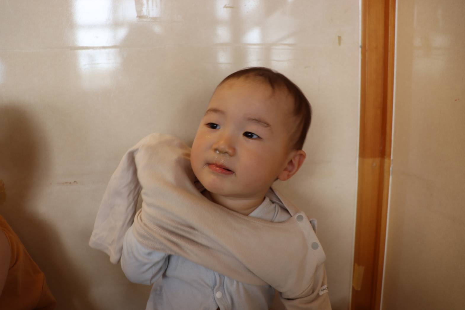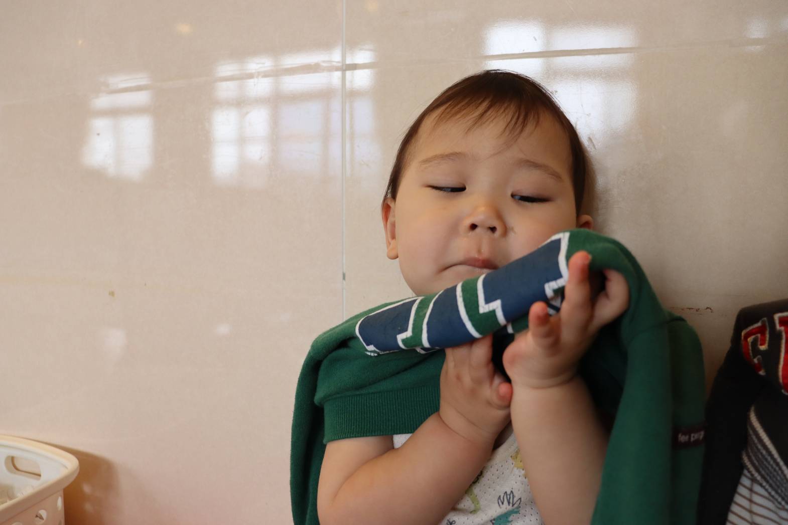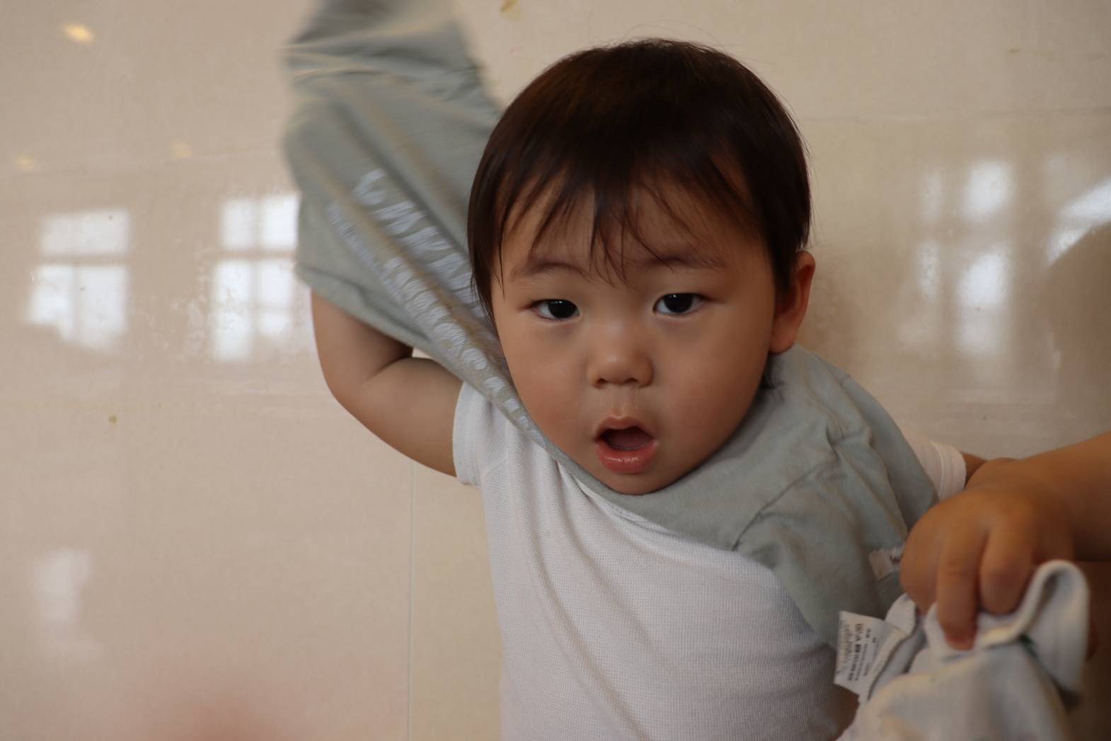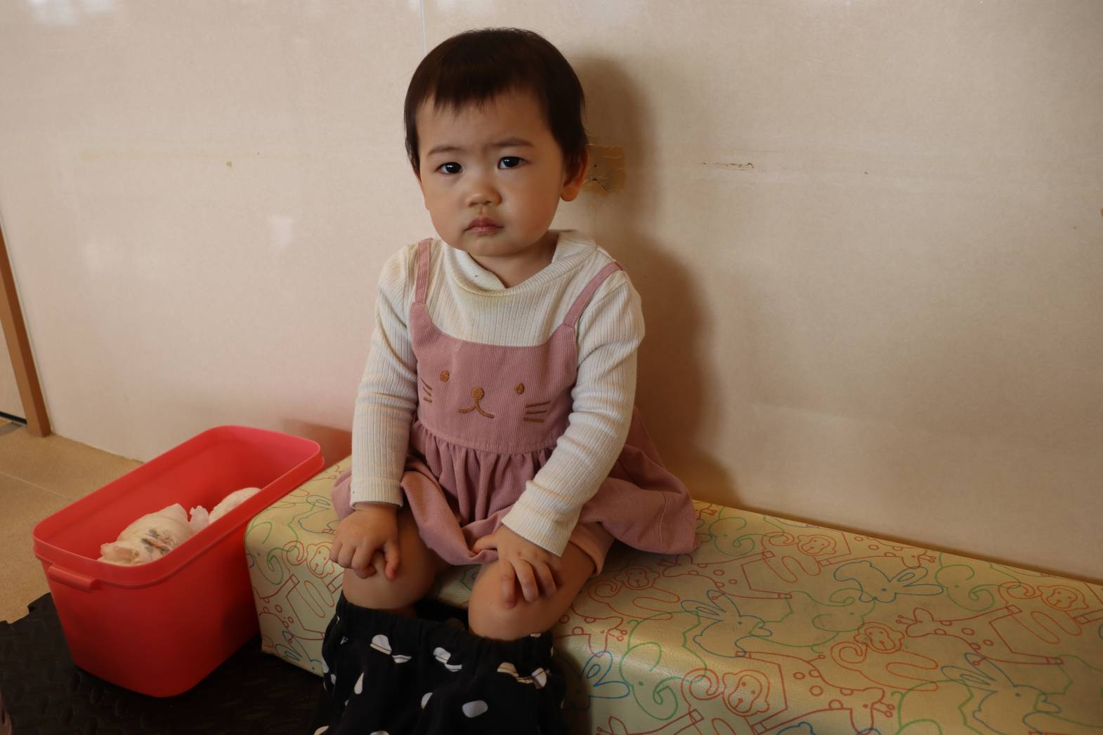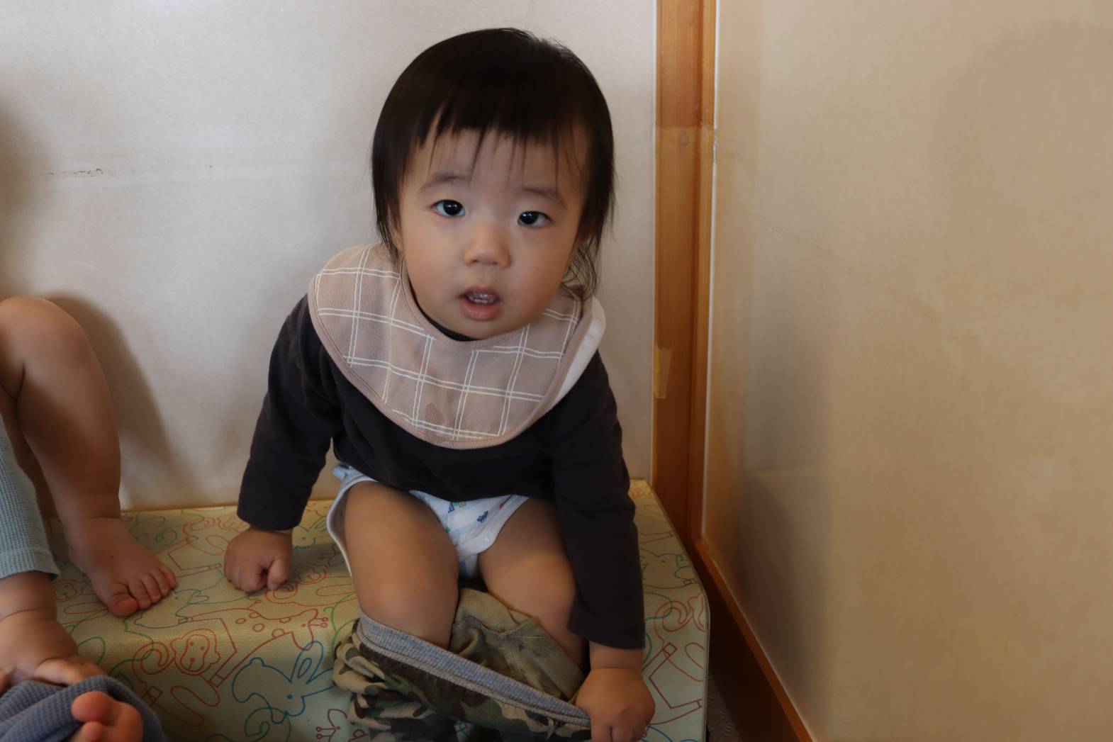 進級して2週間が経ち、少しずつ日々の流れを理解している様子が見られています。 お着替えでは、「ズボンを脱ぐよ。」と声を掛けながら少し下ろしてあげると、 ズボンに手を添えて脱ごうとする姿が見られます。 上着や肌着は、保育者が手を添えると、子どもたち自身で袖に手を通そうとします。 最後は、「半分こ。」「サンドイッチ。」と洋服を畳んで片付けると、 「できた!」と、嬉しそうにする、こあら組さん!