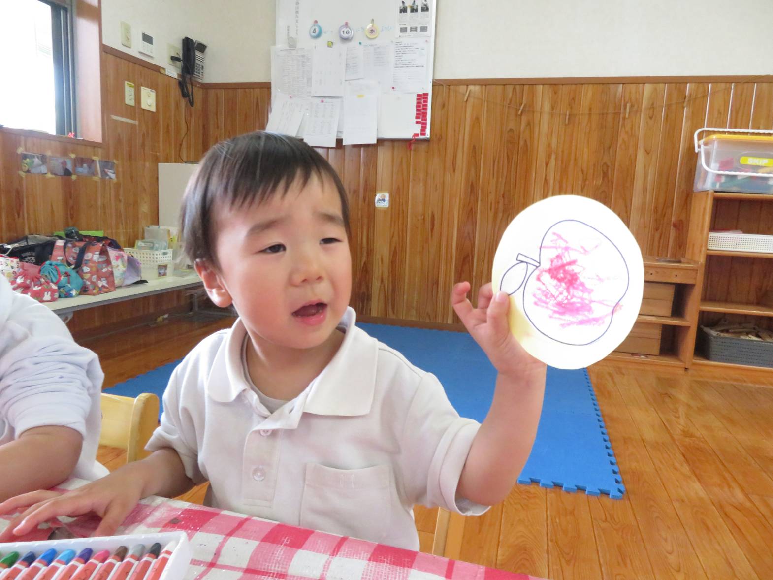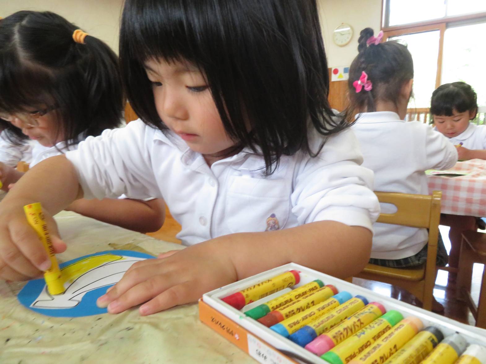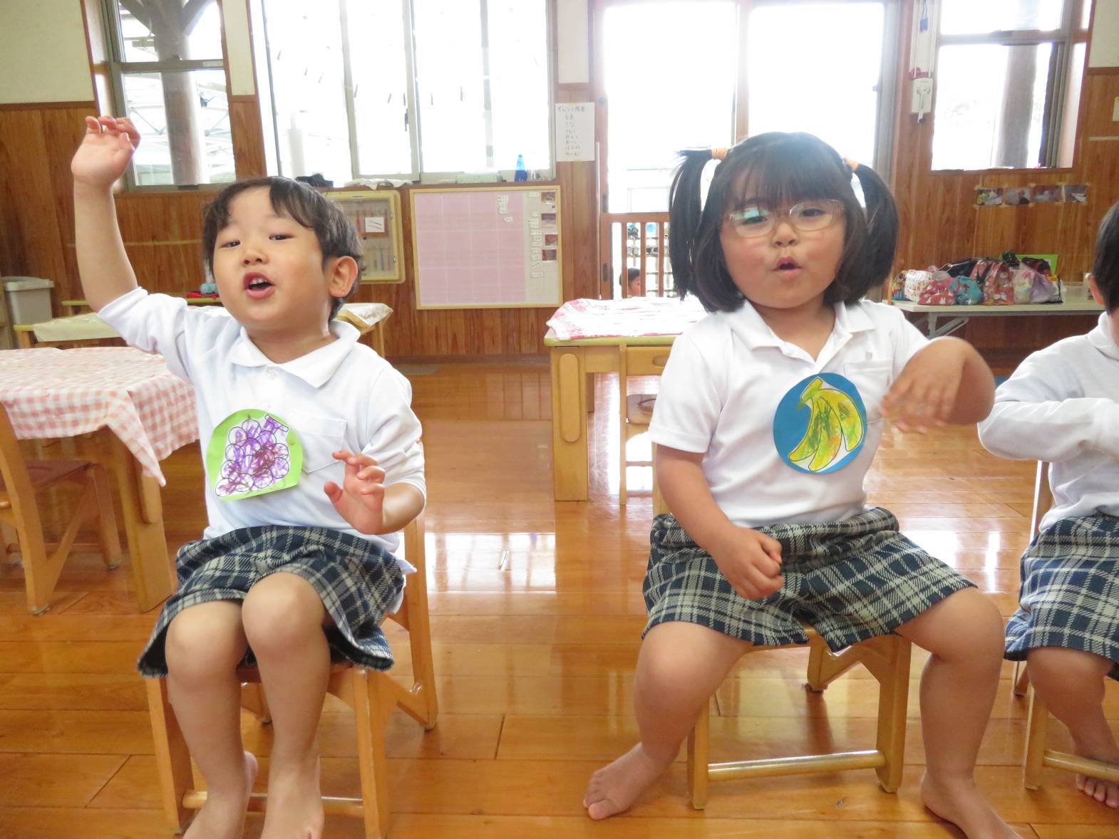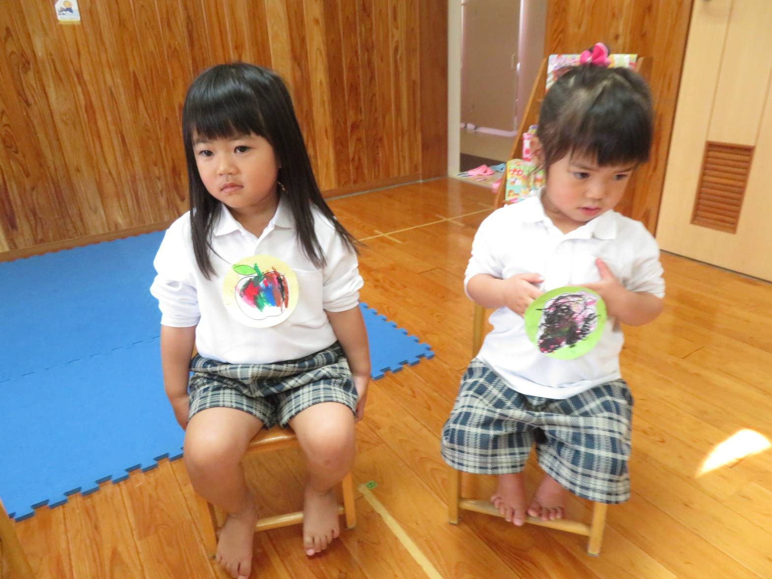 先日のおむすびの日の活動では、フルーツバスケットをしました。 まずは果物にクレヨンを使って、色塗りをしていきます。 「バナナだから黄色にしたよ!」、「虹色の果物にしようかな!」等と、自由に色塗りを楽しむ子どもたち! 完成すると、「できたー!」と嬉しそうにする姿も見られました。 フルーツバスケットのゲームが始まると、ルールを意識しながら「椅子に座れたよー!」、「次は何の果物かな~?」等と、たくさんの笑顔が見られました♪ 今後もいろいろな集団遊びに挑戦していきたいと思います!