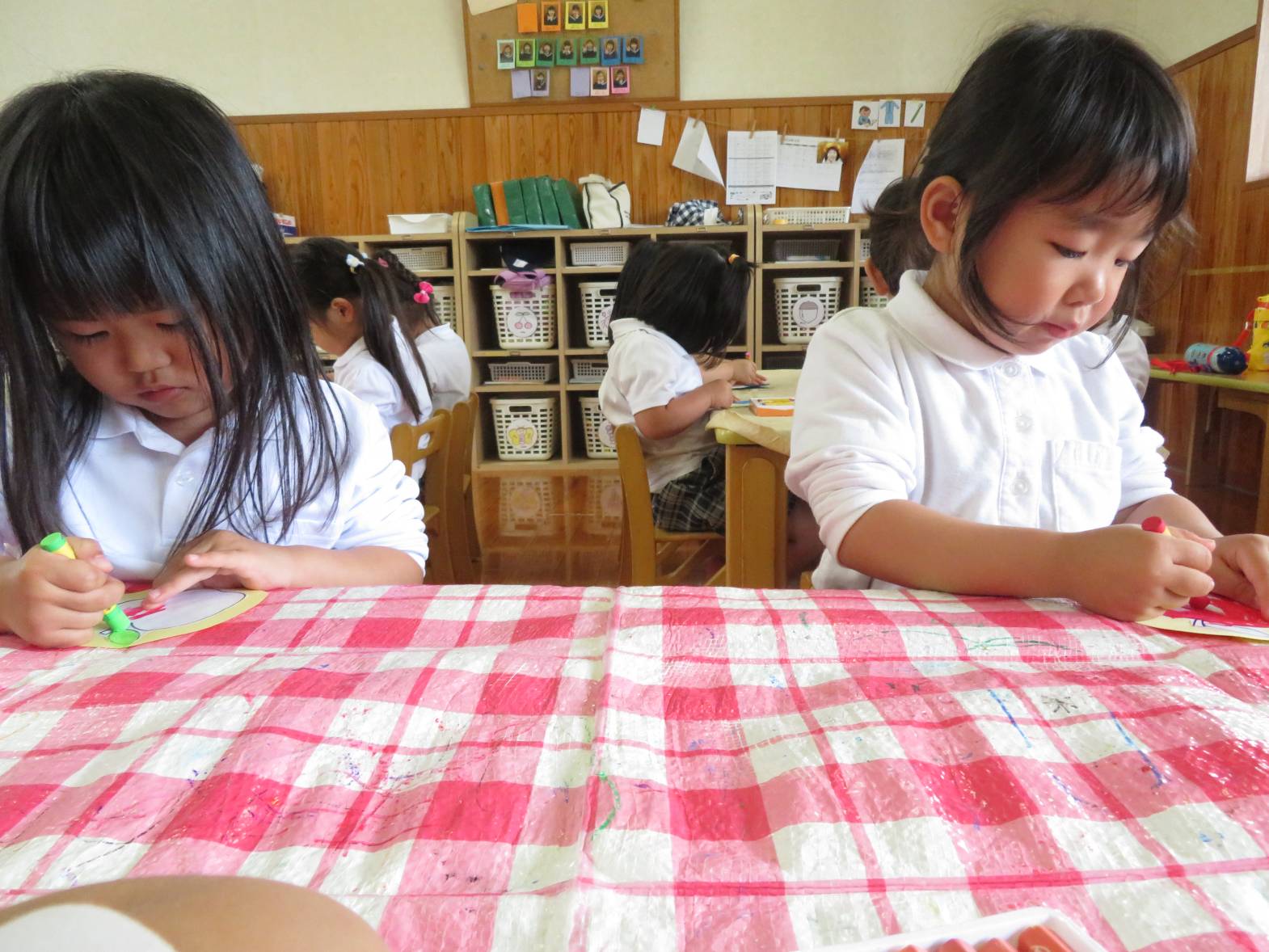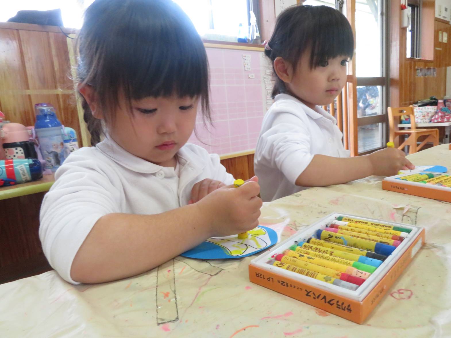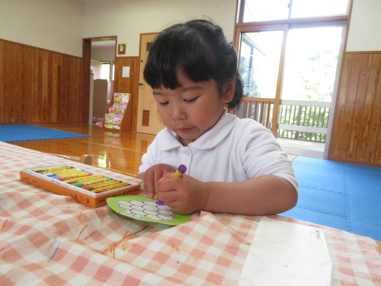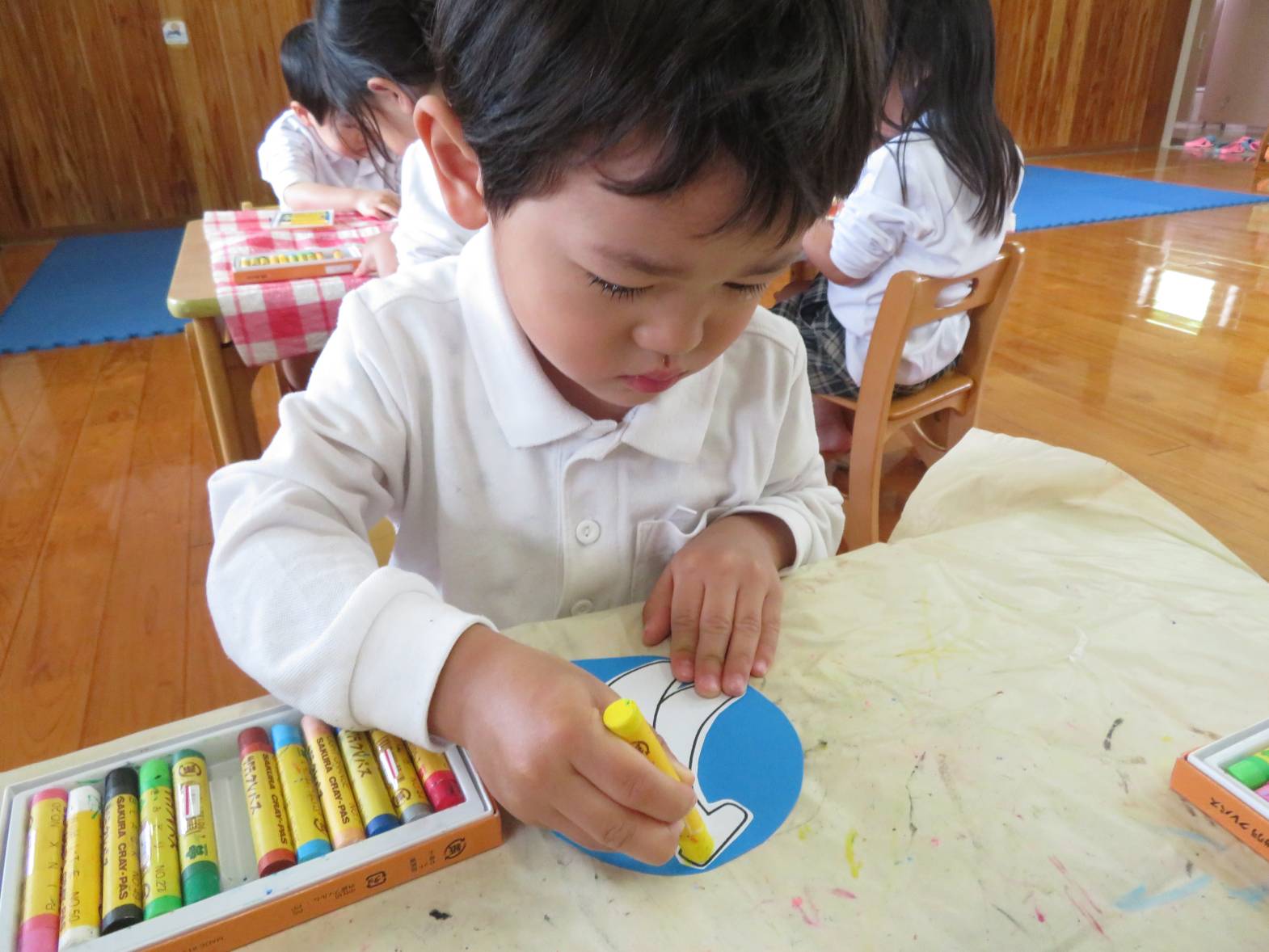 先日のおむすびの日の活動では、フルーツバスケットをしました。 まずは果物にクレヨンを使って、色塗りをしていきます。 「バナナだから黄色にしたよ!」、「虹色の果物にしようかな!」等と、自由に色塗りを楽しむ子どもたち! 完成すると、「できたー!」と嬉しそうにする姿も見られました。 フルーツバスケットのゲームが始まると、ルールを意識しながら「椅子に座れたよー!」、「次は何の果物かな~?」等と、たくさんの笑顔が見られました♪ 今後もいろいろな集団遊びに挑戦していきたいと思います!