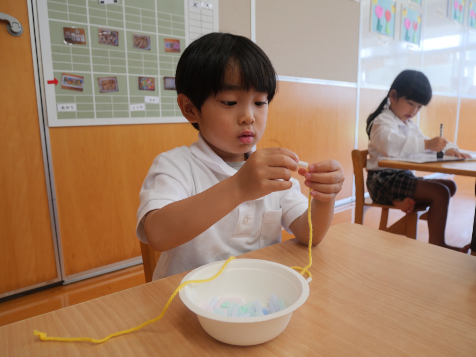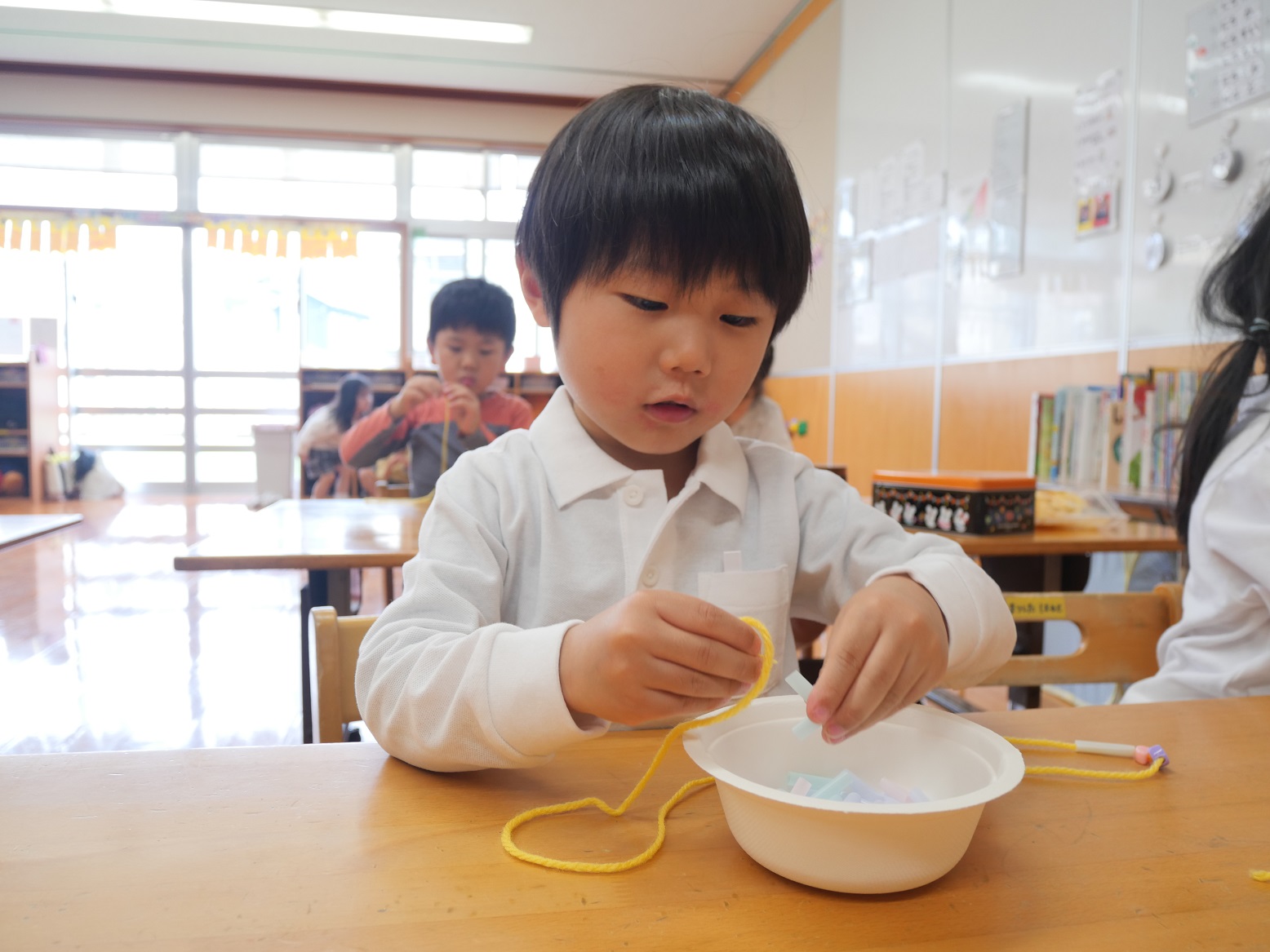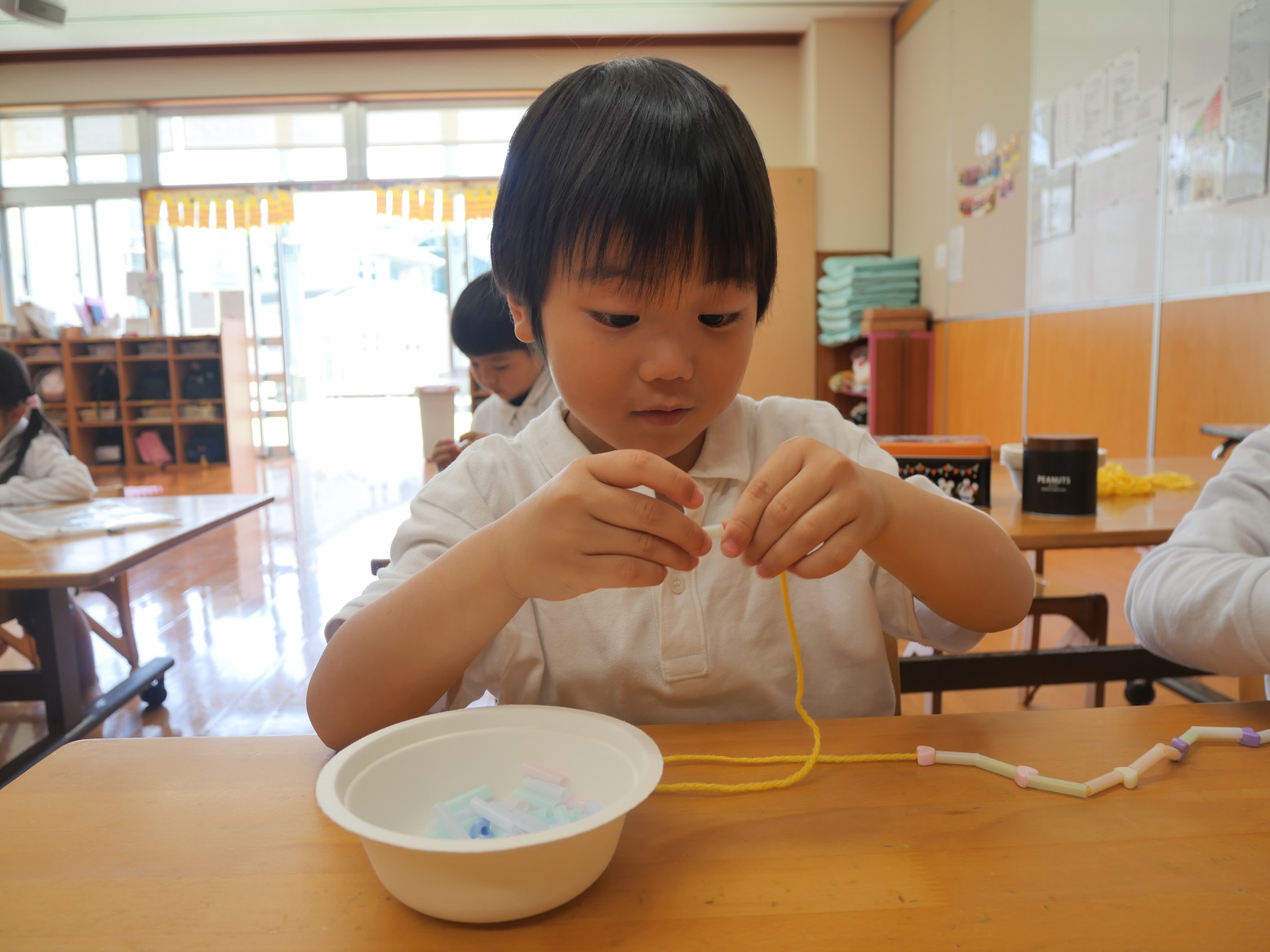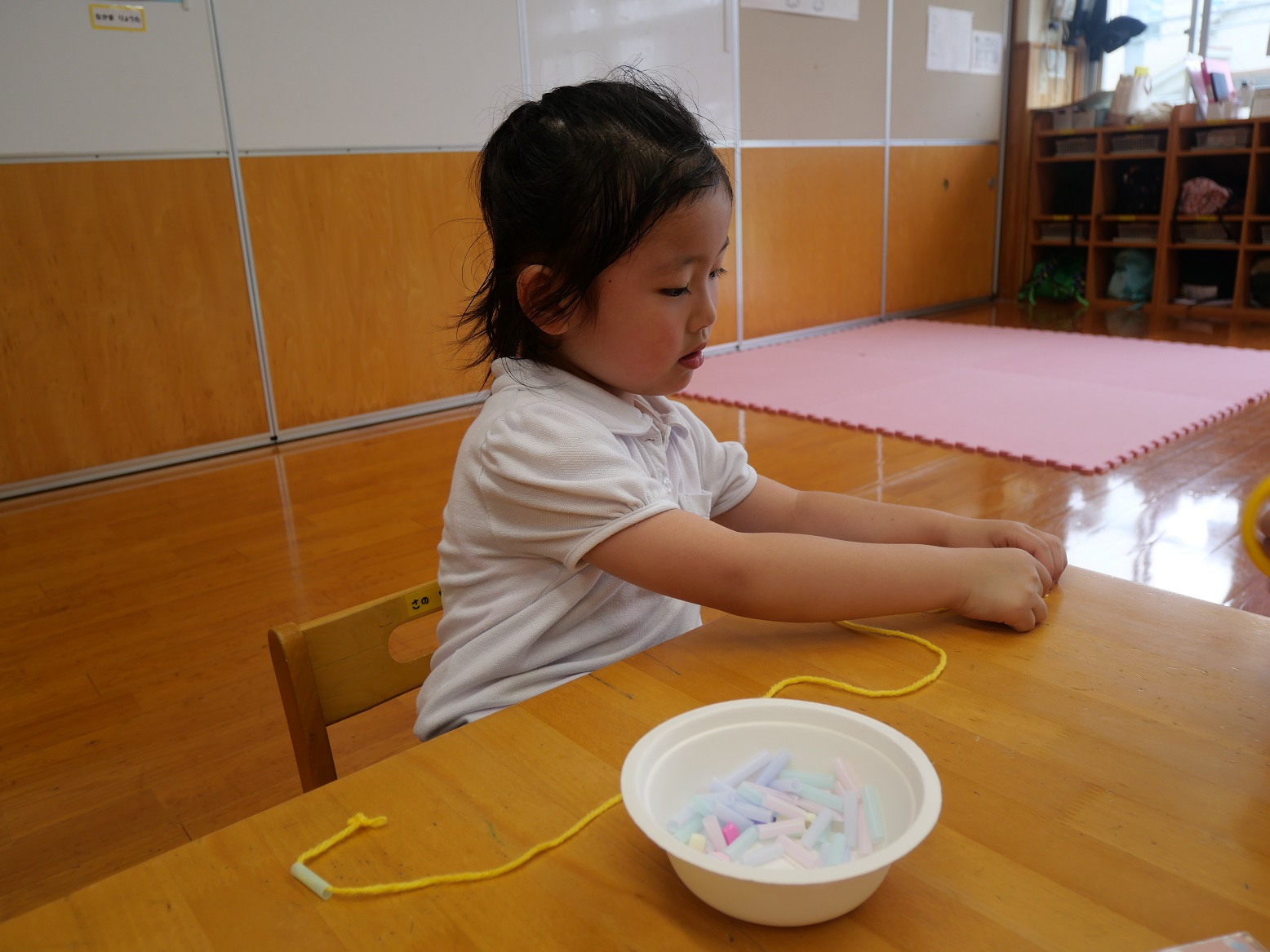 「この紐に通していくの?」「どれからにしようかな?」と、始まる前から楽しみにしている様子です。