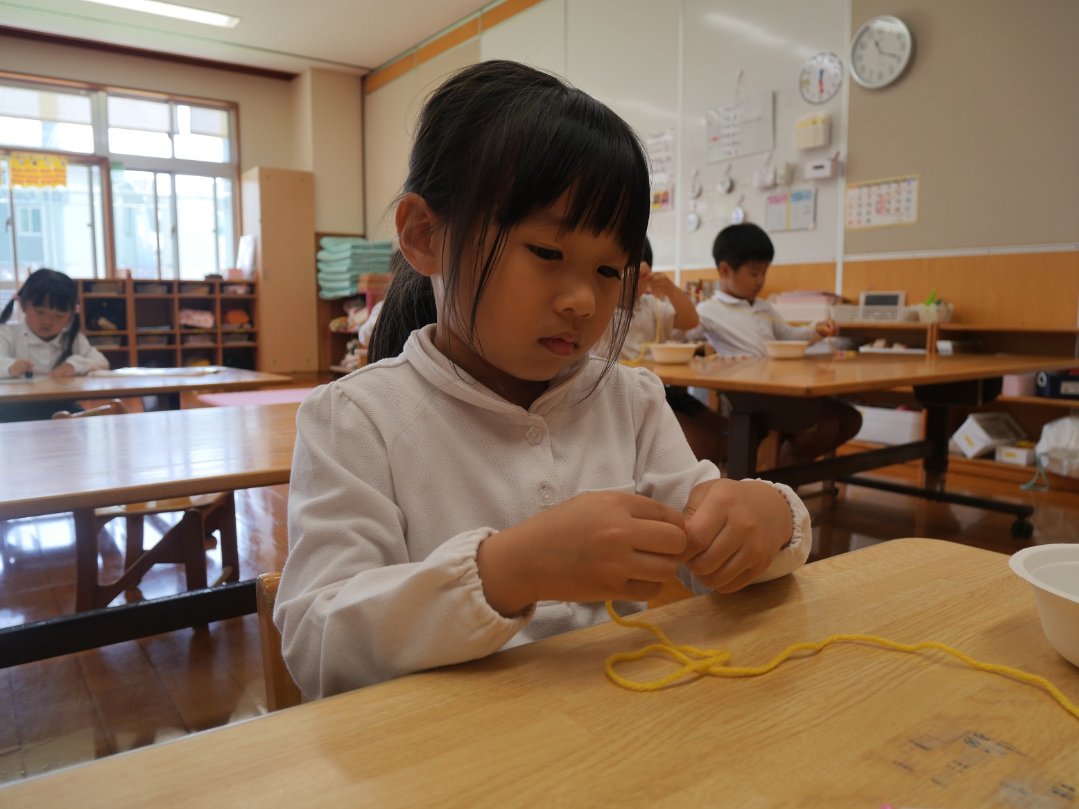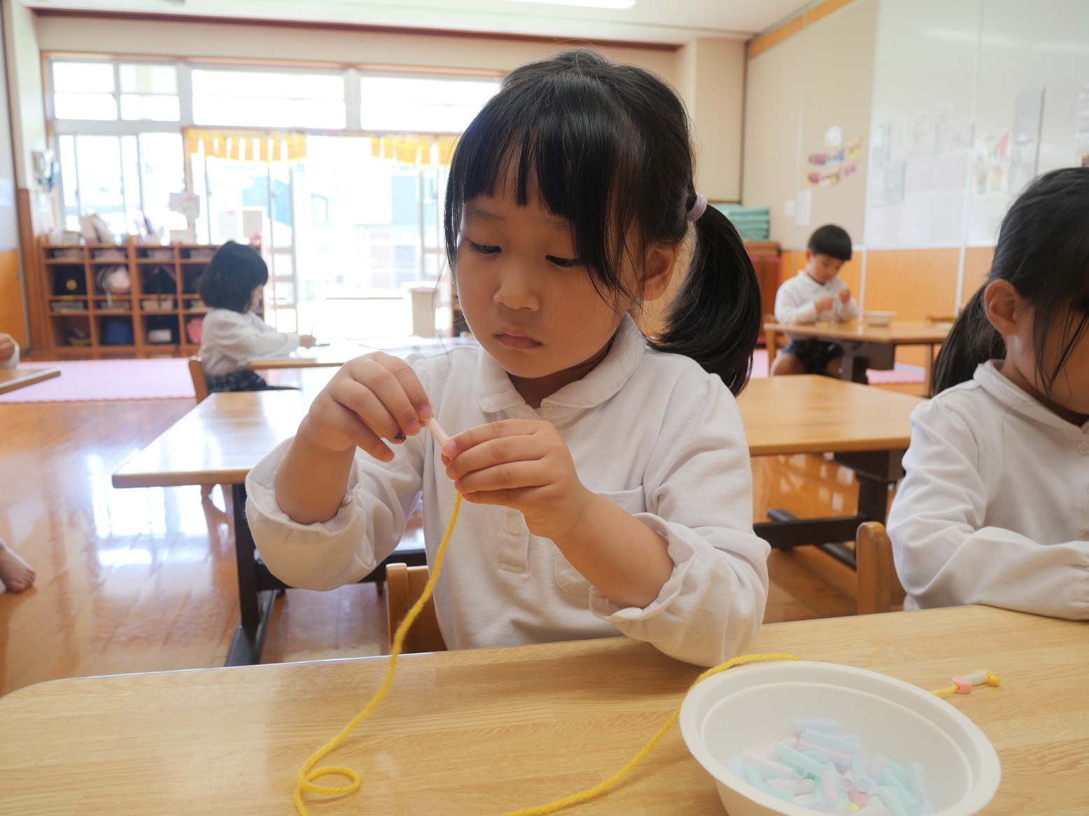 「もっといろんな物を通してみたいね」「またやりたい!」と、紐通し遊びを楽しんだ様子の子どもたちです。