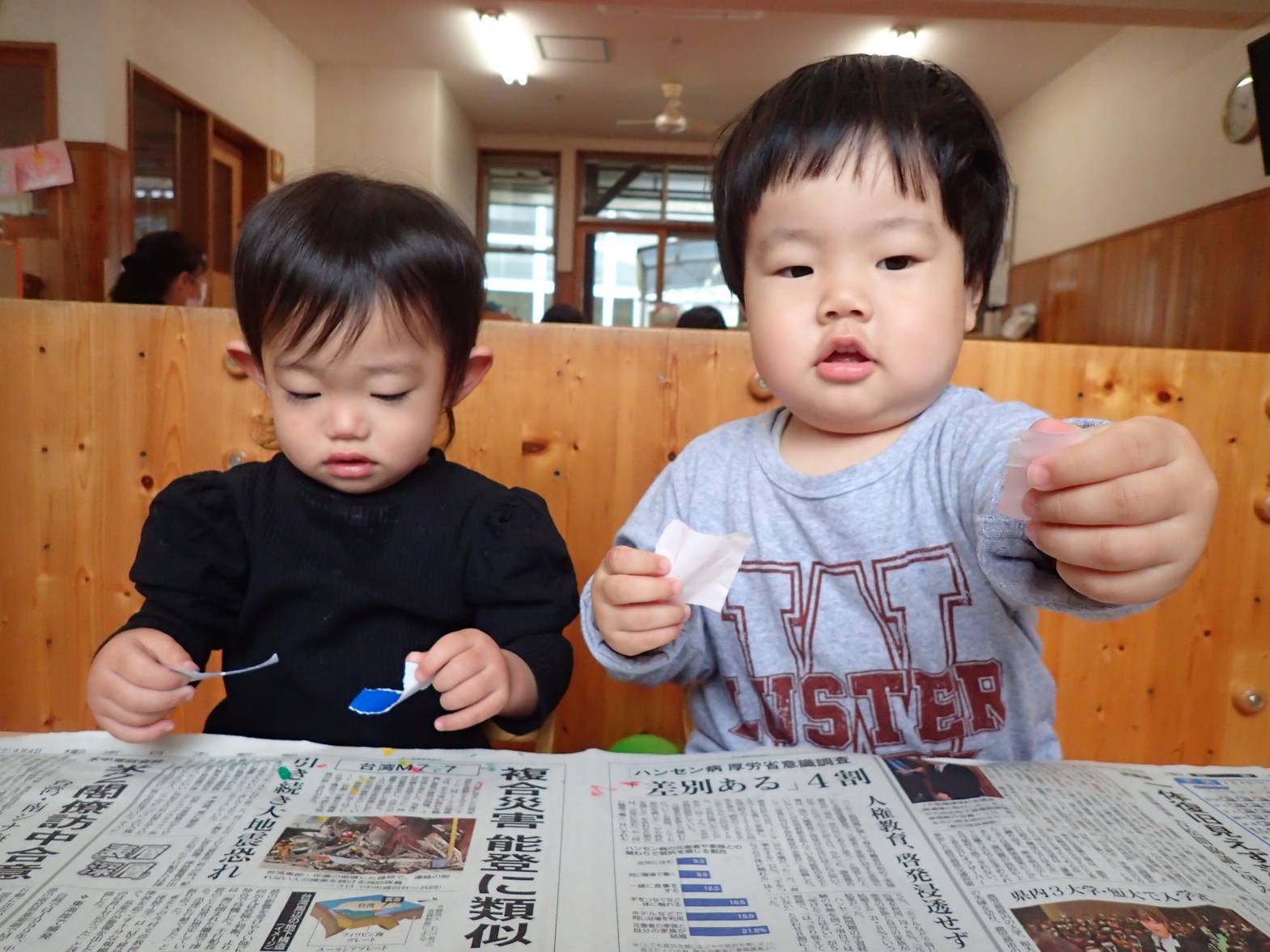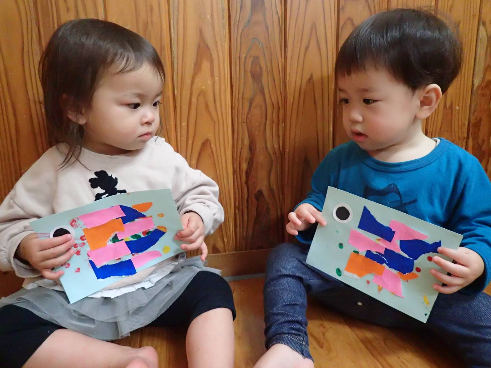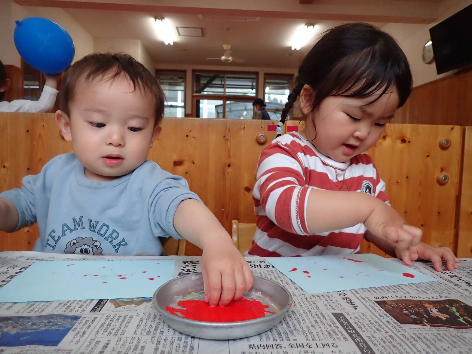 こいのぼり製作では、折り紙ちぎりと指スタンプをしました。 折り紙は、力の入れ加減が難しい姿がありましたが、保育者が切れ目を入れて渡すと、その後は自分の力でちぎることができました! またスタンプでは、初めての子どもたちは“なんだろう?”と不思議そうに見つめていましたが、お友だちや保育者の姿を見て、指先に絵の具をつけていきます。 「トントン!」と一緒に言いながら、スタンプすることを楽しみました。 かわいいこいのぼりの完成です!