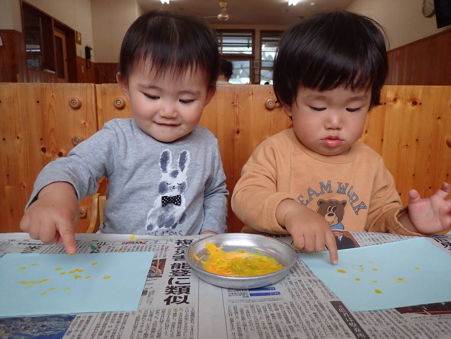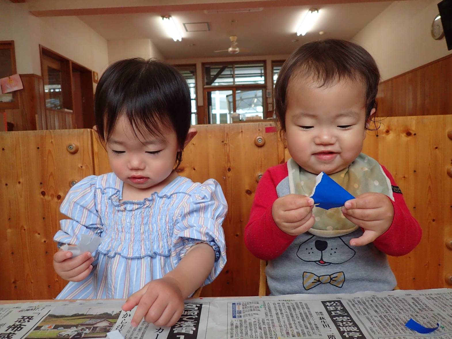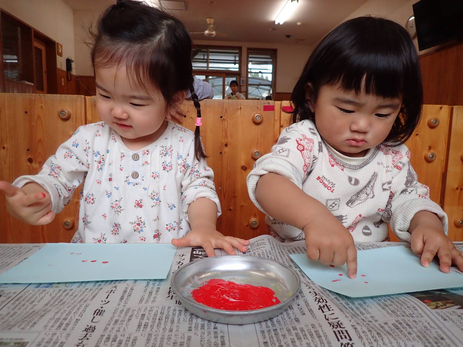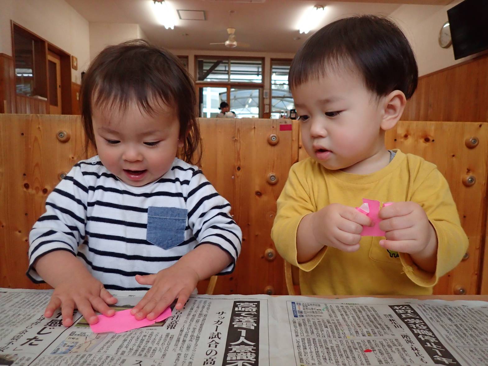 こいのぼり製作では、折り紙ちぎりと指スタンプをしました。 折り紙は、力の入れ加減が難しい姿がありましたが、保育者が切れ目を入れて渡すと、その後は自分の力でちぎることができました! またスタンプでは、初めての子どもたちは“なんだろう?”と不思議そうに見つめていましたが、お友だちや保育者の姿を見て、指先に絵の具をつけていきます。 「トントン!」と一緒に言いながら、スタンプすることを楽しみました。 かわいいこいのぼりの完成です!