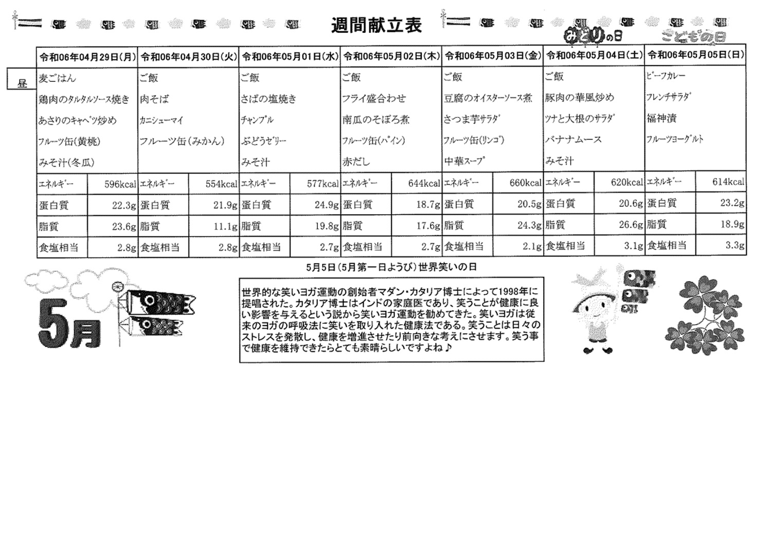 4月29日(月)~5月5日(日)の献立表になります。ぜひご覧ください。