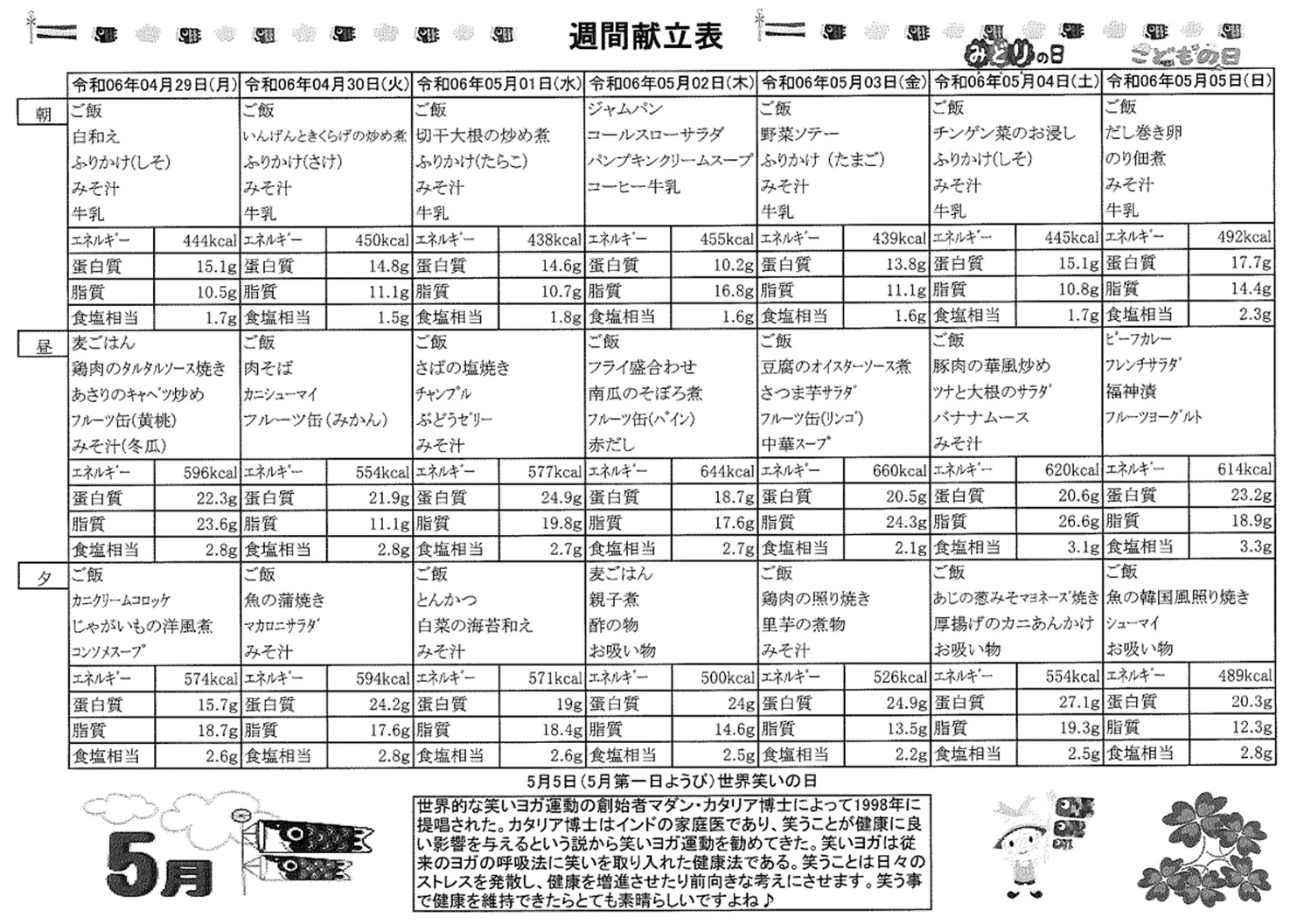 4月29日(月)~5月5日(日)の献立表になります。ぜひご覧ください。