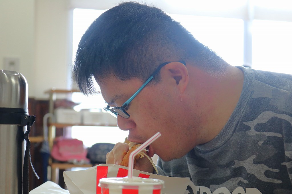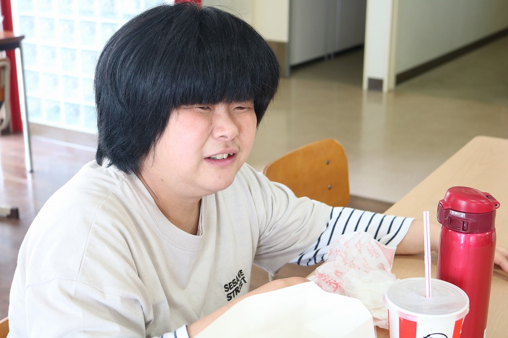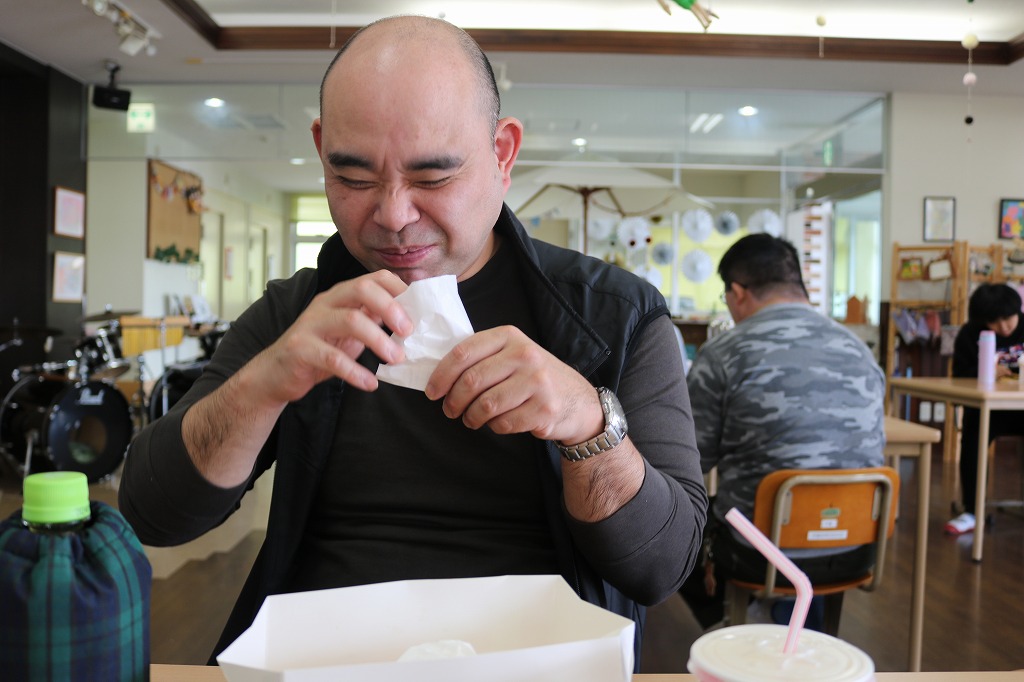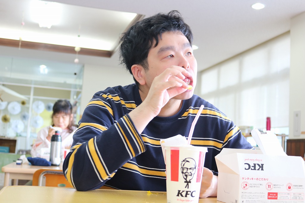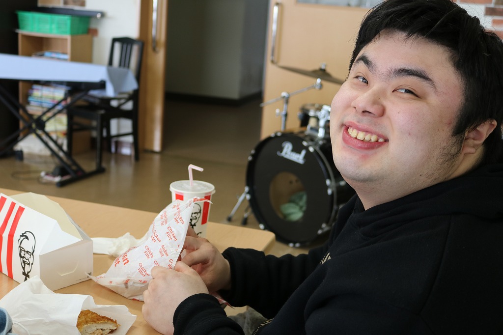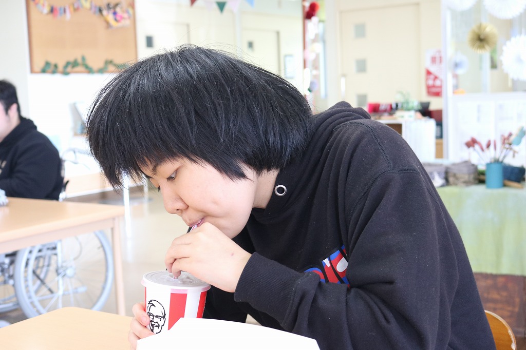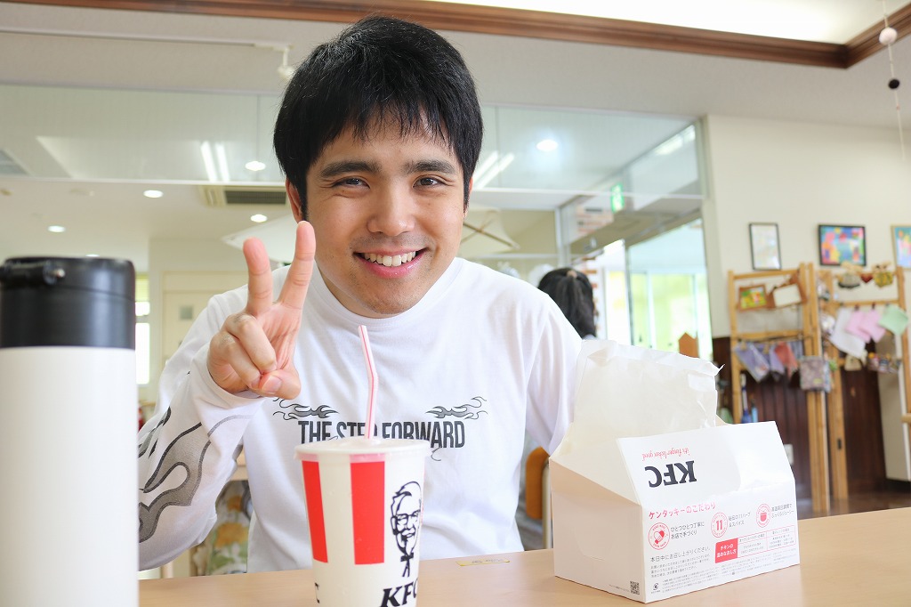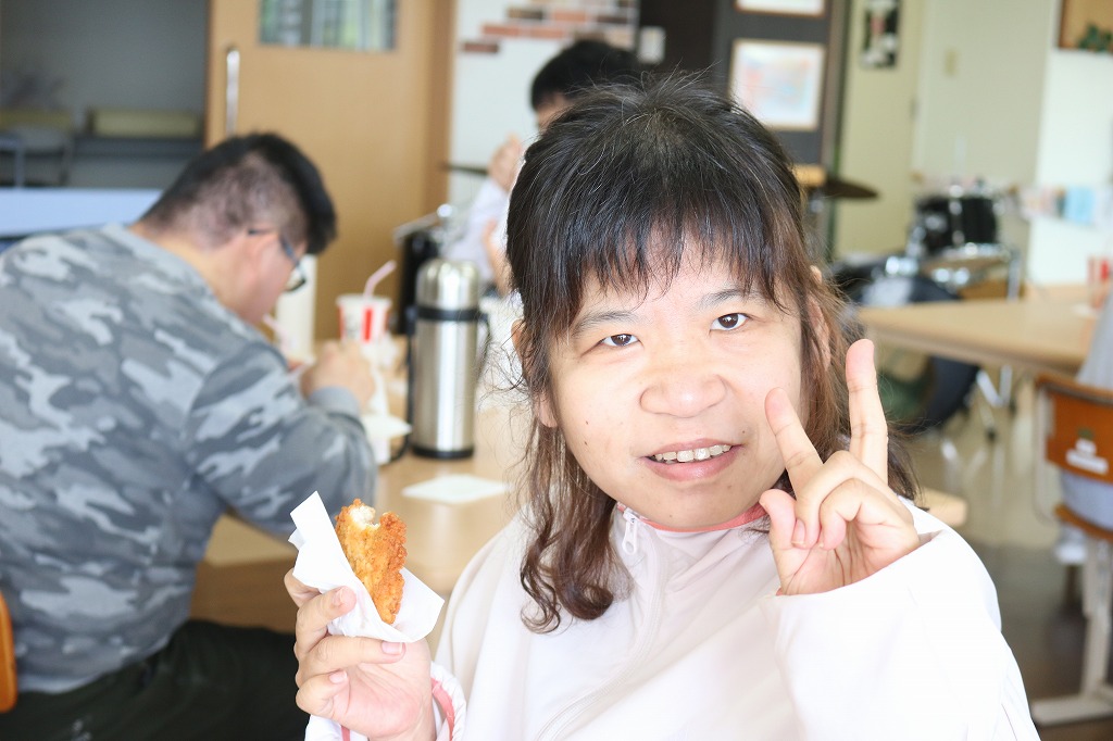 本日は、皆さんでカラオケを行いました。 ご自身で選曲した歌をそれぞれ楽しまれていました。 また、昼食時にはテイクアウト活動として、 チキンフィレバーガーセットを食べました。 「美味しい!」「うまい!」「最高だよ。」と笑顔で過ごしていました。