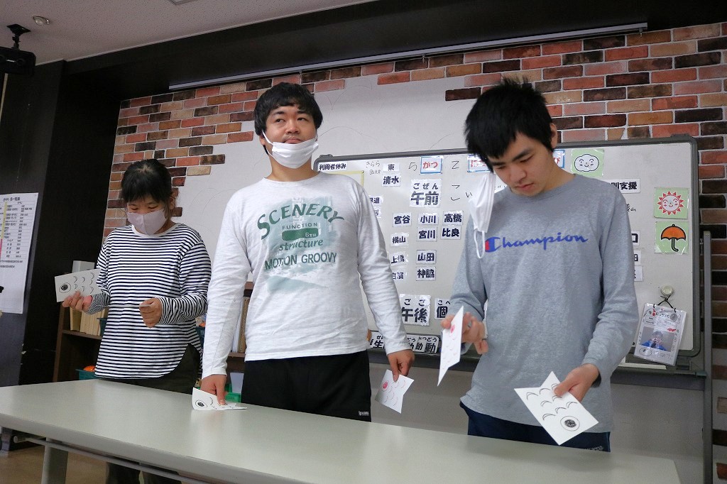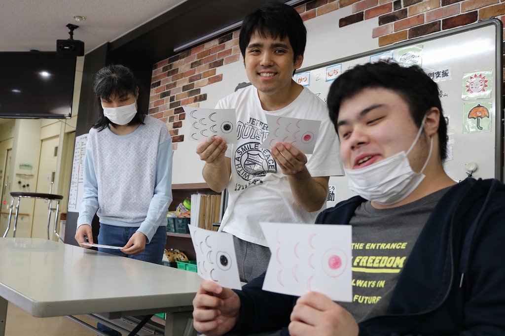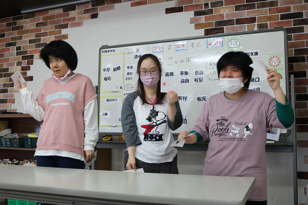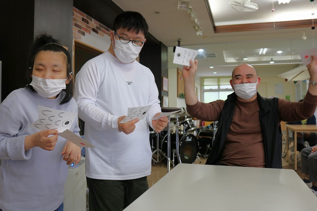 本日は「こいのぼり会」を行いました。 5月5日こどもの日より少し早いですが、行事に関わるレクリエーションとして 「こいのぼり旗上げゲーム」に取り組んでもらいました。 どちらを挙げるかハラハラドキドキしながら頑張りました。