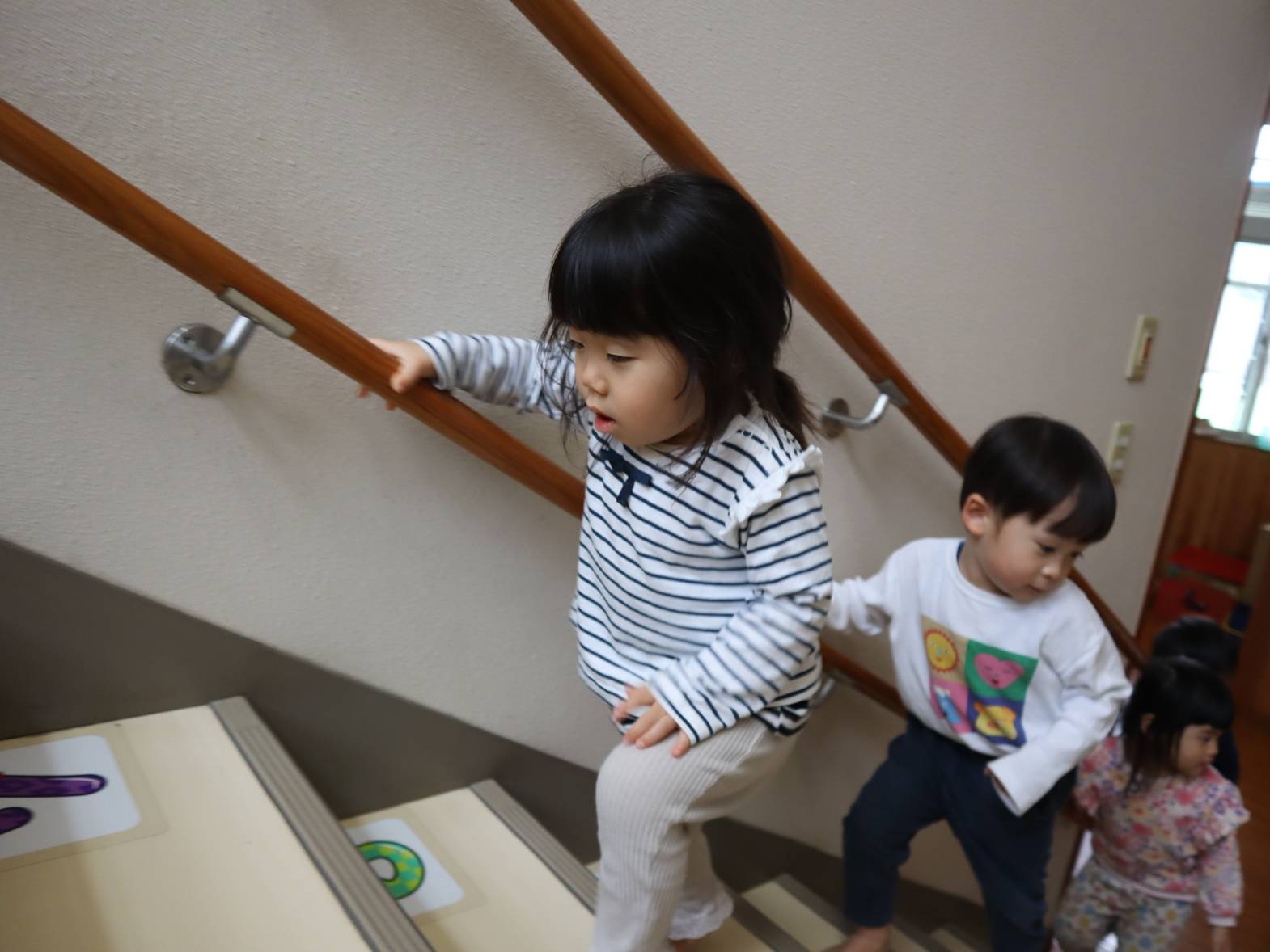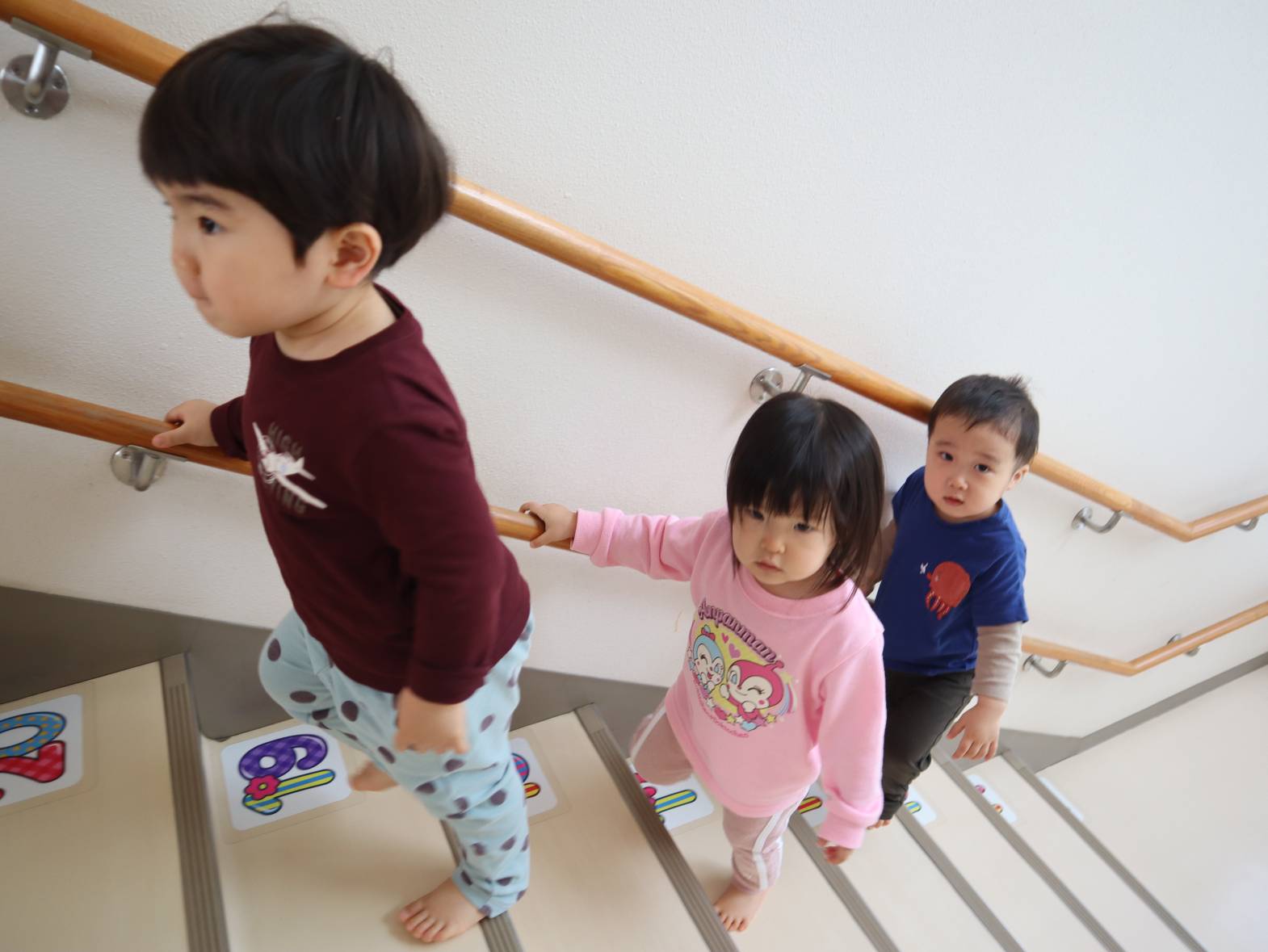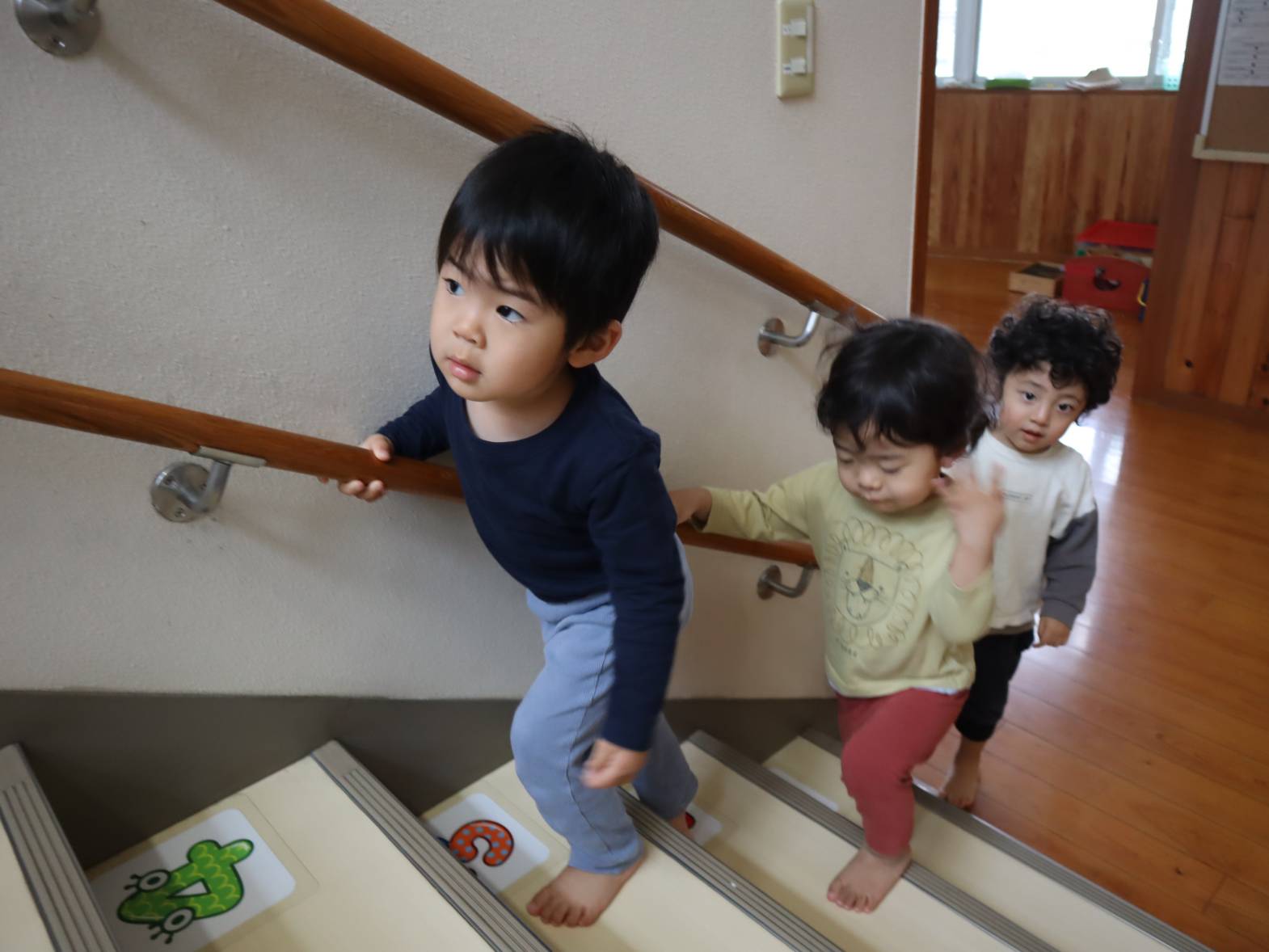 園庭やプレイルームなど、下に降りて遊ぶ機会が増えたぱんだ組さん。 すっかり階段が上手になり、スムーズに移動する姿が見られます。 「下を持つ!」、「ドンしない!」と自分たちで約束事の確認もばっちりです! 今後も、安全に気を付けながら階段の移動を実施していきたいと思います。
