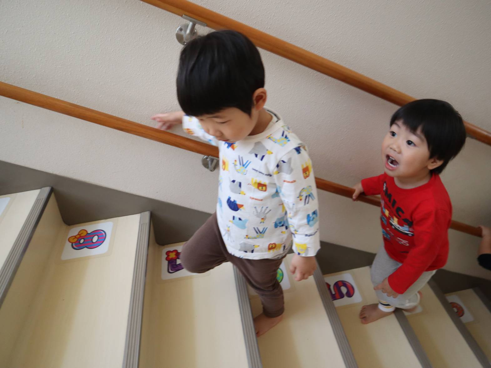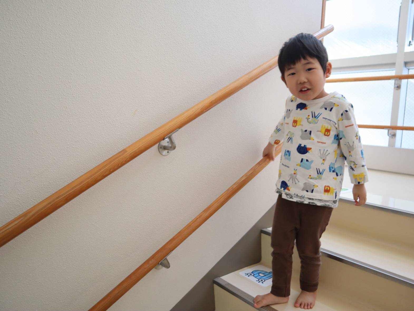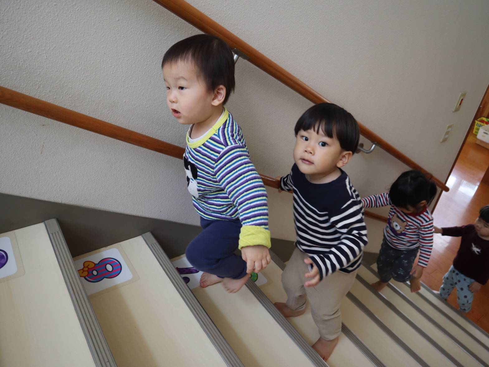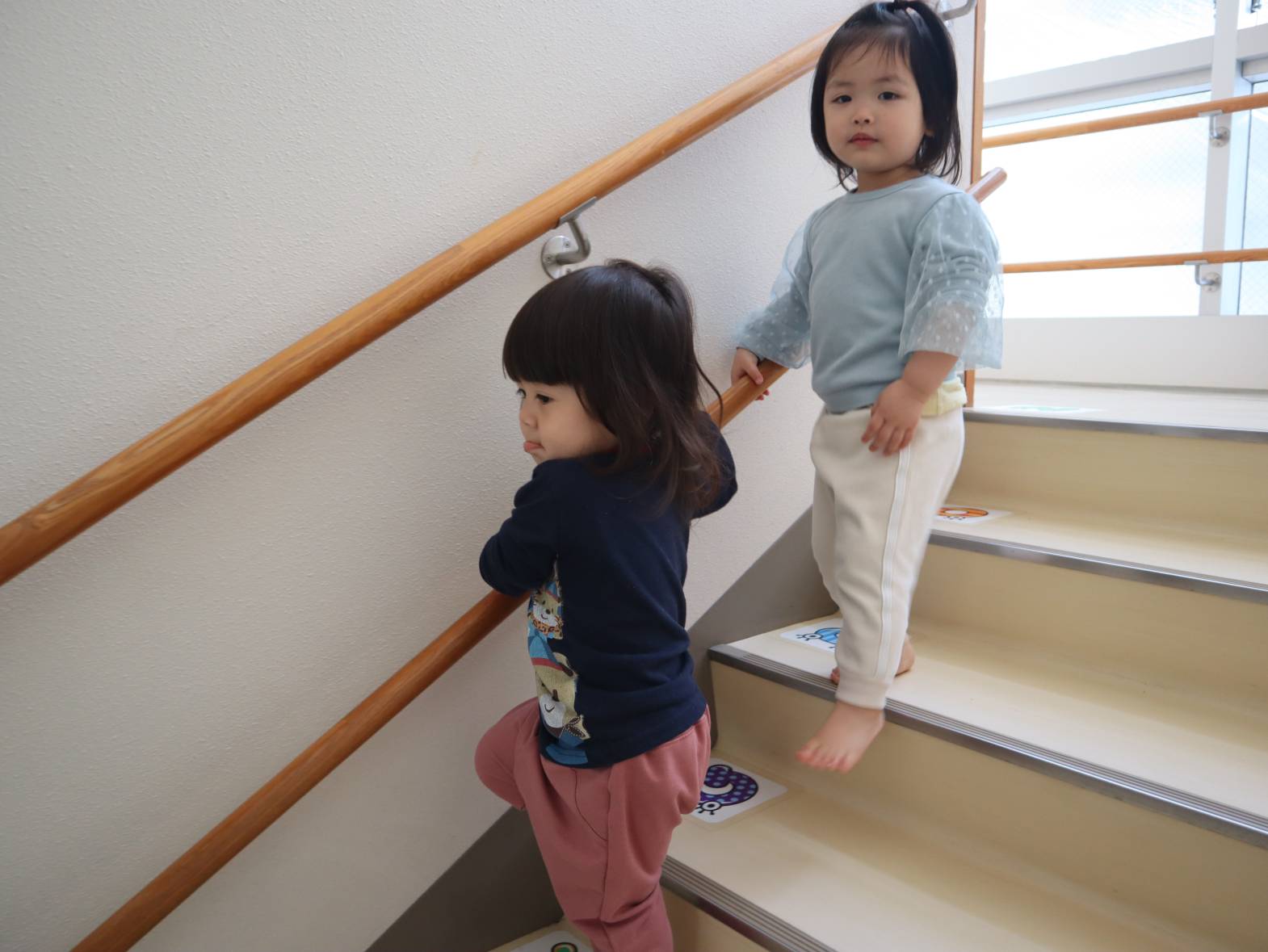 園庭やプレイルームなど、下に降りて遊ぶ機会が増えたぱんだ組さん。 すっかり階段が上手になり、スムーズに移動する姿が見られます。 「下を持つ!」、「ドンしない!」と自分たちで約束事の確認もばっちりです! 今後も、安全に気を付けながら階段の移動を実施していきたいと思います。