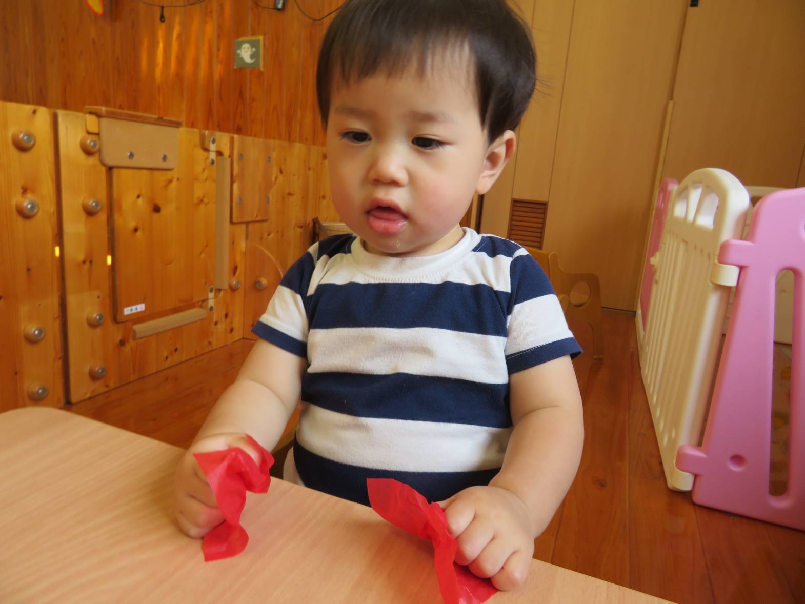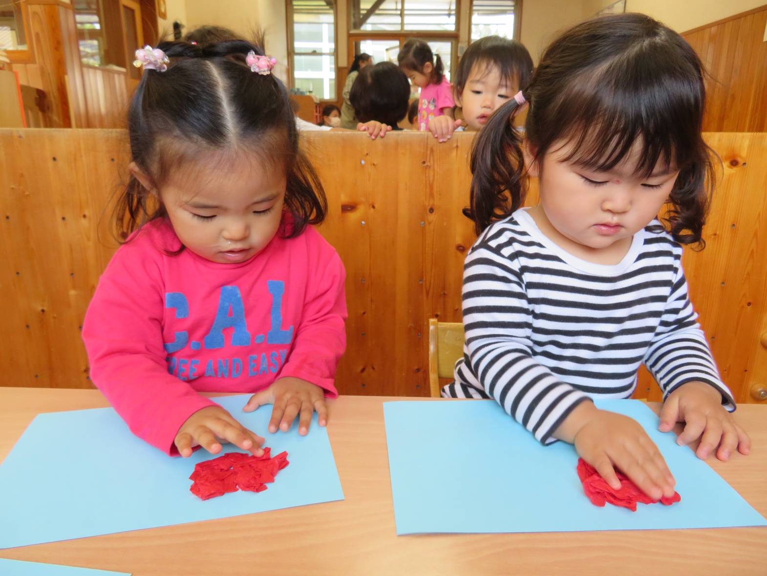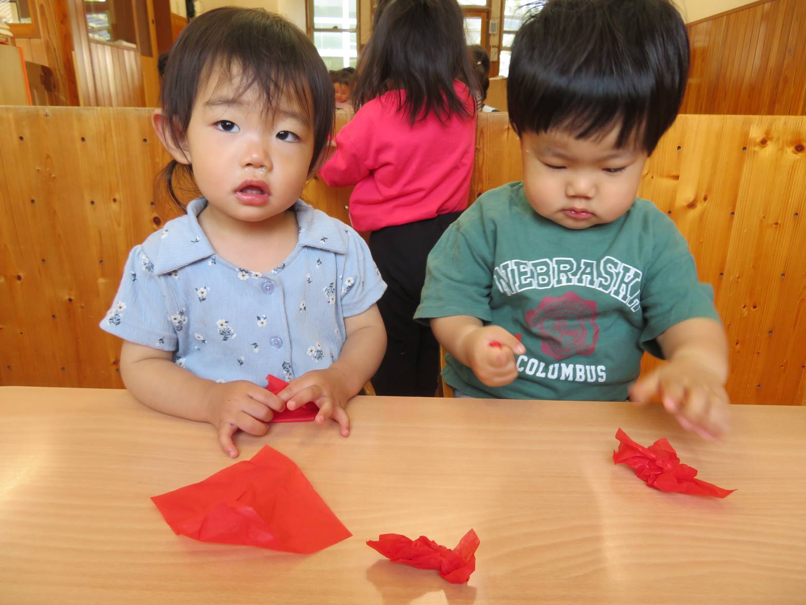 先日の母の日に向けて、花紙を使った製作をしました。 机に置いてあるフワフワした紙をすぐに手に取り、なんだろう?と不思議そうに見つめていた子どもたち。 優しく丸めたり、小さくギュッと握ったりとそれぞれの方法で楽しむ姿が見られました! 丸めたものを画用紙に貼り、カーネーションの完成です。 “こう?”と保育者に確認しながら、真剣に貼る子どもたちでした。 可愛い手形のお花も添え、素敵なプレゼントを渡すことができました!