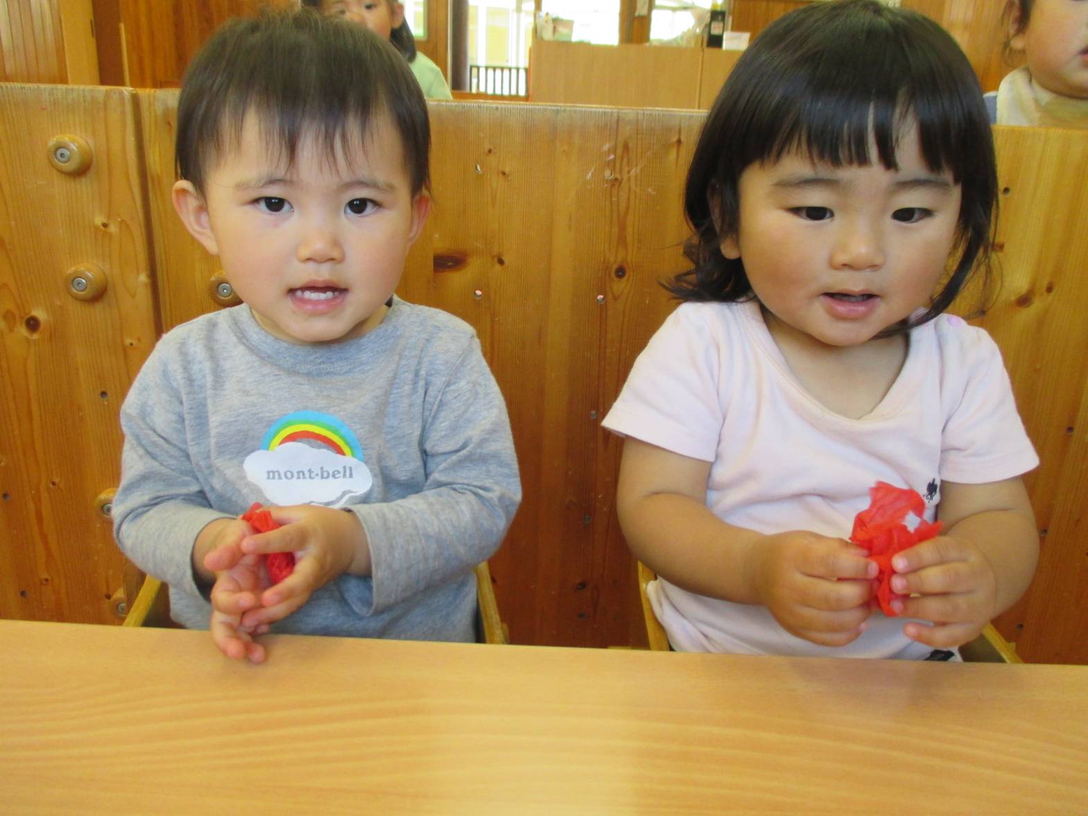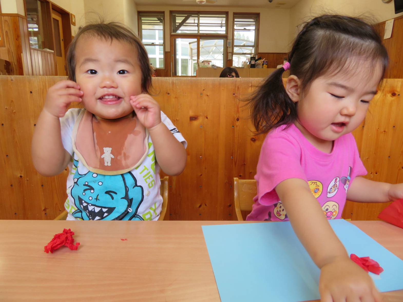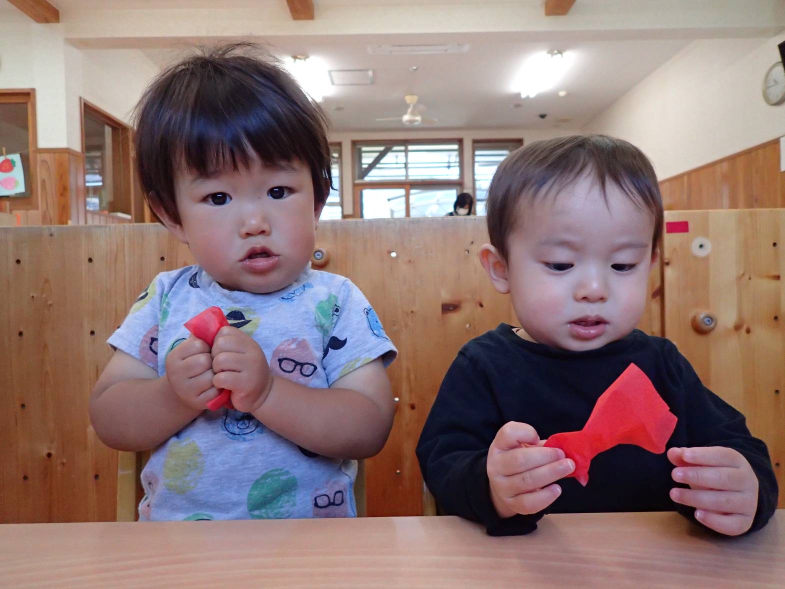 先日の母の日に向けて、花紙を使った製作をしました。 机に置いてあるフワフワした紙をすぐに手に取り、なんだろう?と不思議そうに見つめていた子どもたち。 優しく丸めたり、小さくギュッと握ったりとそれぞれの方法で楽しむ姿が見られました! 丸めたものを画用紙に貼り、カーネーションの完成です。 “こう?”と保育者に確認しながら、真剣に貼る子どもたちでした。 可愛い手形のお花も添え、素敵なプレゼントを渡すことができました!
