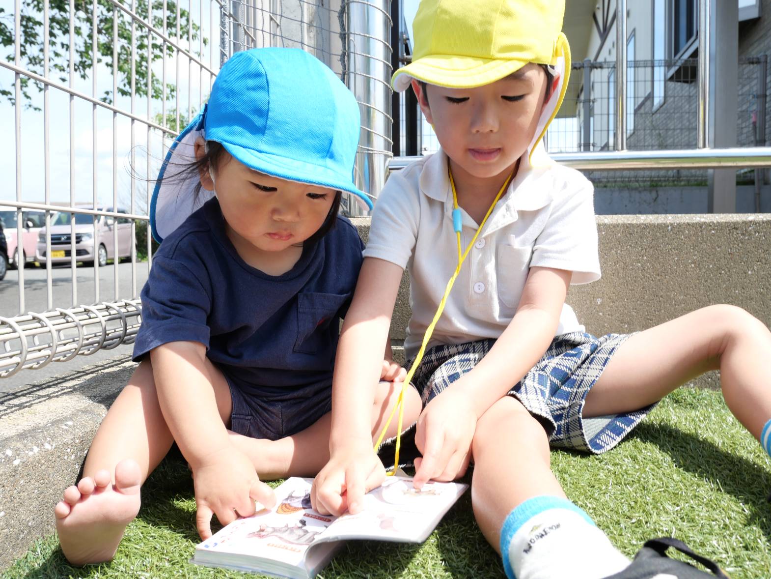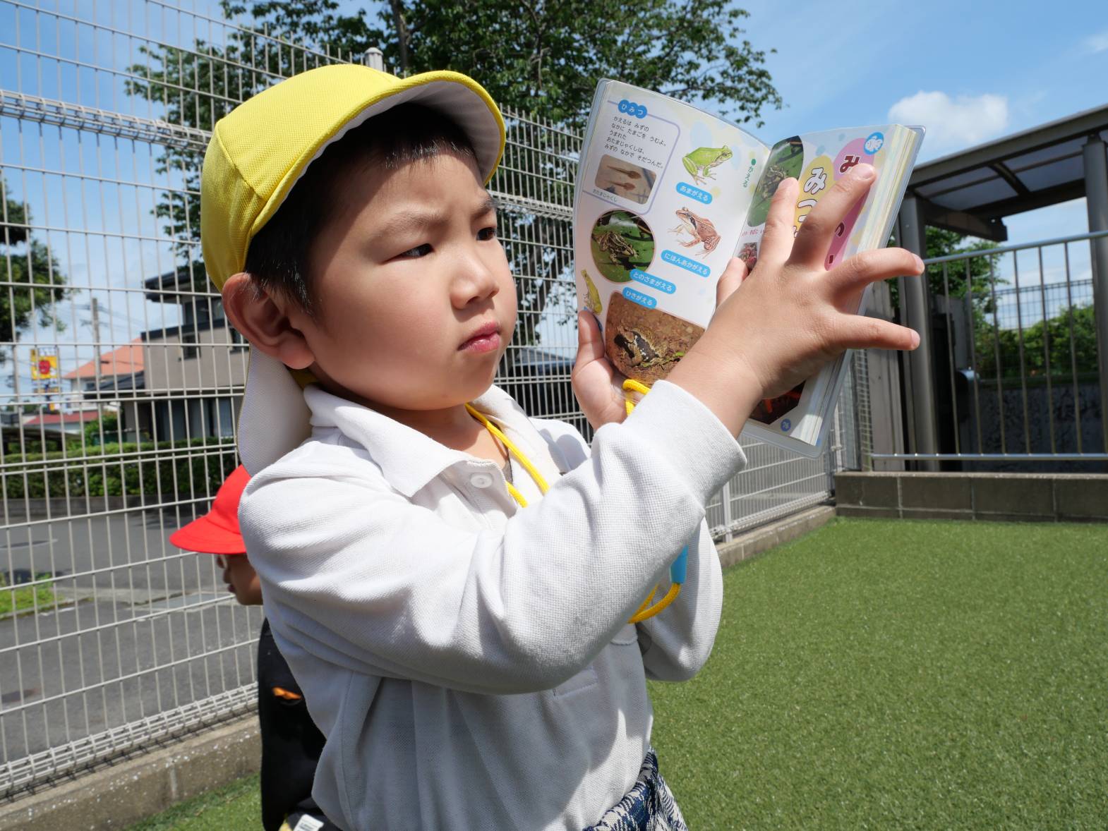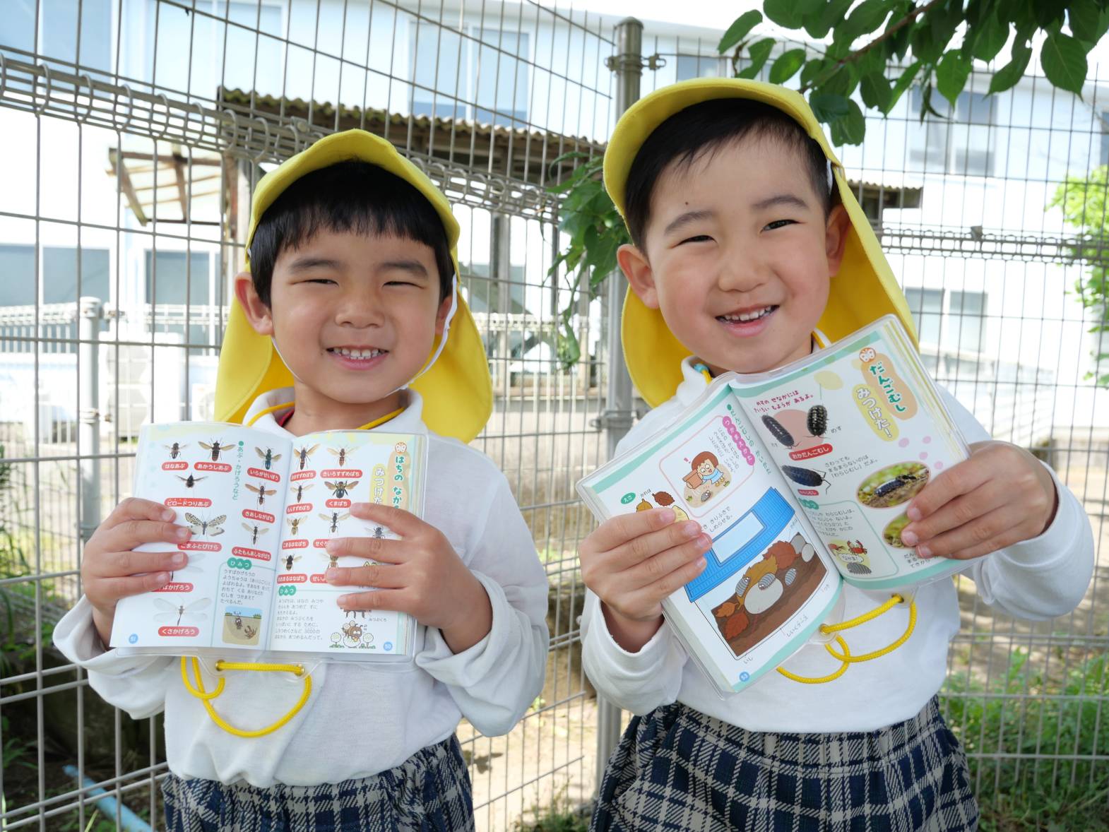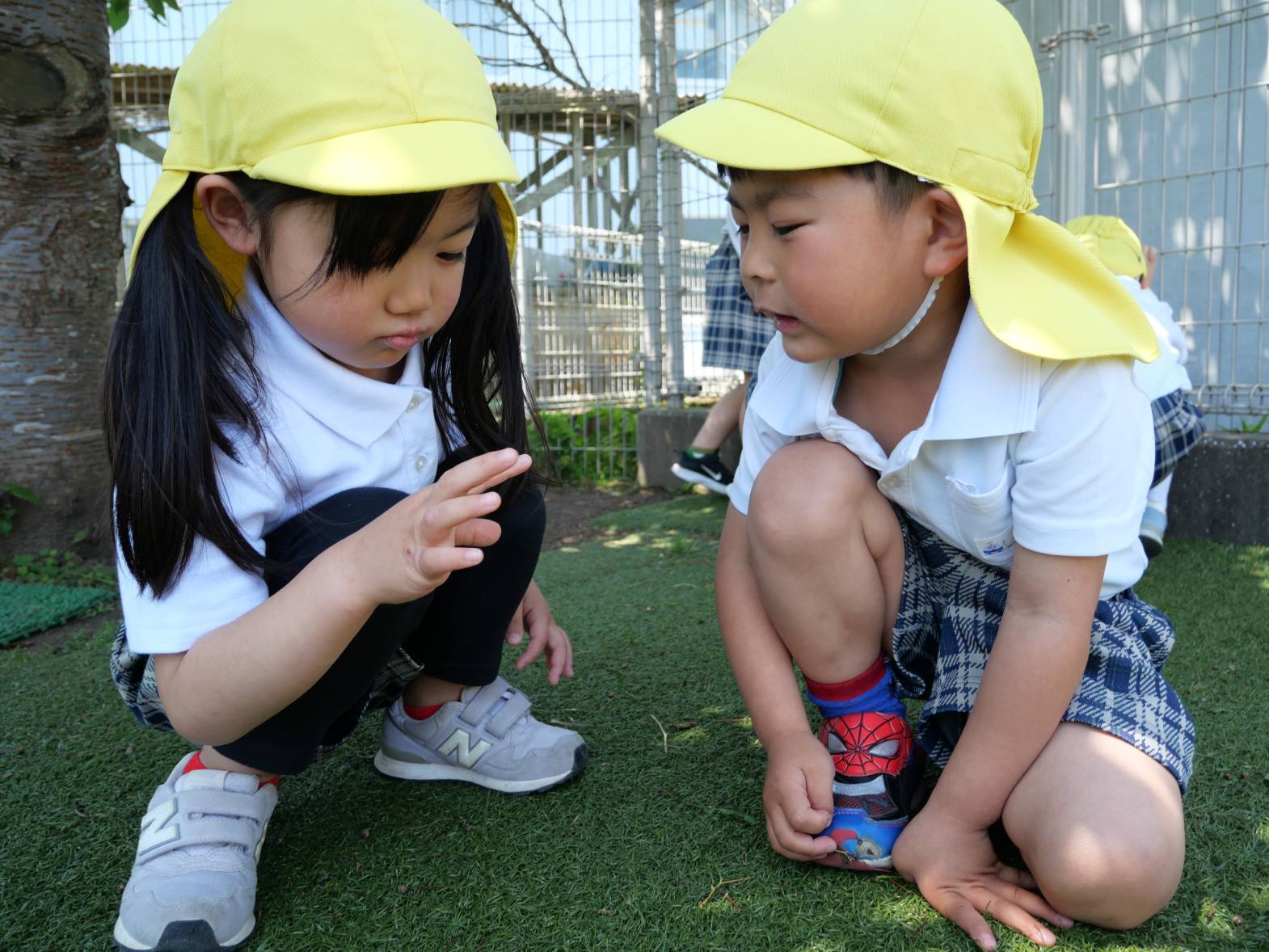 早速、図鑑を戸外へ持っていき、じっくりと観察をし始めます。「見て!図鑑に載っているダンゴムシさん見つけたよ!」、「図鑑と同じカマキリさんはいないかな?」と、大興奮の子どもたち!