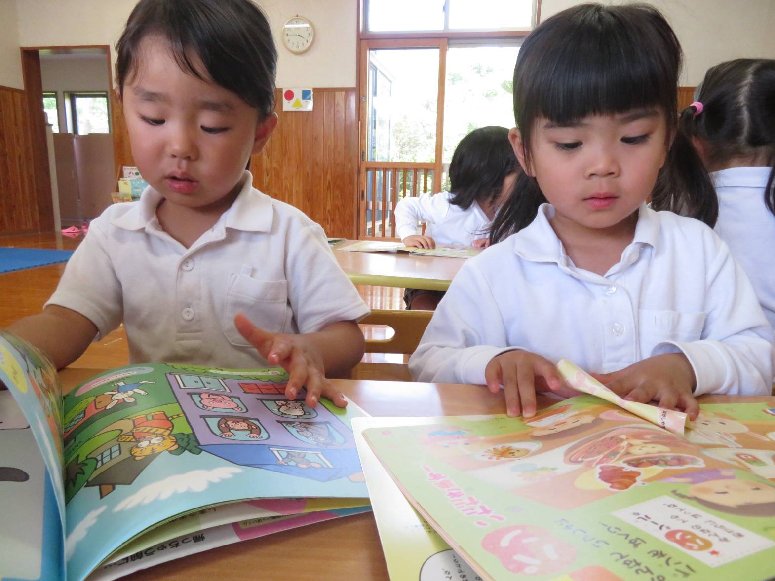 絵本を読むことが大好きなりす組さん。 絵本の時間には、「何見ようかな~!」、「○○ちゃん一緒に見る?」と、友だちと一緒に絵本を見たり、集中して読んだりする姿が見られます。 月刊絵本の中には、シールもあり、ペタペタとシールを貼ることを楽しむ姿が見られました! 今後も色々な絵本を提供していきたいと思います♪