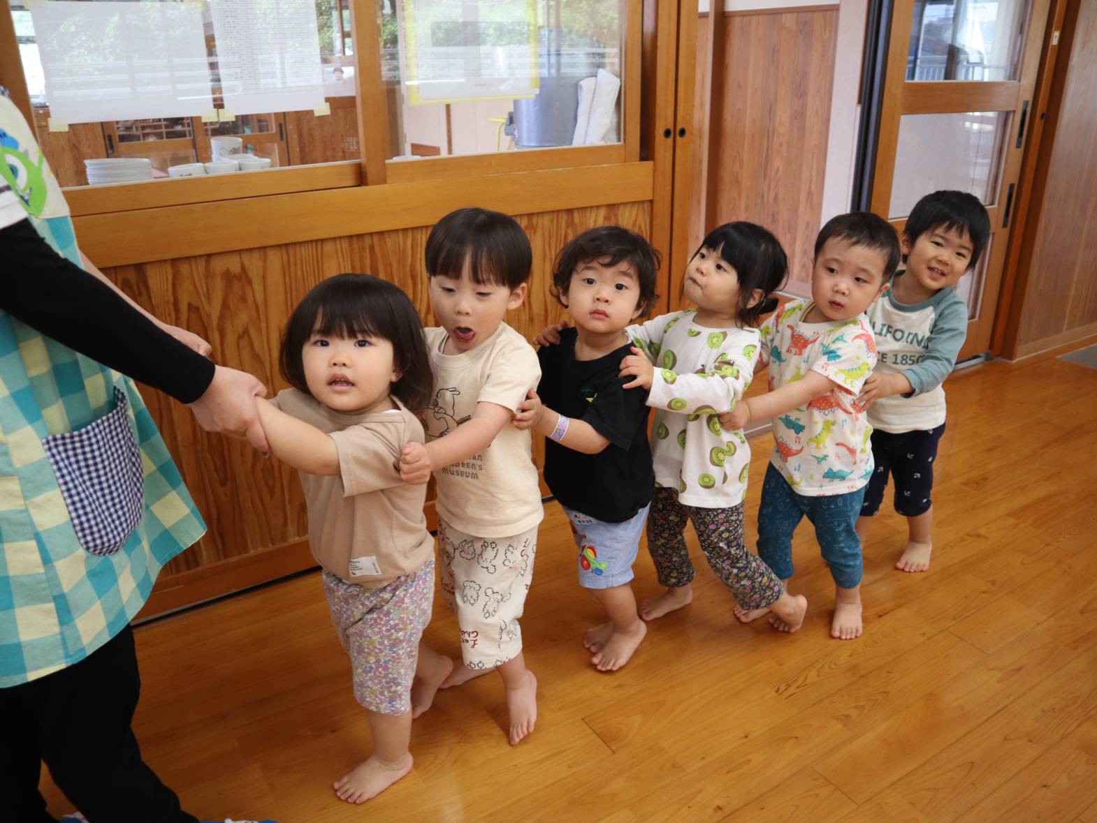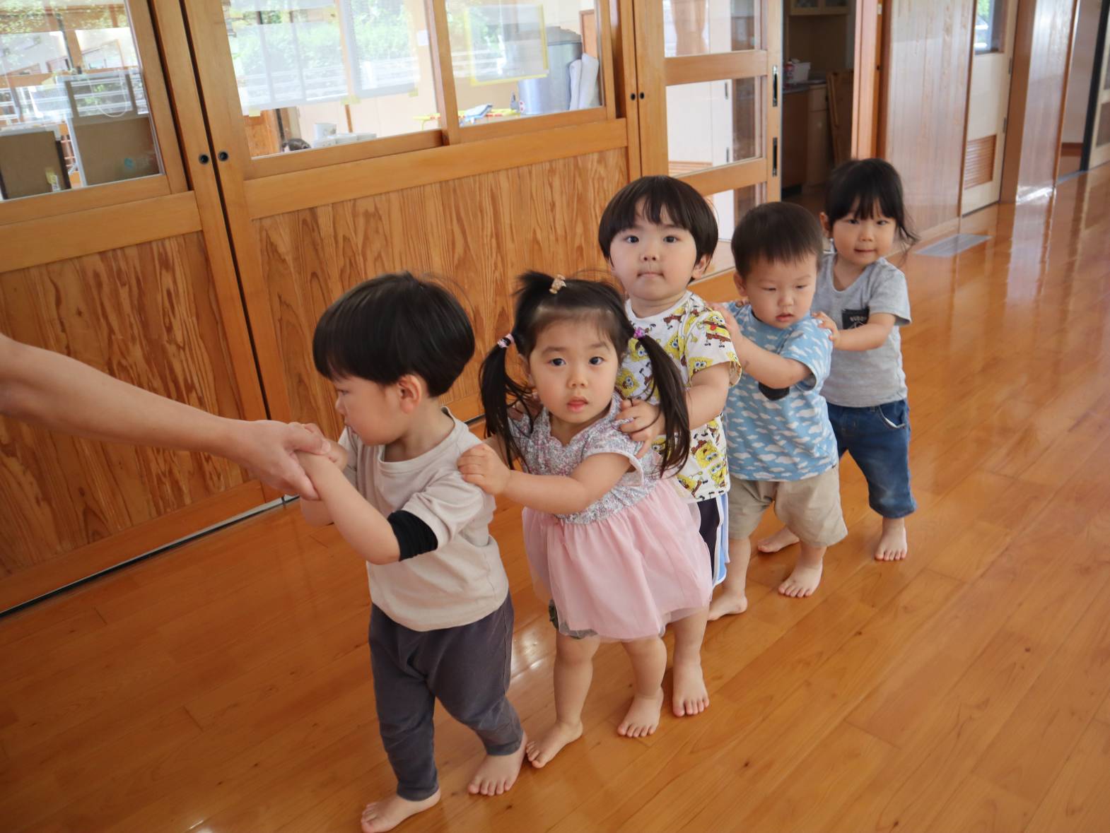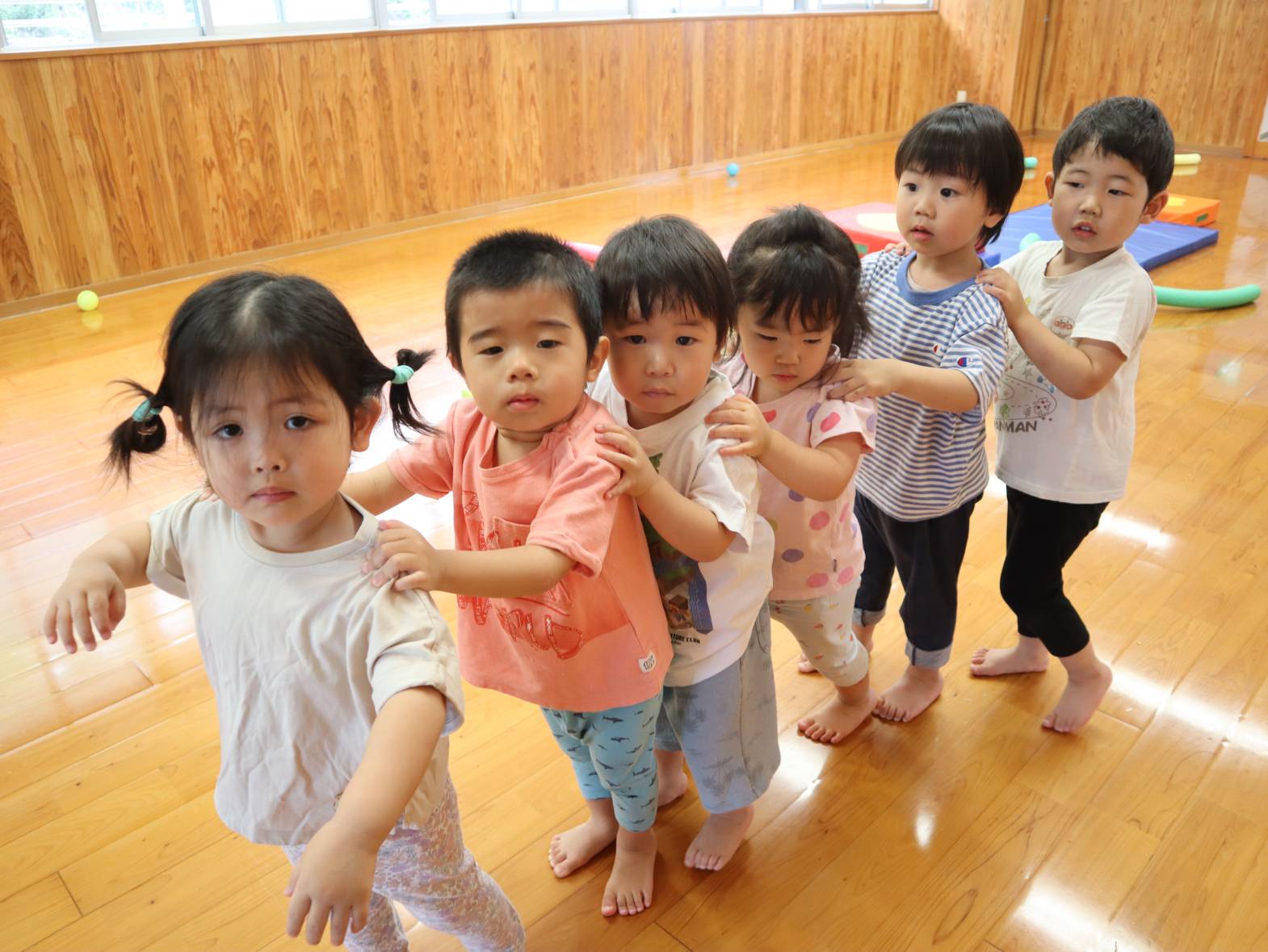 移動の時は電車になって移動しているぱんだ組さん。 「電車がっちゃん!」と言うと、すぐに友だちの肩に手を置いて列になる姿が見られます。 以前はすぐに手が離れてバラバラになることも多かったですが、 最後まで手を離さずしっかりとついてくることができるようになりました! 並んで順番に、が段々と定着している子どもたちです。