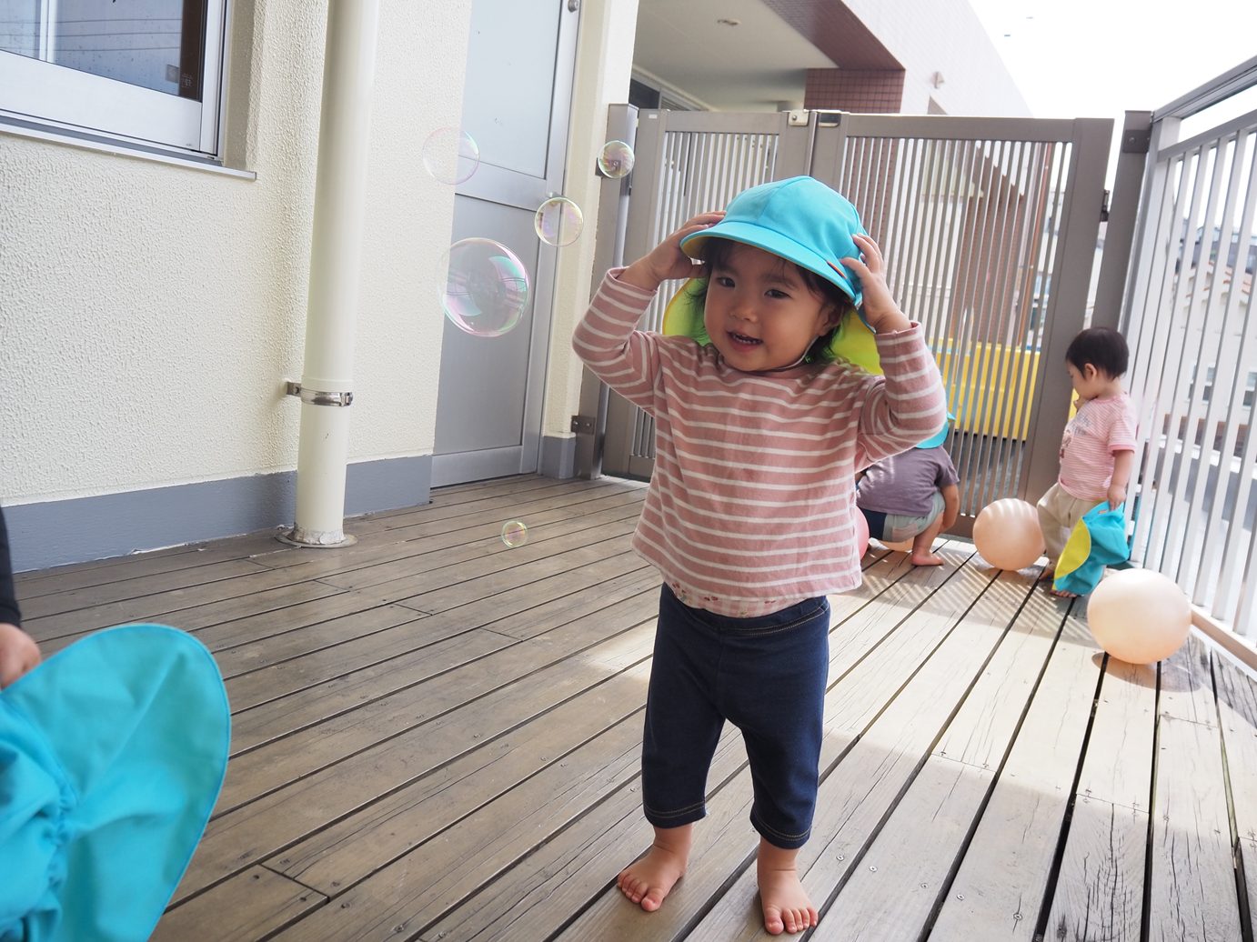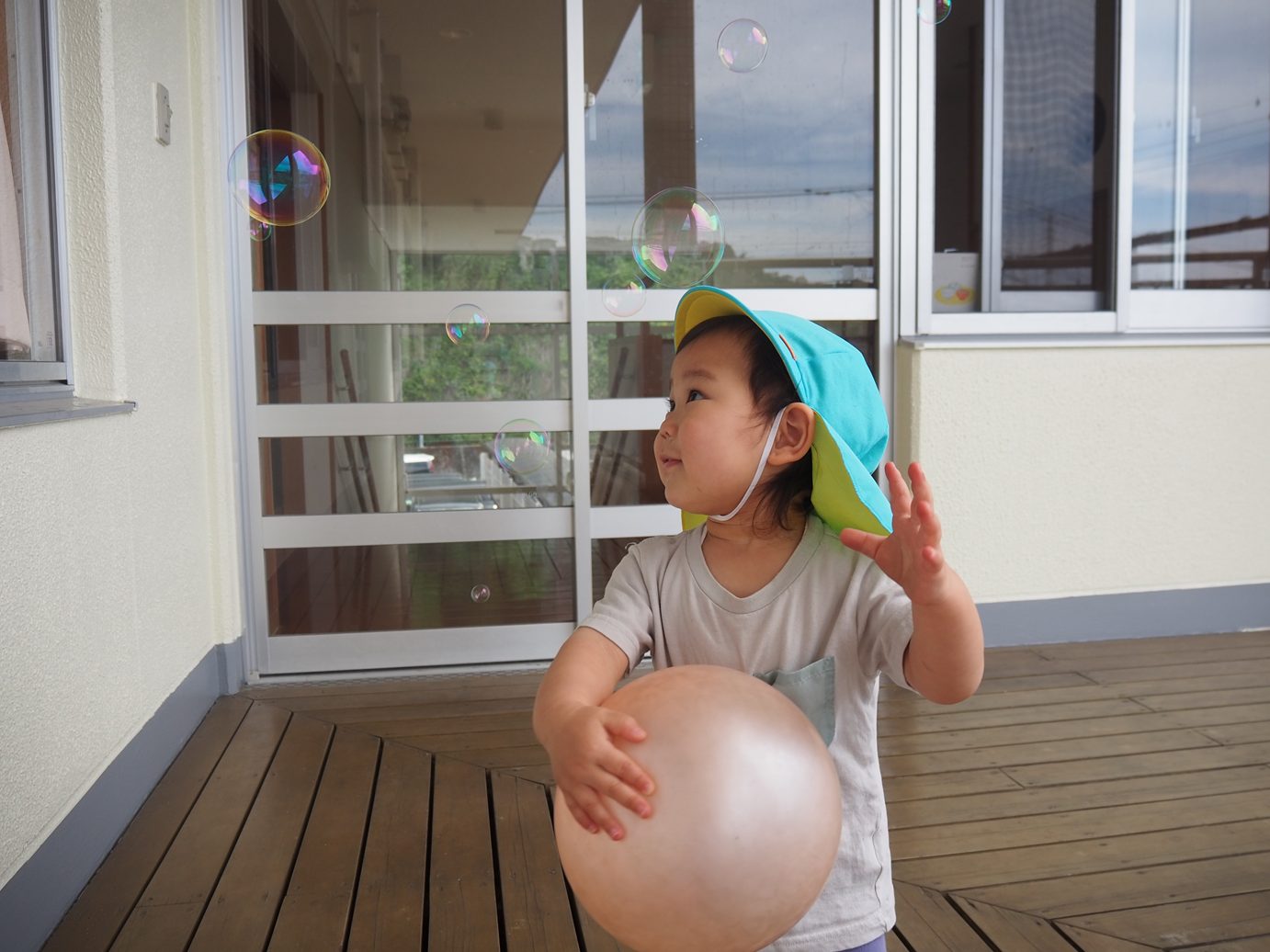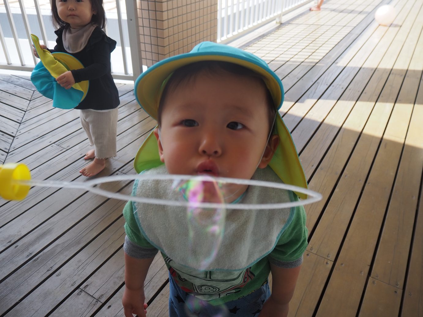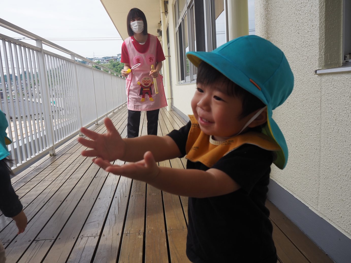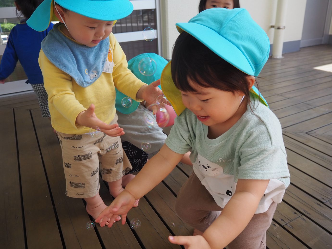 テラスに出れるようになり、元気いっぱいあそびこあら組さん。 しゃぼん玉遊びをしてみると、「わぁ~!」と嬉しそうな姿が見られました。 保育者が「ふぅ~!」としていると、真似をしたい子どもたち。唇を一生懸命尖らせて息を吹き込みます。 小さなしゃぼん玉が1個出たり、コツを掴むとたくさんでたりと何度も挑戦する姿が見られました。 しゃぼん玉を追いかけ、消えていくテラスの間などを「あれ?」と不思議そうにのぞいて見る子どもたちでした。