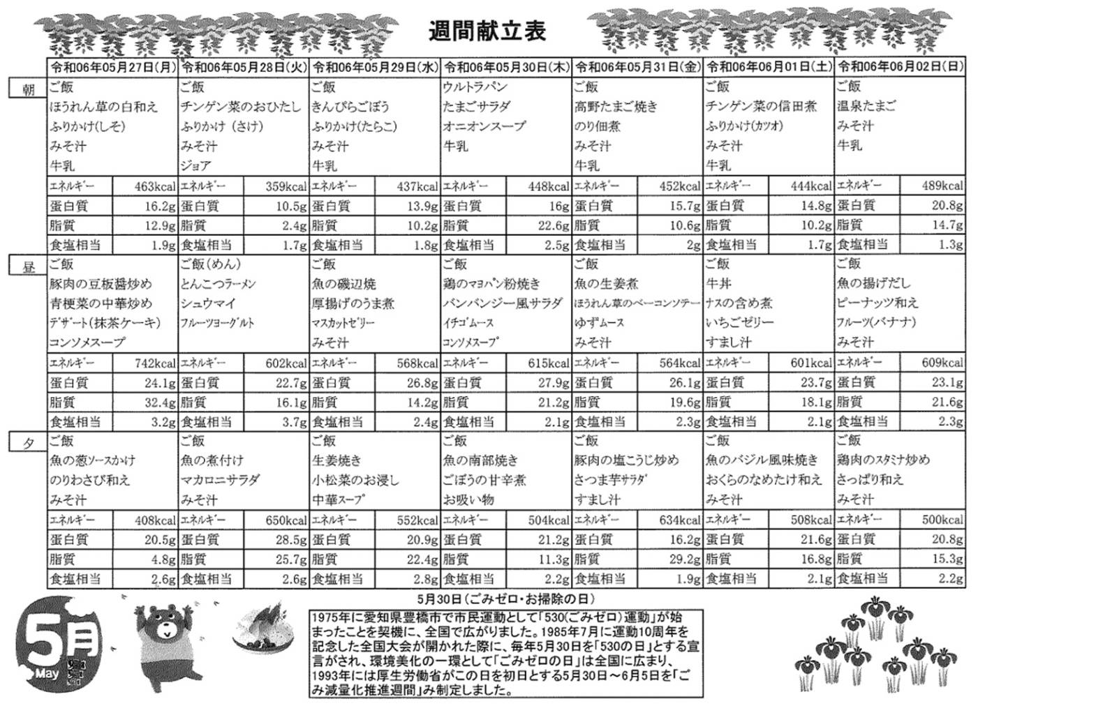 5月27日(月)~6月2日(日)の献立表になります。是非ご覧ください。