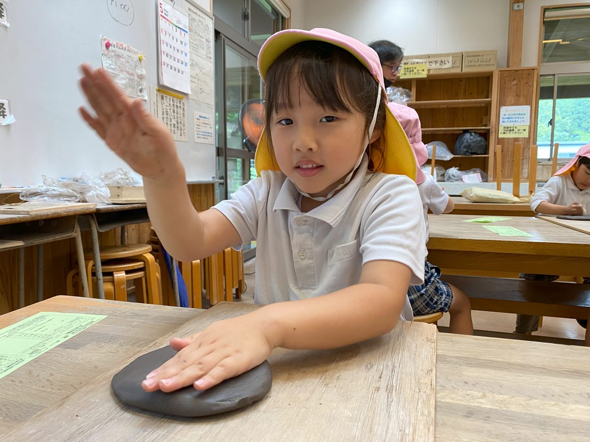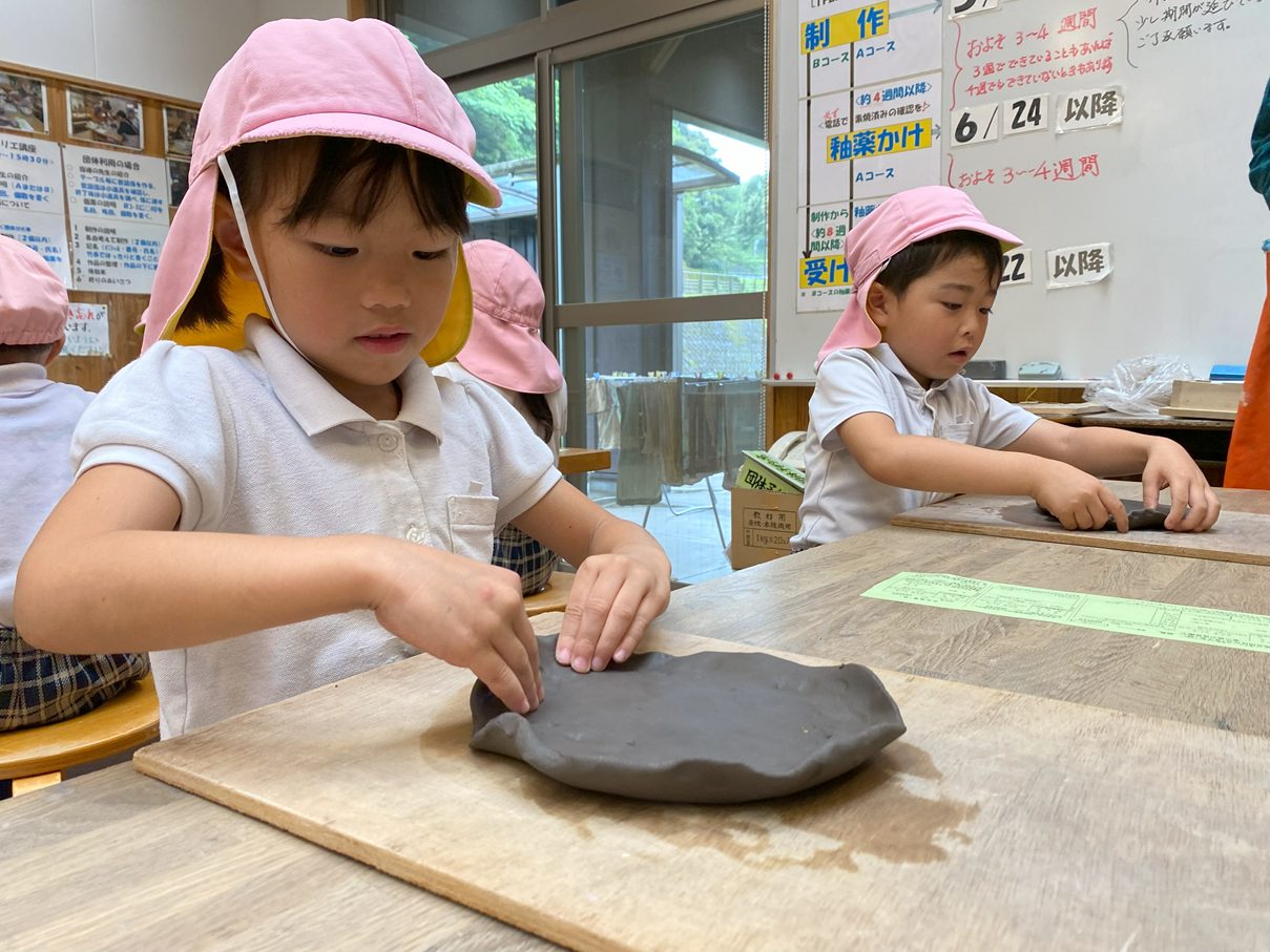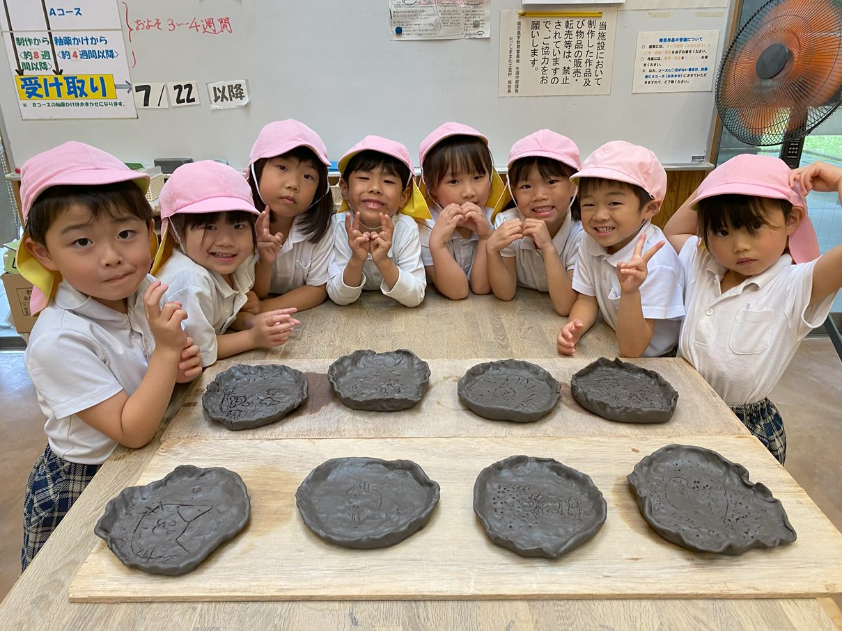 今週は鹿児島文化工芸村へ行き、陶芸活動をしました。 粘土をこねたり、叩いたりしながら、皿の形に造形していきます。 「ちょっと固い!」、「楽しいね!」と粘土の感触を楽しむ子どもたち。 「うさぎ描いたんだ!」と皿に好きな絵や模様を描き、完成が待ち遠しいきりん組さんです。