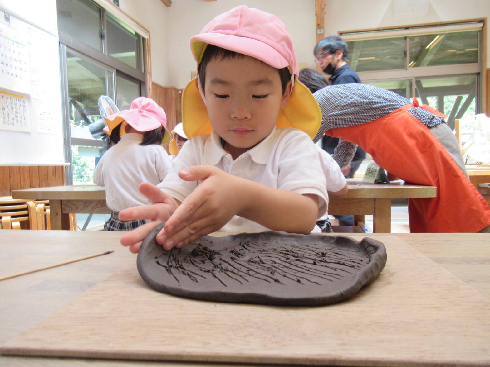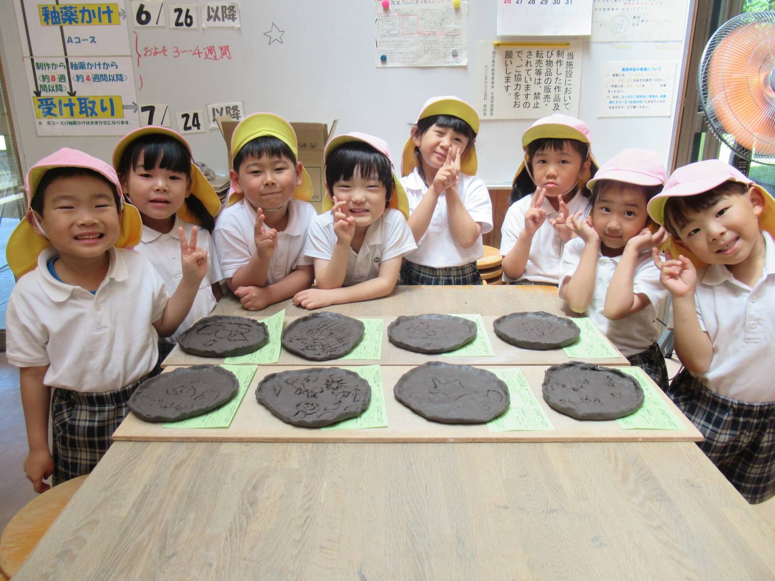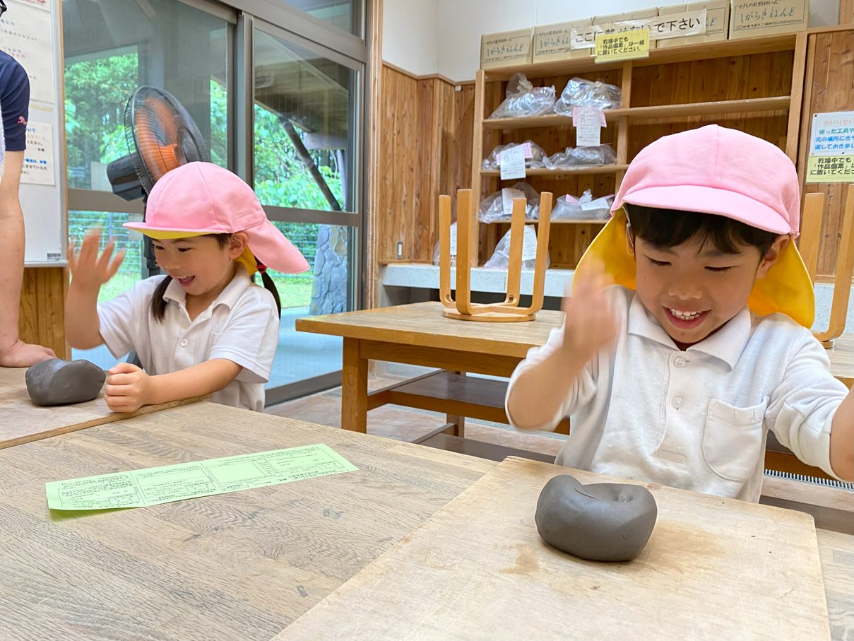 今週は鹿児島文化工芸村へ行き、陶芸活動をしました。 粘土をこねたり、叩いたりしながら、皿の形に造形していきます。 「ちょっと固い!」、「楽しいね!」と粘土の感触を楽しむ子どもたち。 「うさぎ描いたんだ!」と皿に好きな絵や模様を描き、完成が待ち遠しいきりん組さんです。