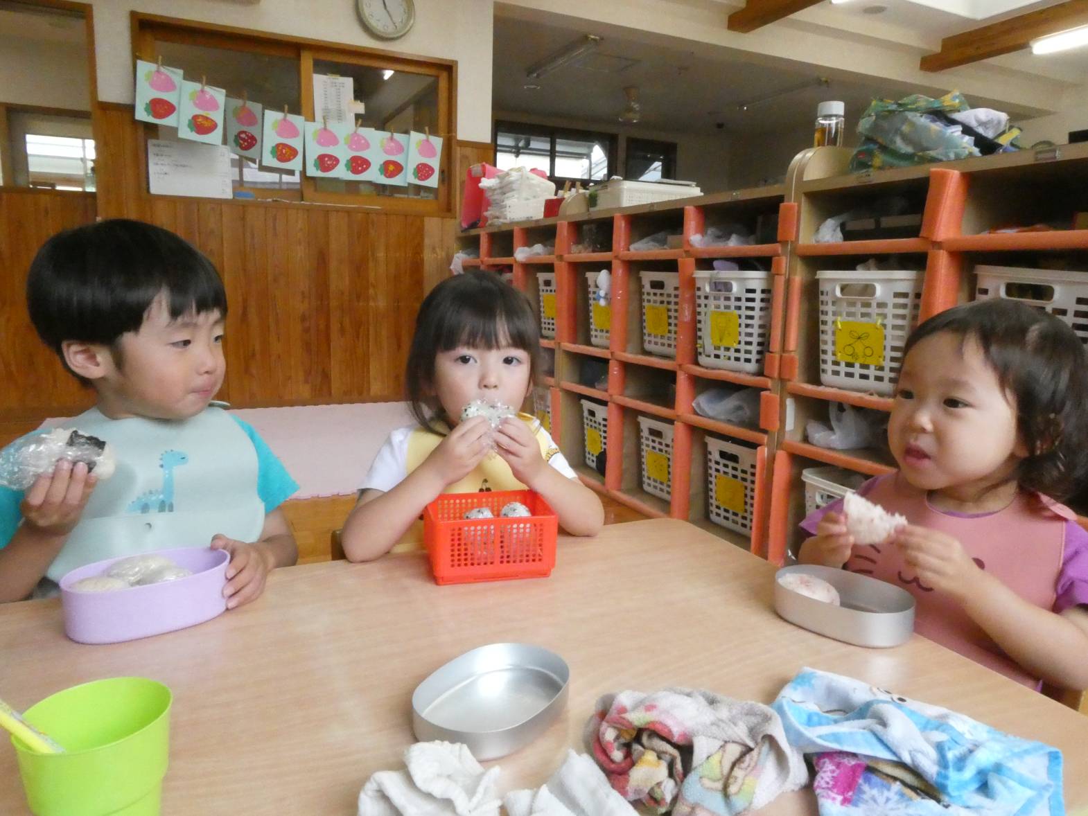 昨日は、子どもたちが楽しみにしていたおむすびの日でした! 新聞紙遊びを思う存分楽しんだ子どもたち。 いっぱい体を動かした後は、おむすびの時間です。 ‘‘いただきます‘‘の挨拶をすると、おむすびを持って口に頬張る子どもたち。 「美味しいね。」、「おむすび3個入ってたよ!」と、保育者に嬉しそうに教えてくれました。 弁当箱が空っぽになり、大満足のぱんだ組さんでした。