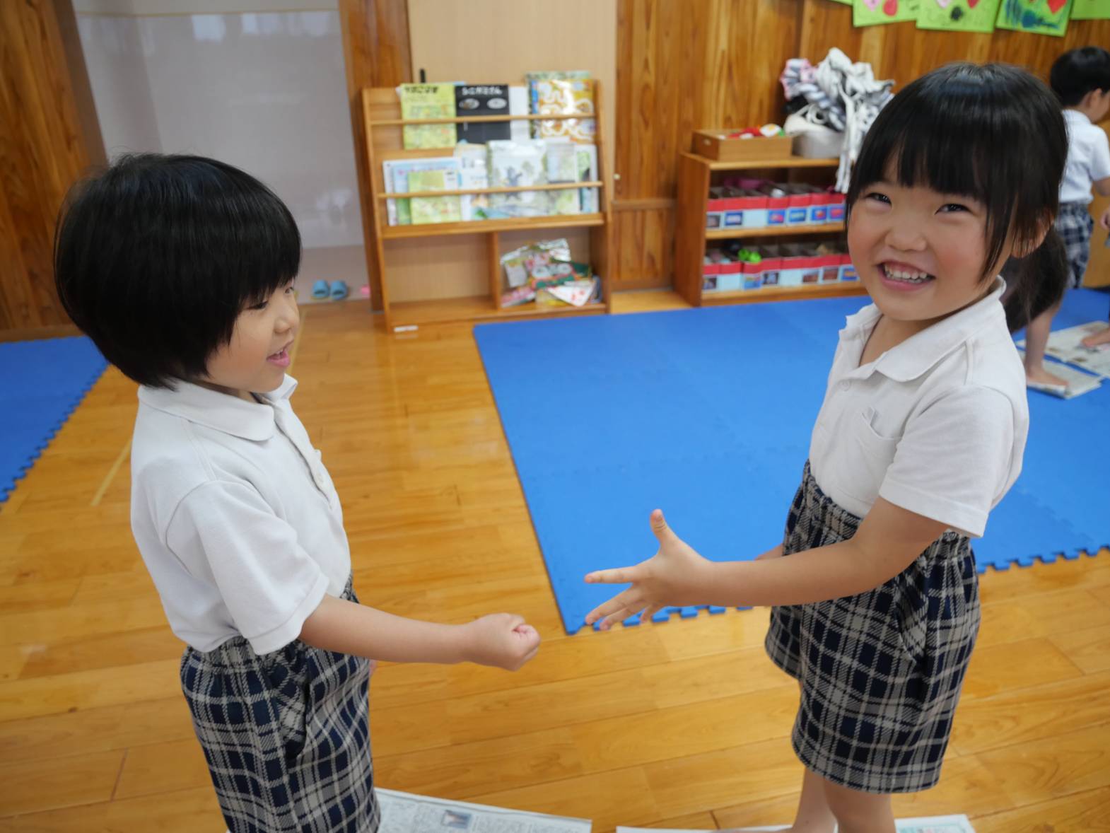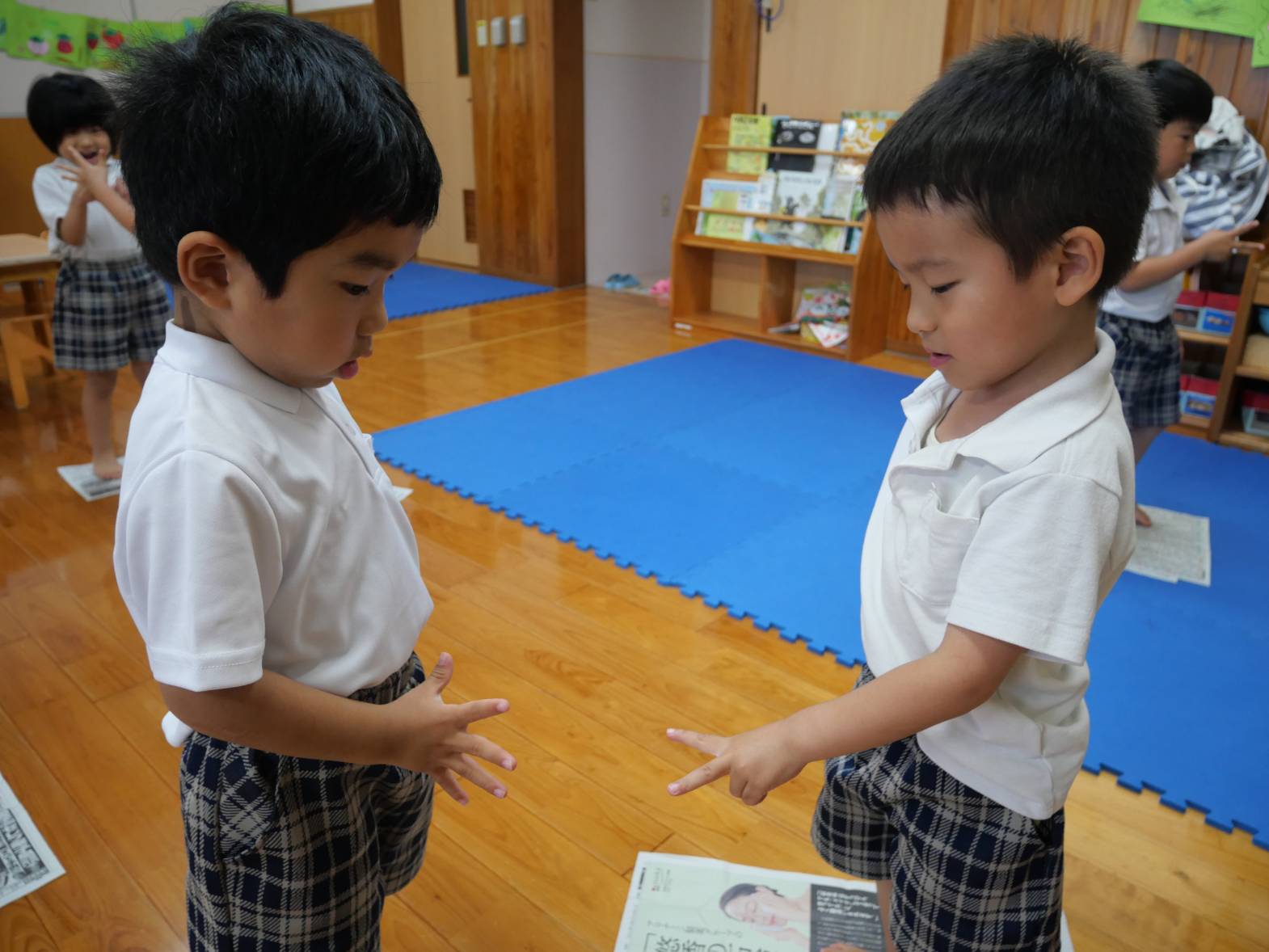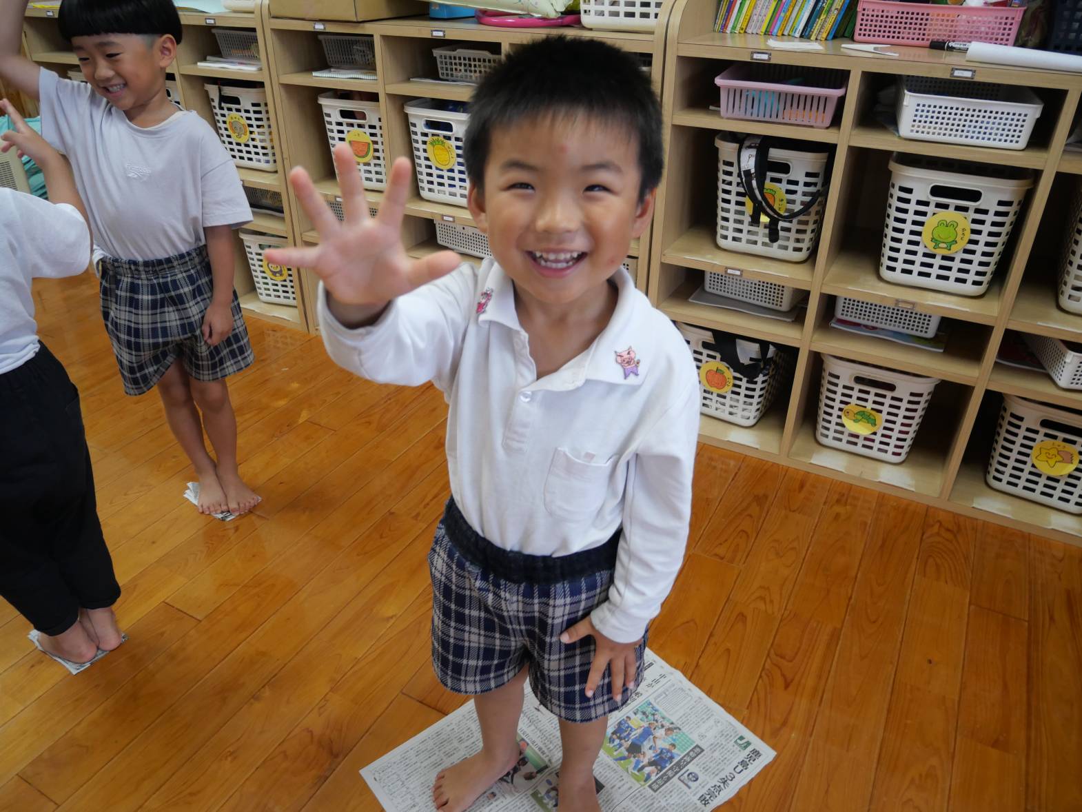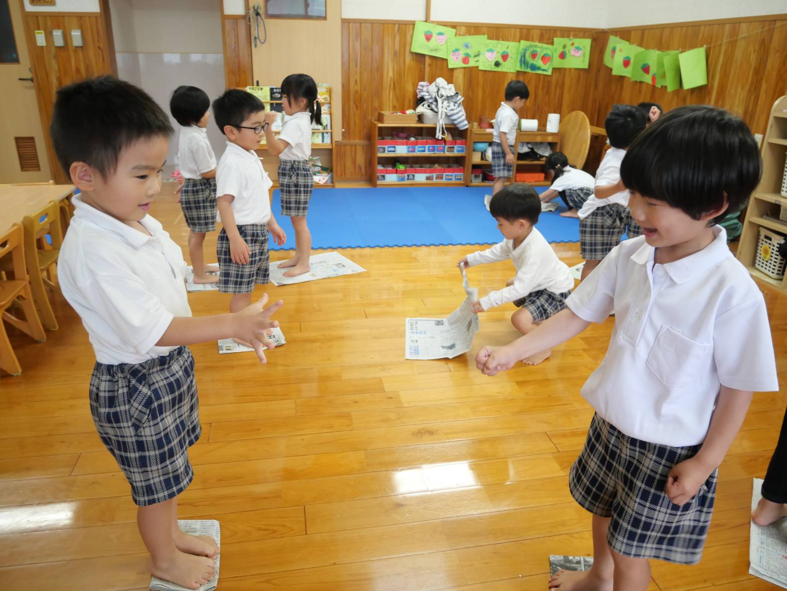 「僕4回もジャンケンに勝ったよ!」、「新聞紙が小さくなったから落ちちゃった。」と、新聞紙ジャンケンを楽しむことができた子どもたち!