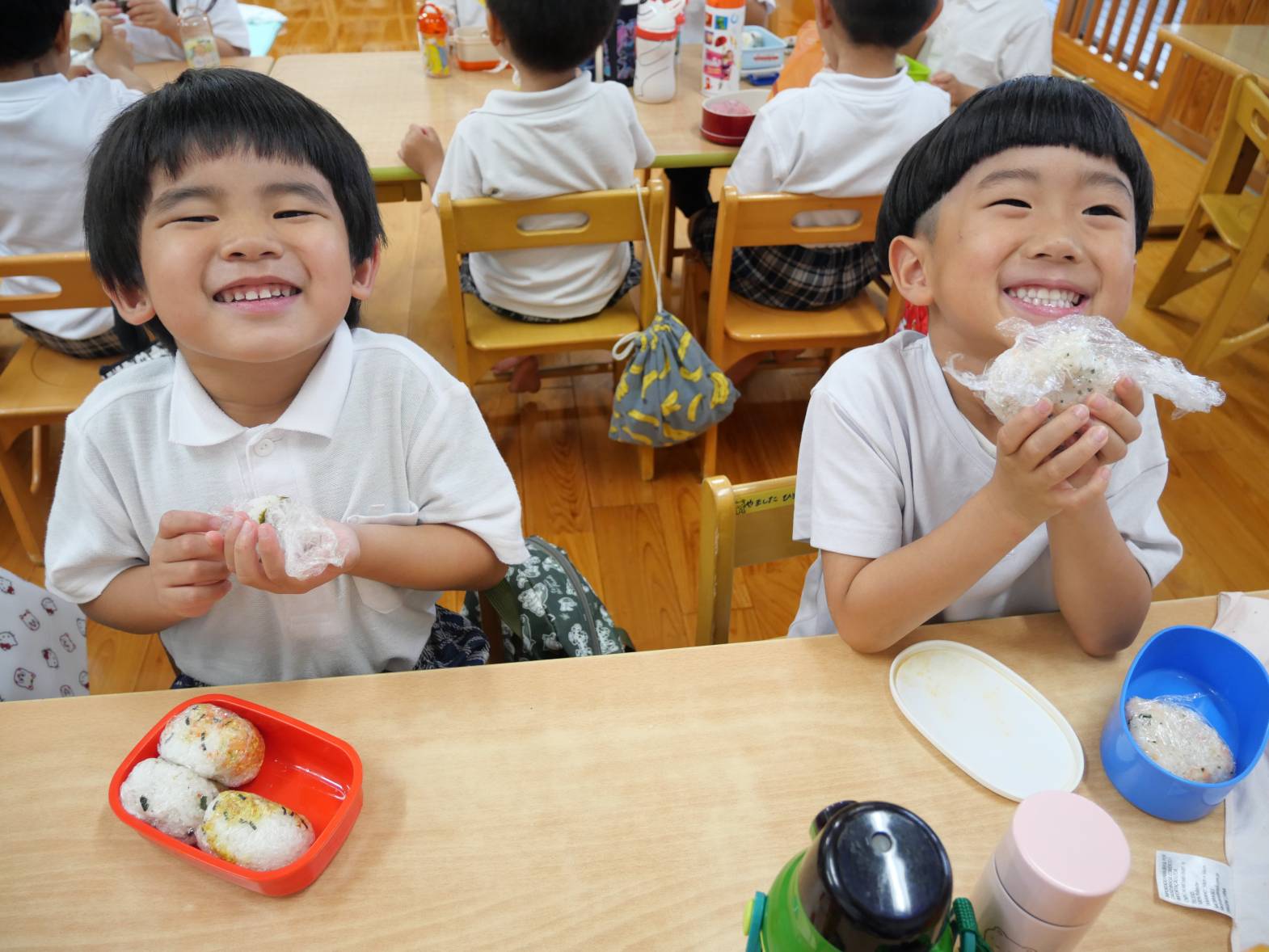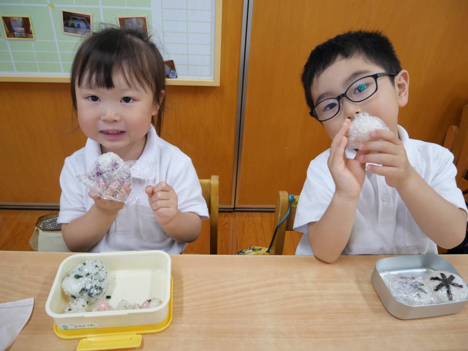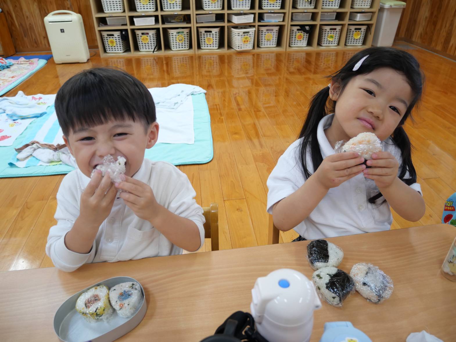 「みんなで食べるおむすびはおいしいね。」、「次のおむすびの日は、天気が良かったらお外で食べよう!」と会話を弾ませながらおいしいおむすびを食べることができ、大満足のうさぎ組さんでした♪