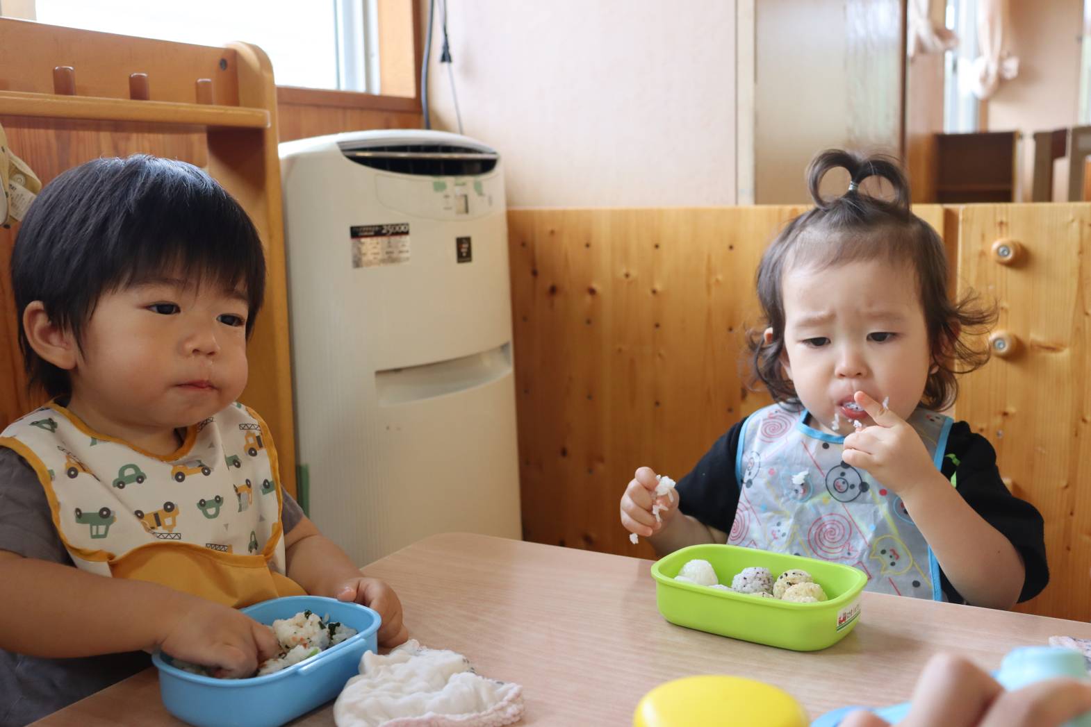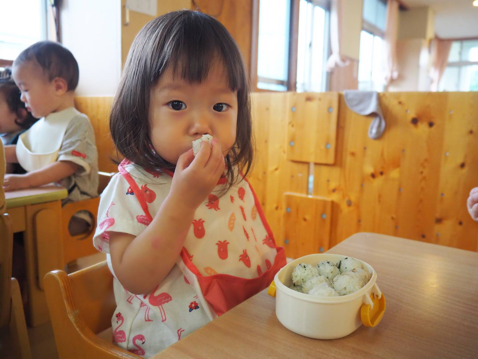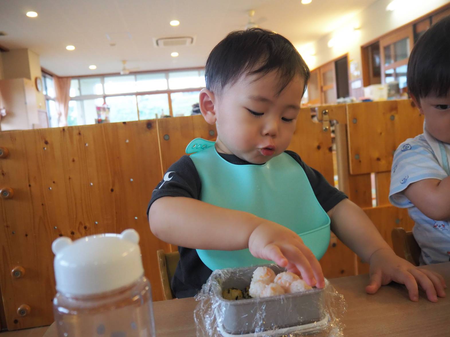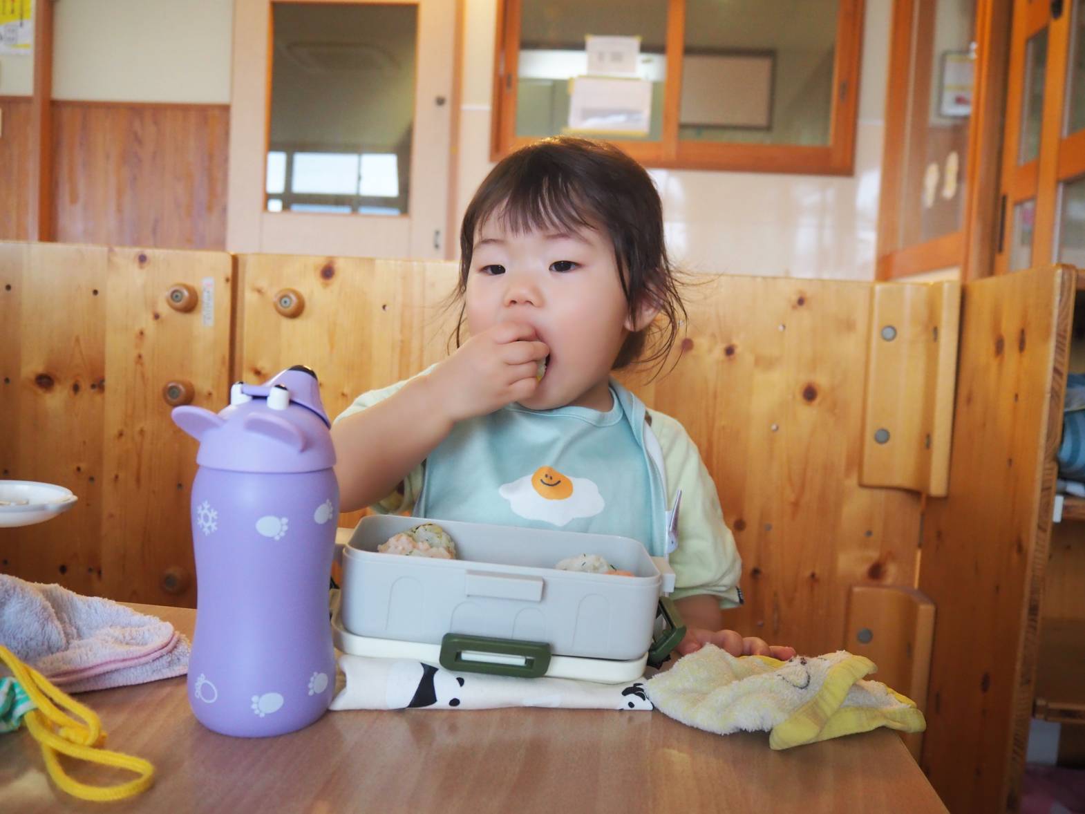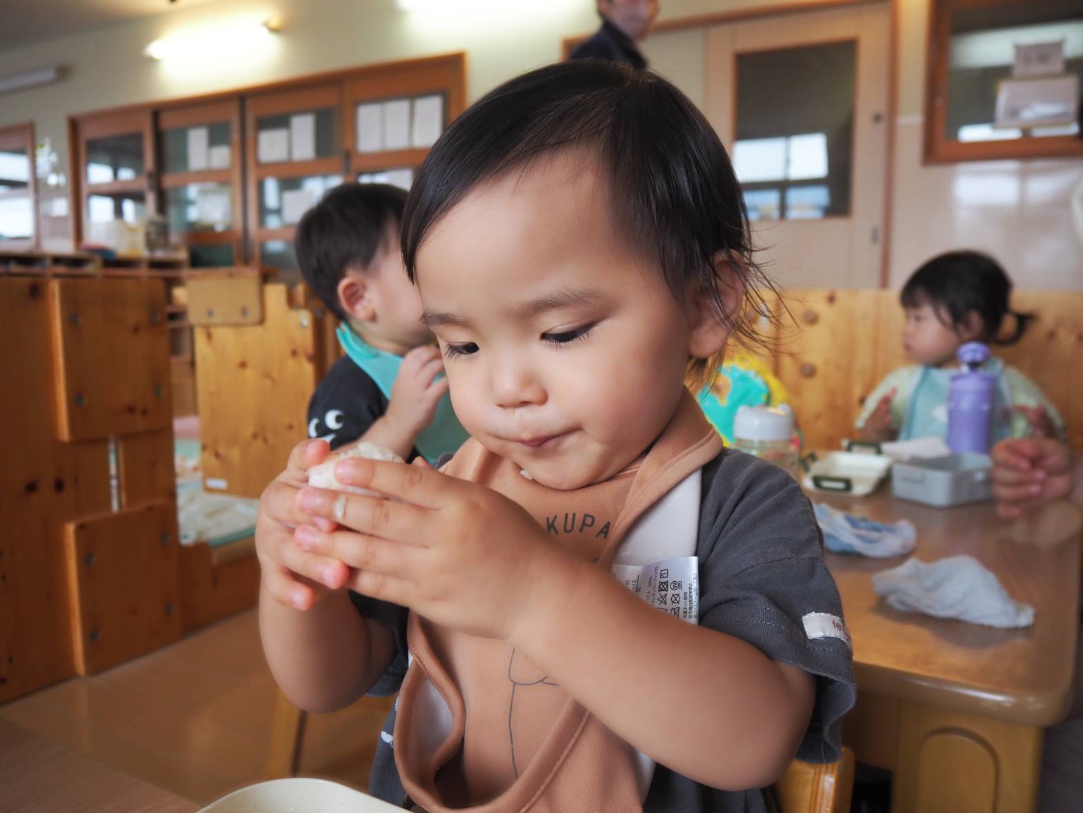 今日は、子どもたちが大好きなおむすびの日でした! エプロンを付けて、弁当箱の蓋を開けると、「わあ!」 と、嬉しそうな声をあげる、こあら組さん。 「いただきます!」と、手を合わせると、早速パクパクを食べ進めていきました。 「おいしい!」と聞くと、嬉しそうに頷き、夢中で食べ、あっという間に食べ終わります。 大好きなおむすびを食べ、大満足な様子のこあら組さん。 おむすびのご準備ありがとうございました!
