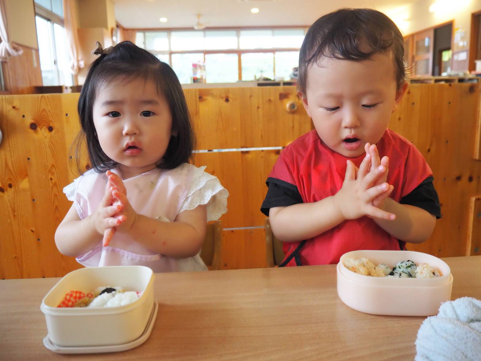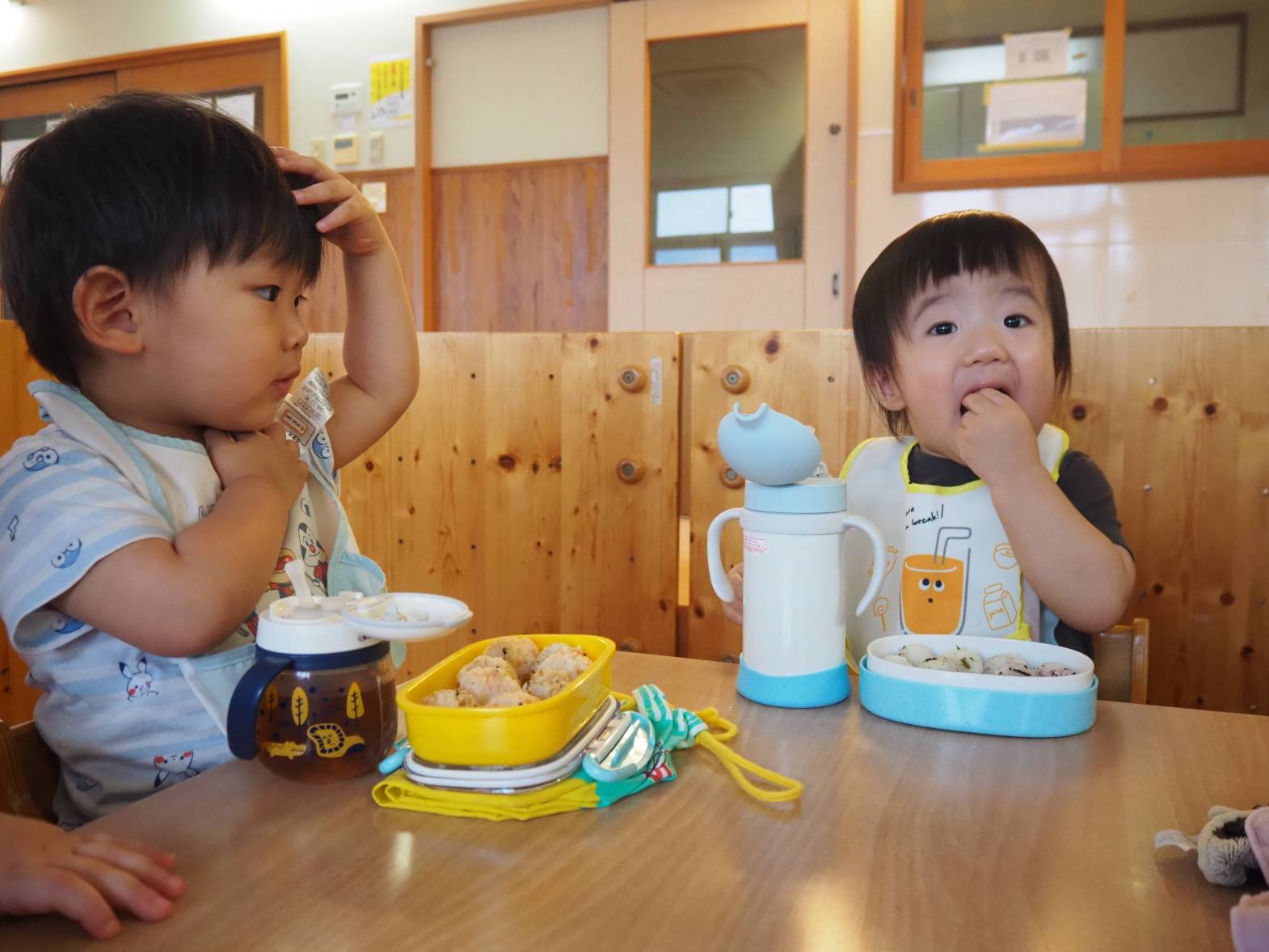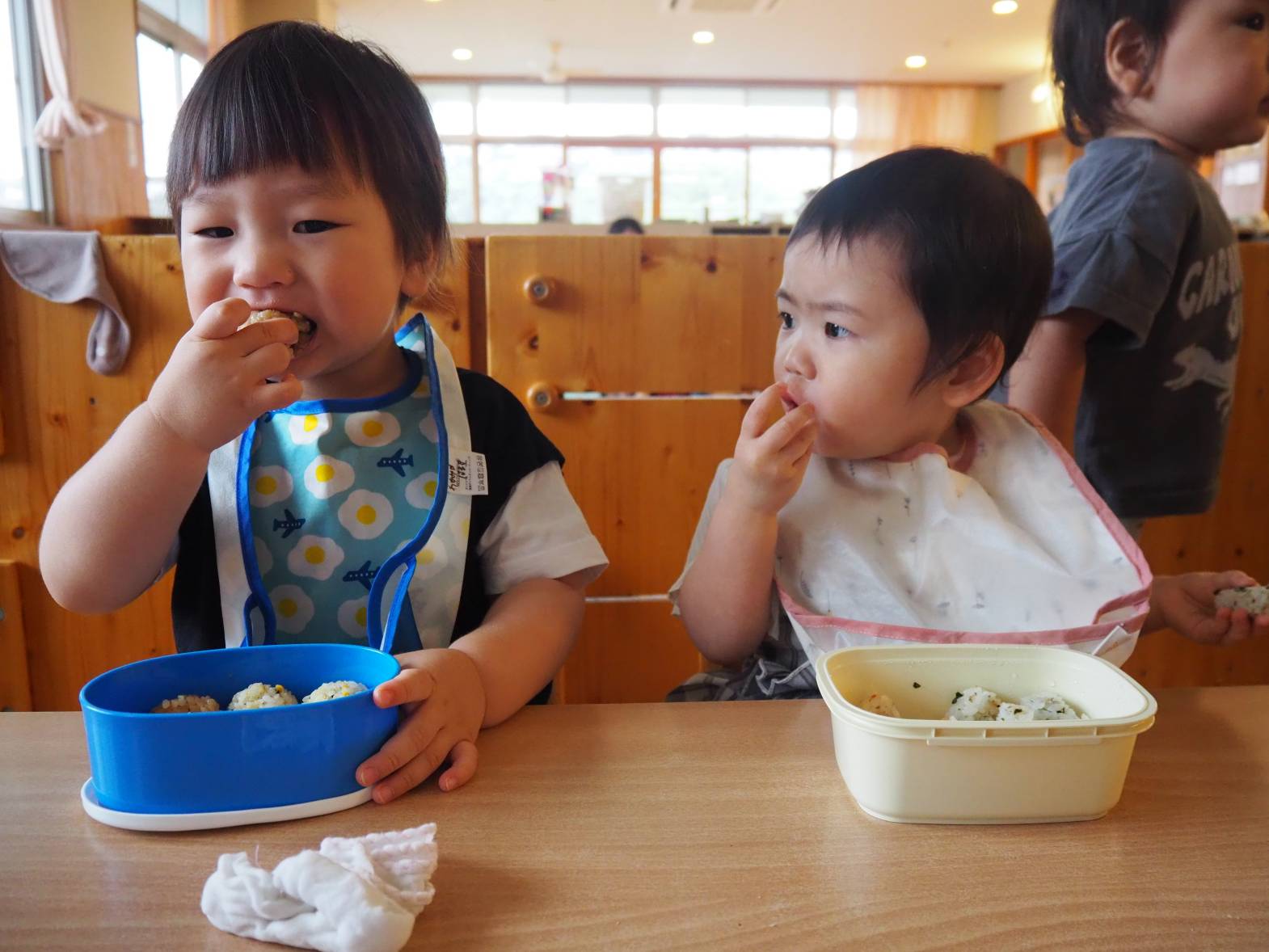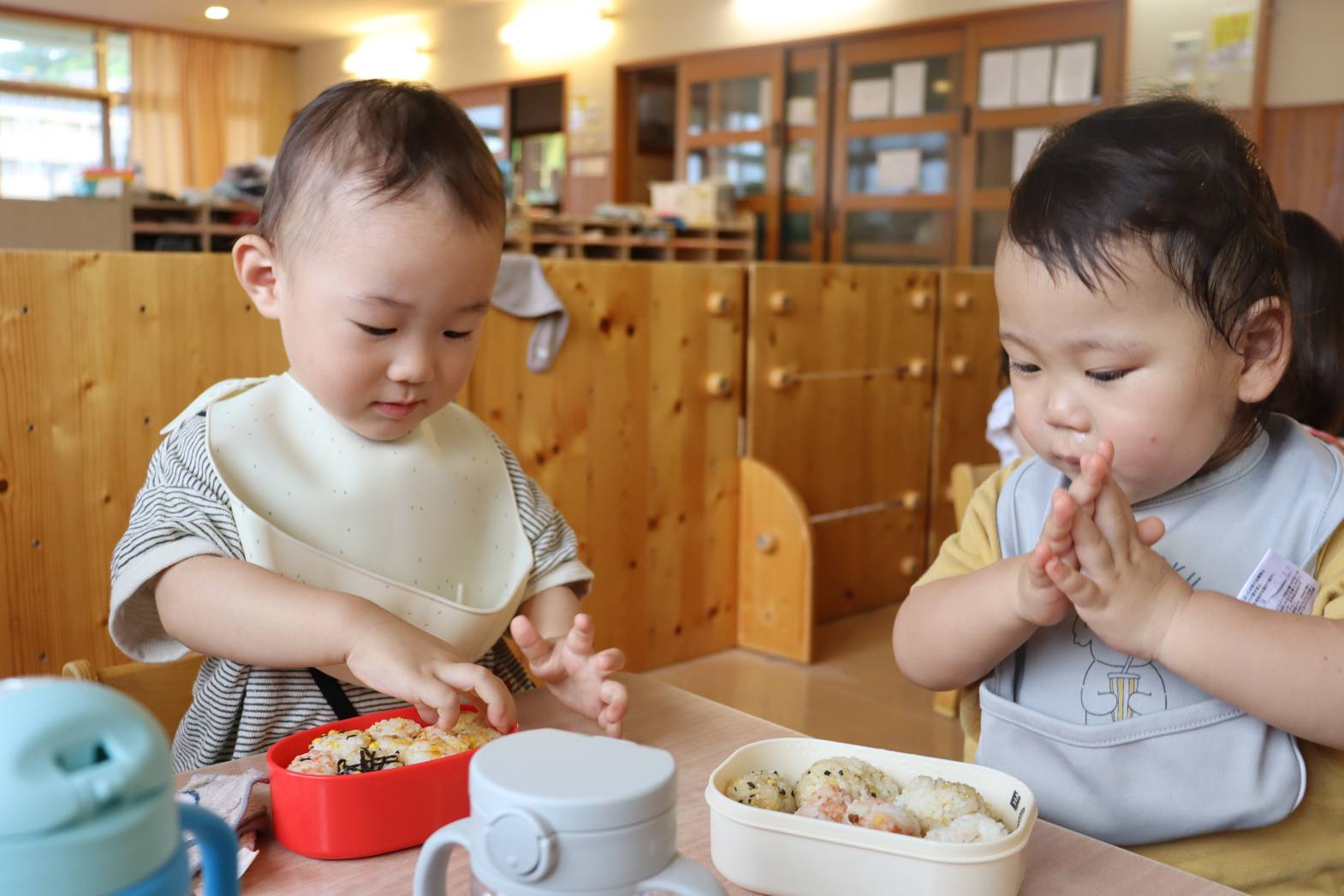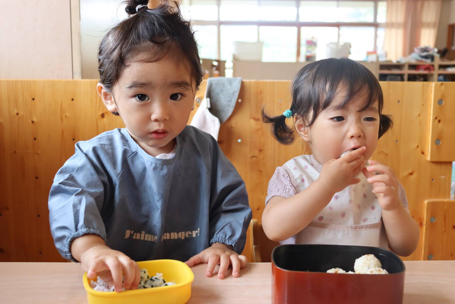今日は、子どもたちが大好きなおむすびの日でした! エプロンを付けて、弁当箱の蓋を開けると、「わあ!」 と、嬉しそうな声をあげる、こあら組さん。 「いただきます!」と、手を合わせると、早速パクパクを食べ進めていきました。 「おいしい!」と聞くと、嬉しそうに頷き、夢中で食べ、あっという間に食べ終わります。 大好きなおむすびを食べ、大満足な様子のこあら組さん。 おむすびのご準備ありがとうございました!