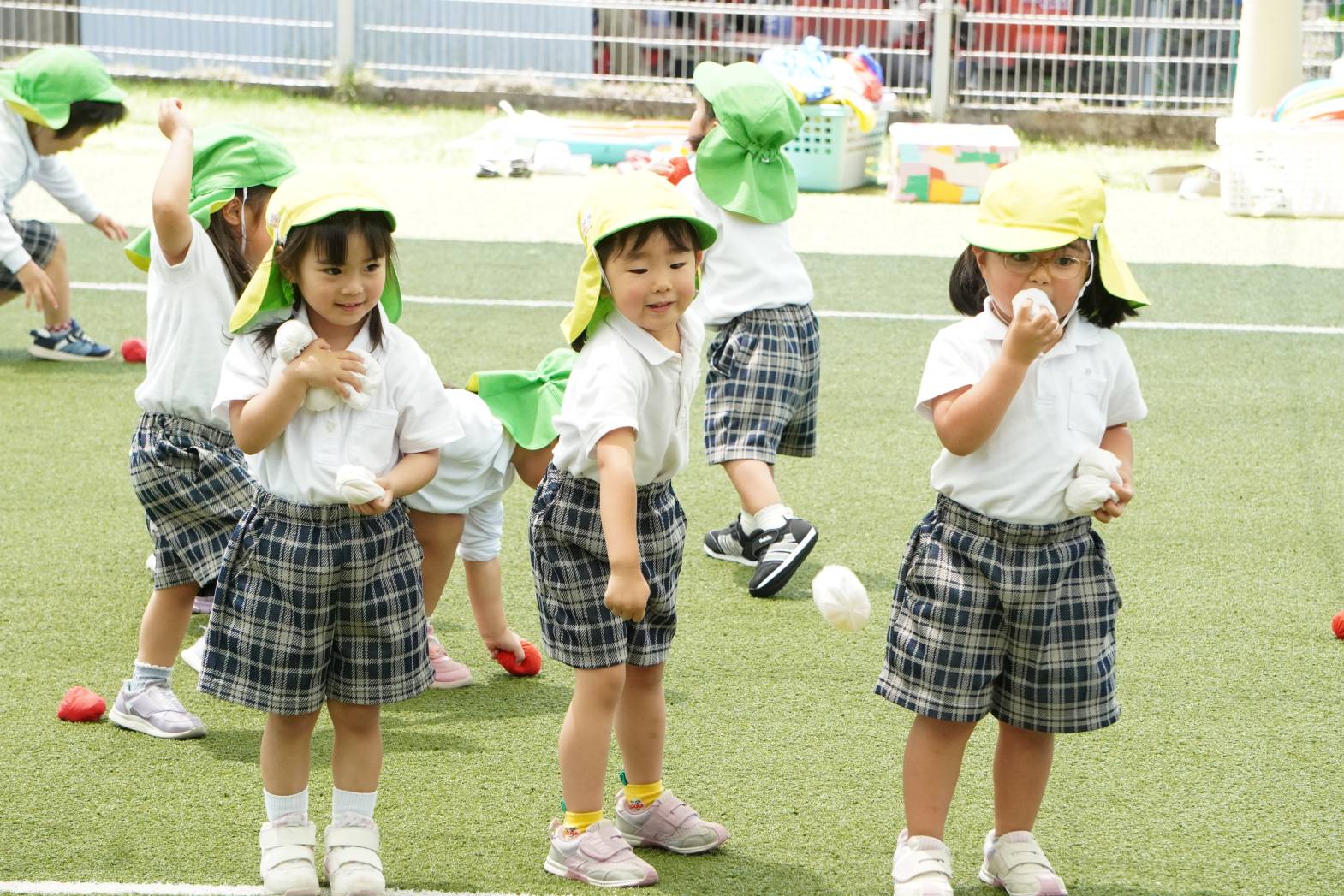 玉入れでは、お手玉をたくさん集めて桶に向かって「えい!」と一生懸命投げる子どもたち。