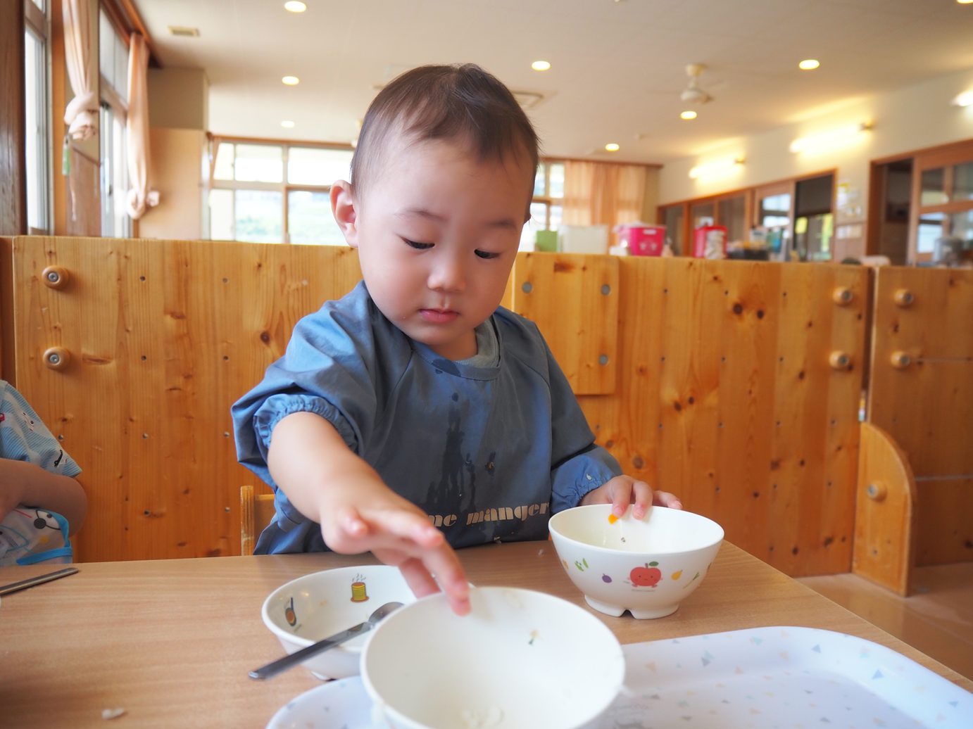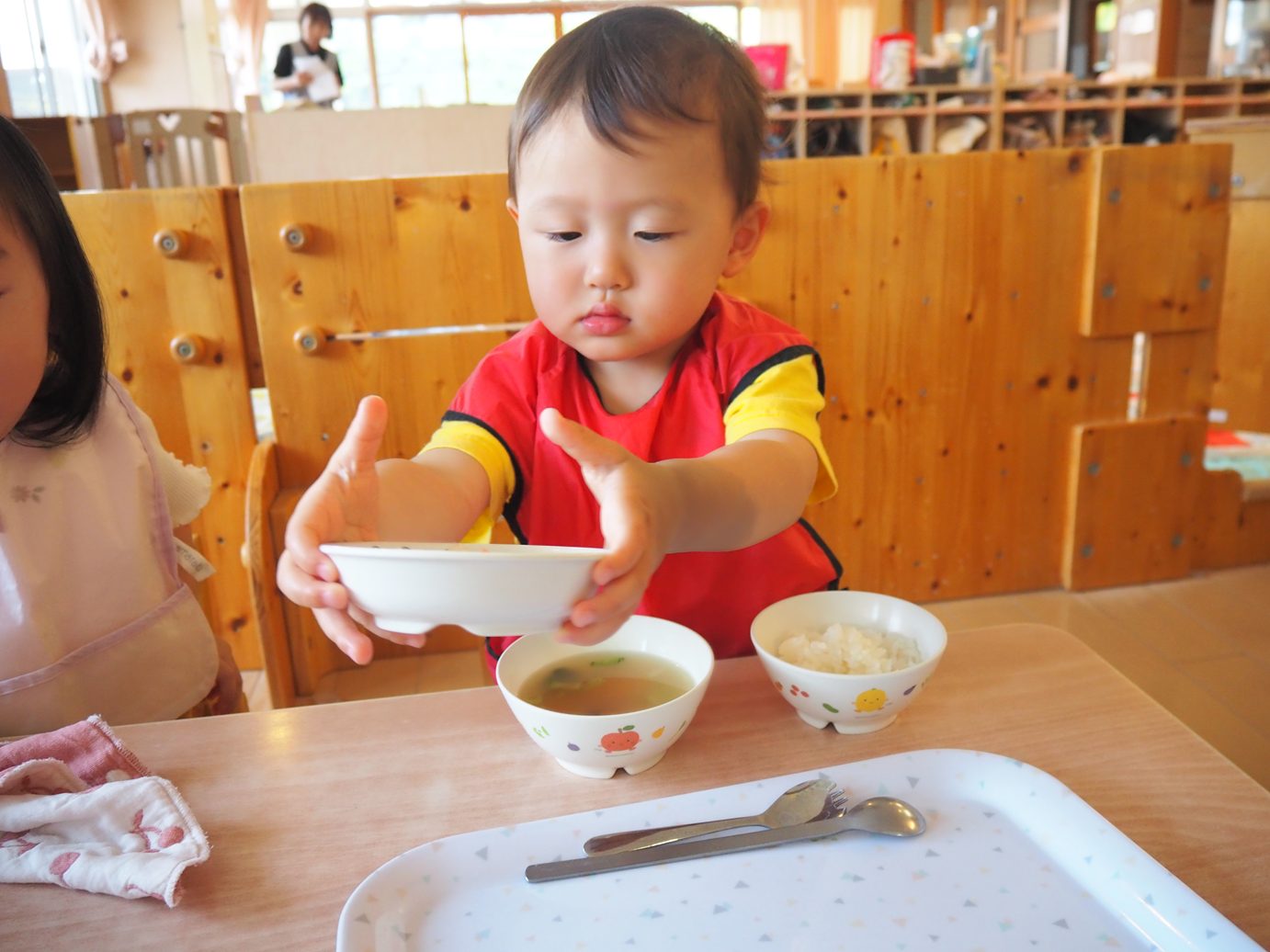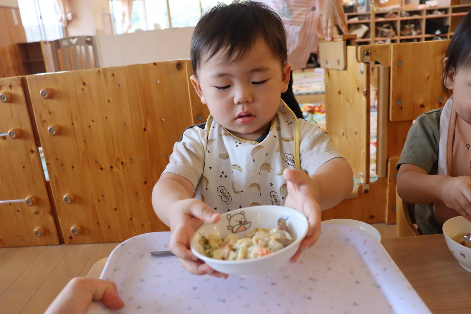たくさん体を動かした後は、給食の時間です。手や口を拭き、消毒したら準備は万端! こあら組さんでは、お盆に乗せた皿を両手でご飯、お汁、おかずの順で配膳していきます。 一人ひとりに合わせて、汁など一緒に手を添えながら援助をしているところです。少しずつ流れを覚えてくると自分たちから手を出して一生懸命配膳する姿が見られてきました。 綺麗に食べ終えると、最後も自分たちでお盆に皿を片付けておしまいです。 ピカピカになったお皿を見て嬉しそうな子どもたちでした。