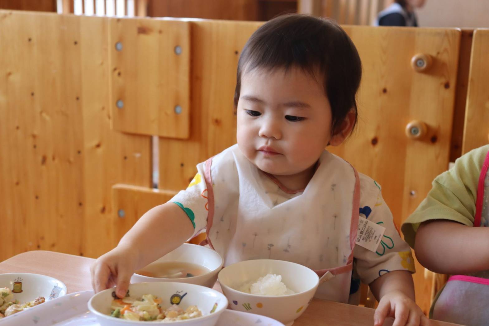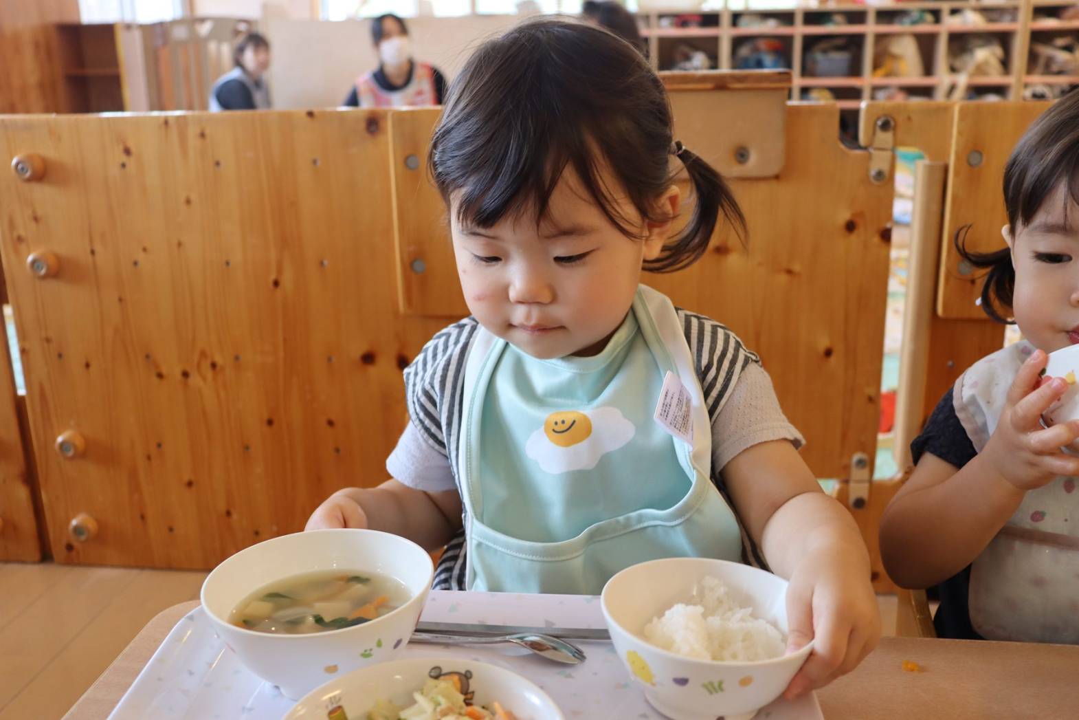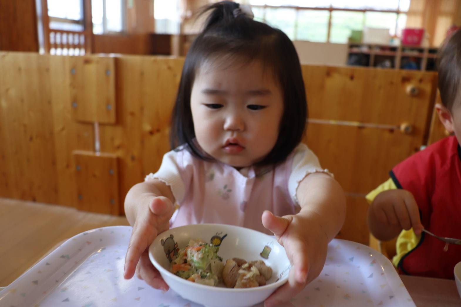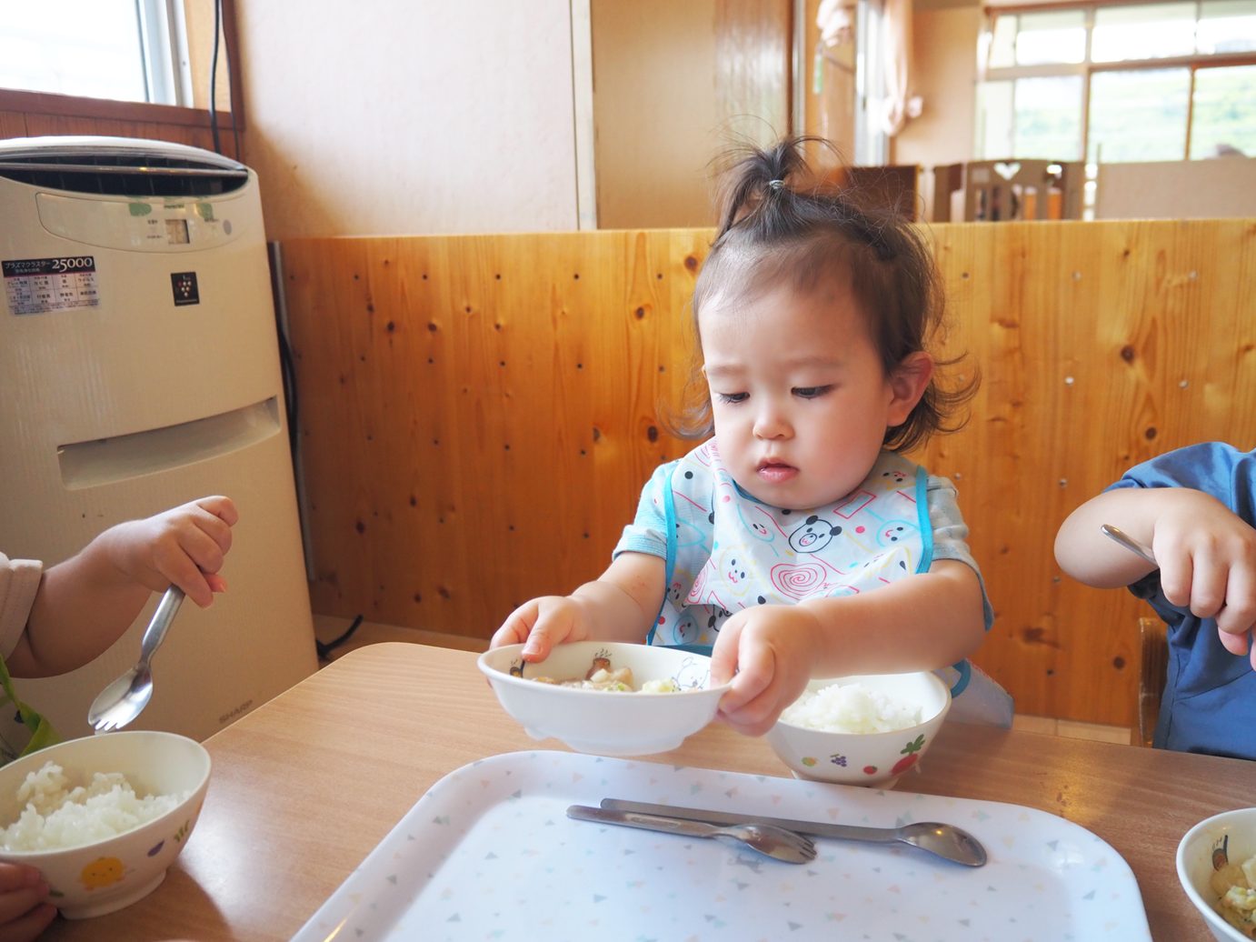 たくさん体を動かした後は、給食の時間です。手や口を拭き、消毒したら準備は万端! こあら組さんでは、お盆に乗せた皿を両手でご飯、お汁、おかずの順で配膳していきます。 一人ひとりに合わせて、汁など一緒に手を添えながら援助をしているところです。少しずつ流れを覚えてくると自分たちから手を出して一生懸命配膳する姿が見られてきました。 綺麗に食べ終えると、最後も自分たちでお盆に皿を片付けておしまいです。 ピカピカになったお皿を見て嬉しそうな子どもたちでした。