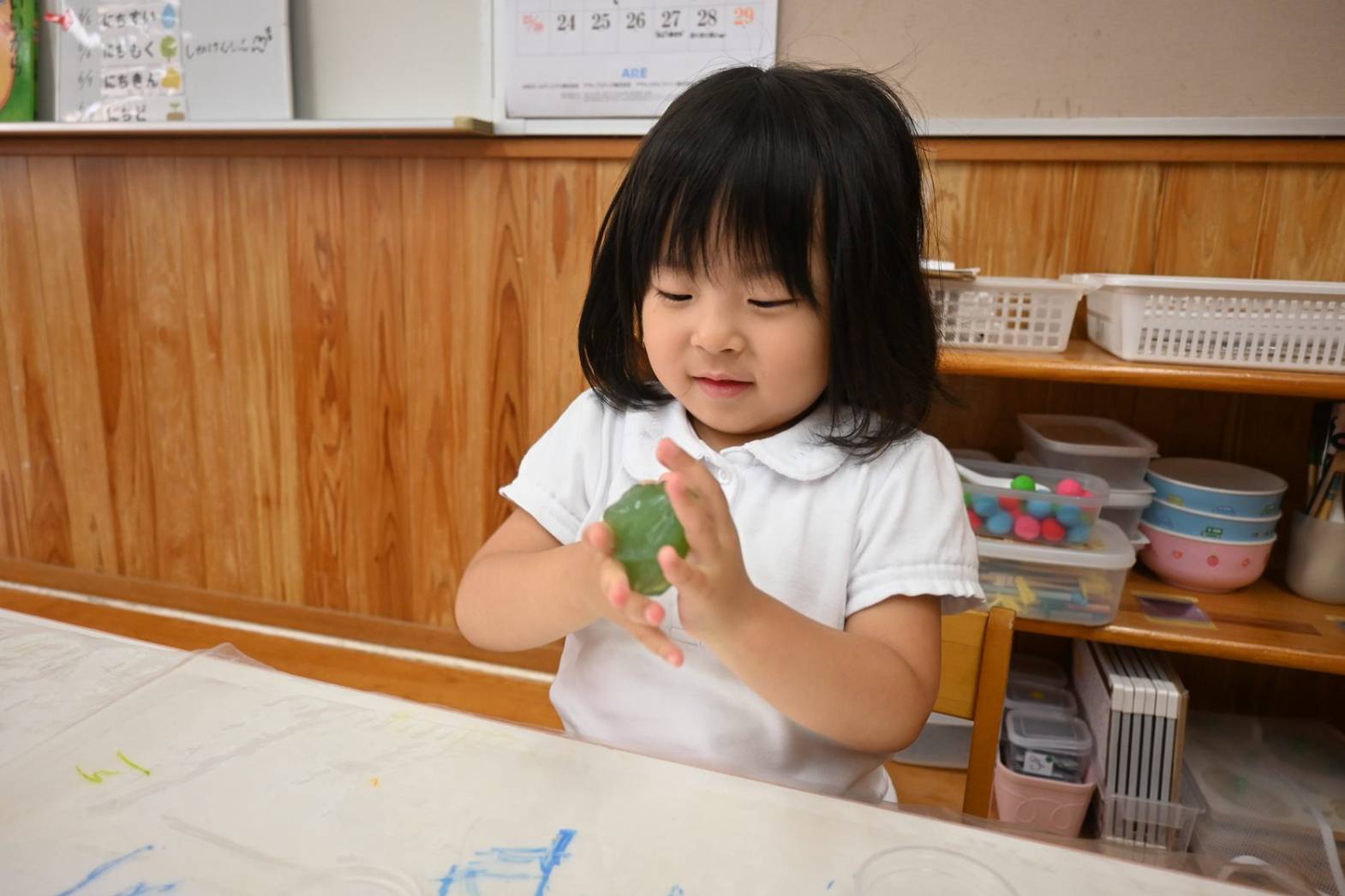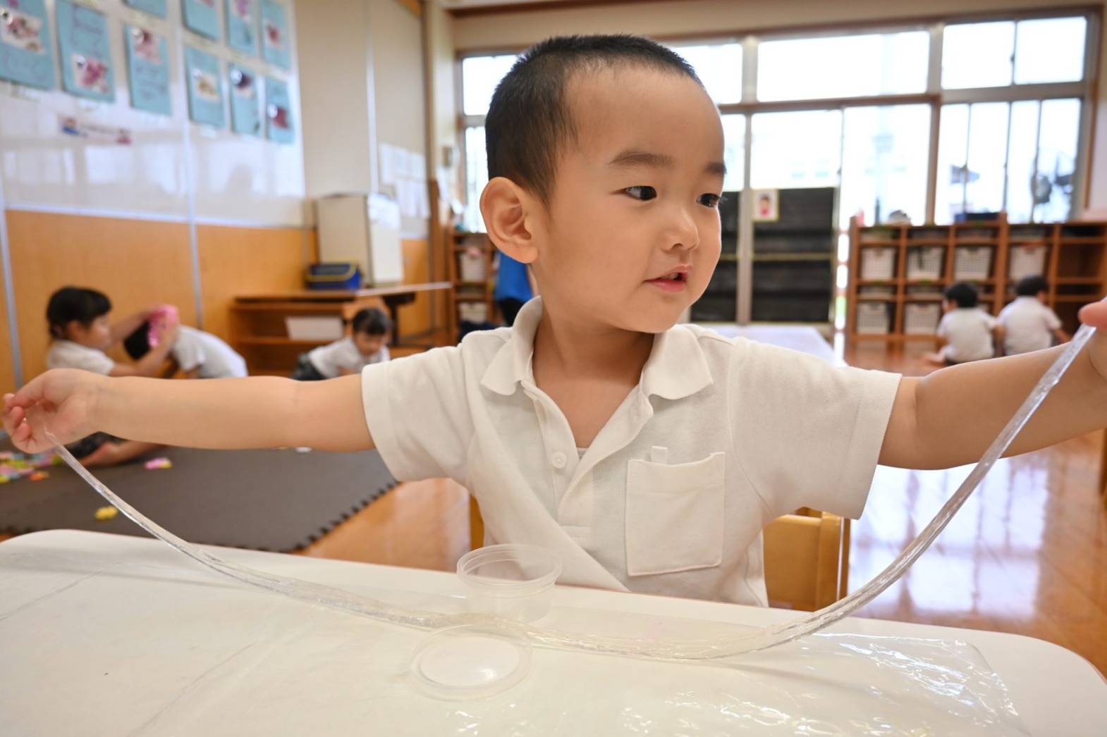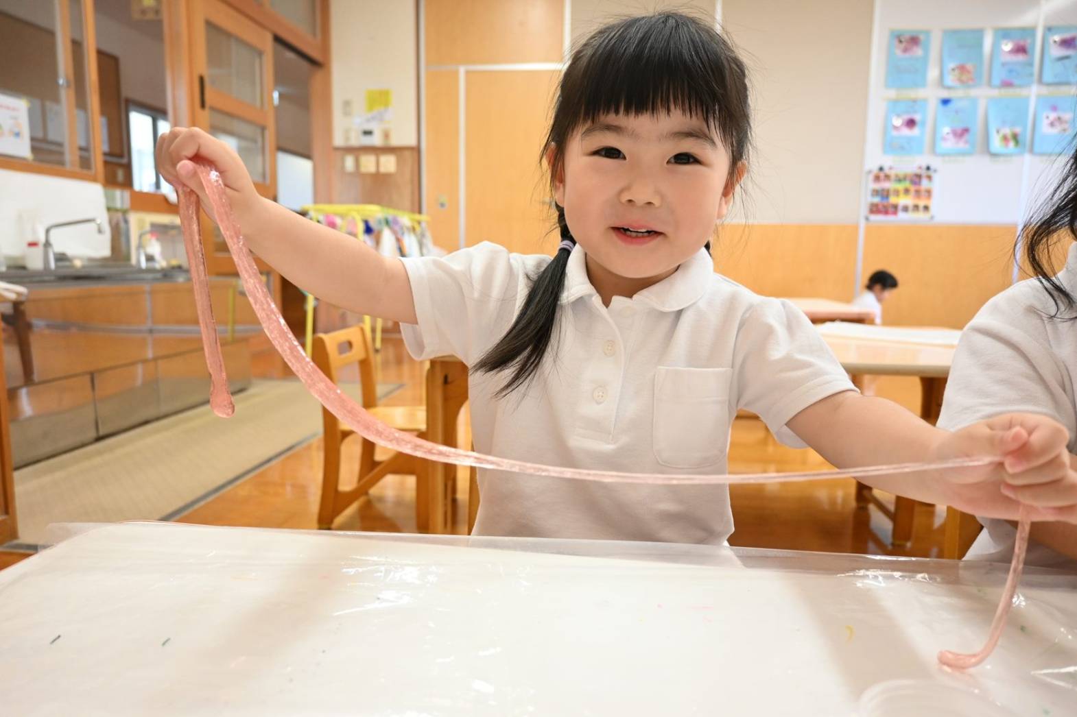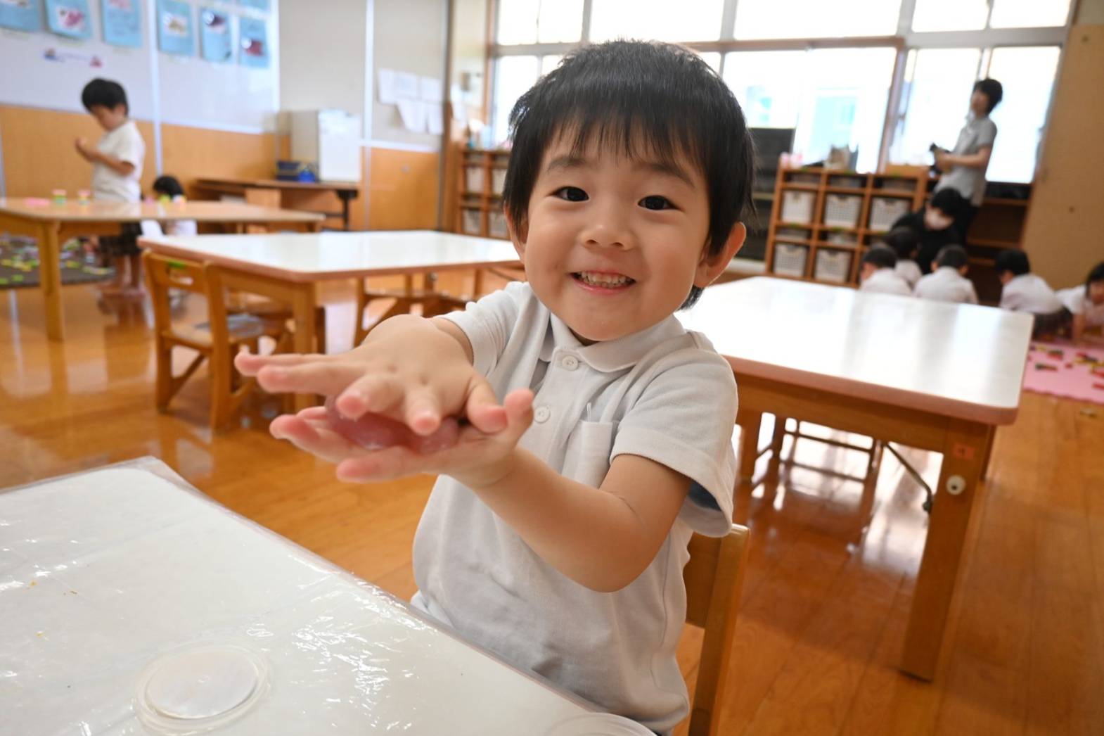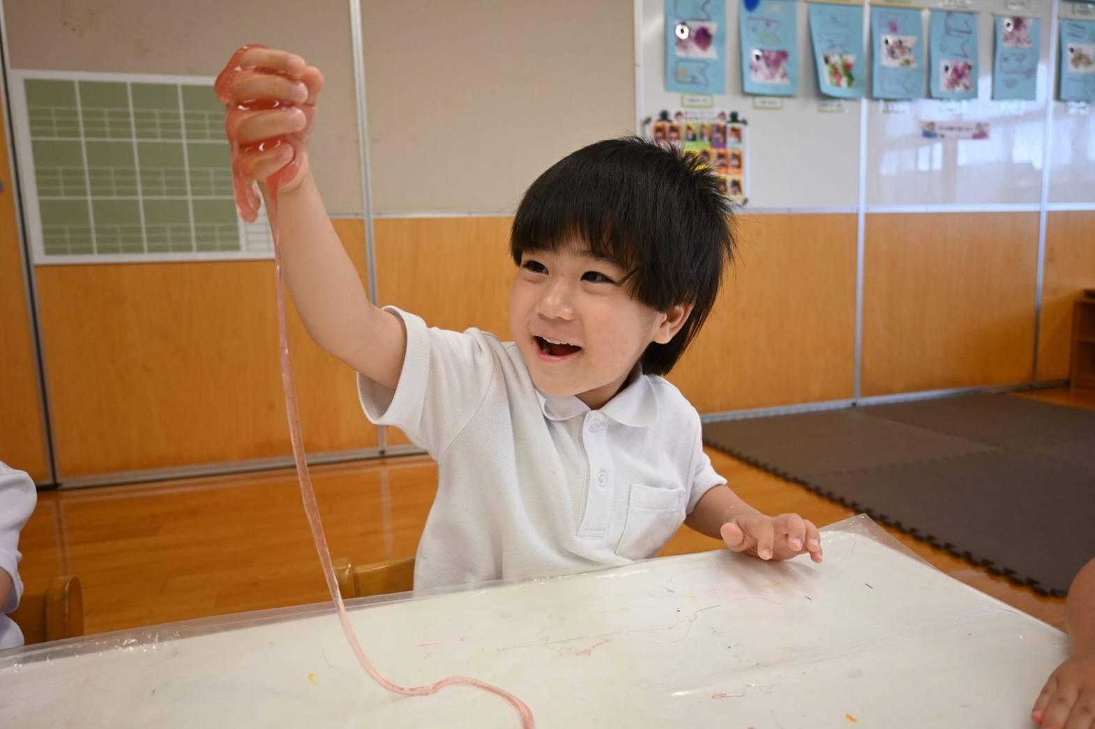スライムを使って感触遊びを行ったりす組さん。 「僕オレンジにする。」、「順番ね。」と友だち同士で声を掛け合いながら、好きな色のスライムを手に取ります。 「みてみて、長いよ!」、「のびた~!」と伸ばしてこねて感触を楽しむ子どもたち。 「カップケーキできた!」、「ピザもあるよ。」と形を工夫しながら、様々な物に見立てて楽しむ姿がありました。
