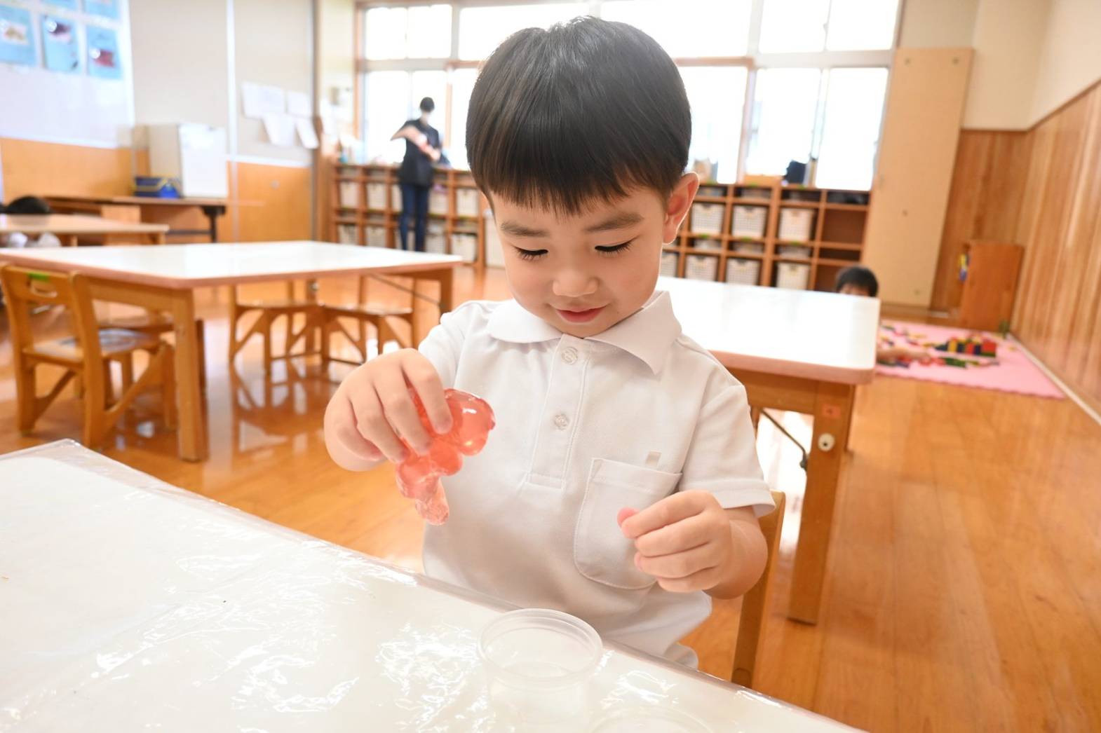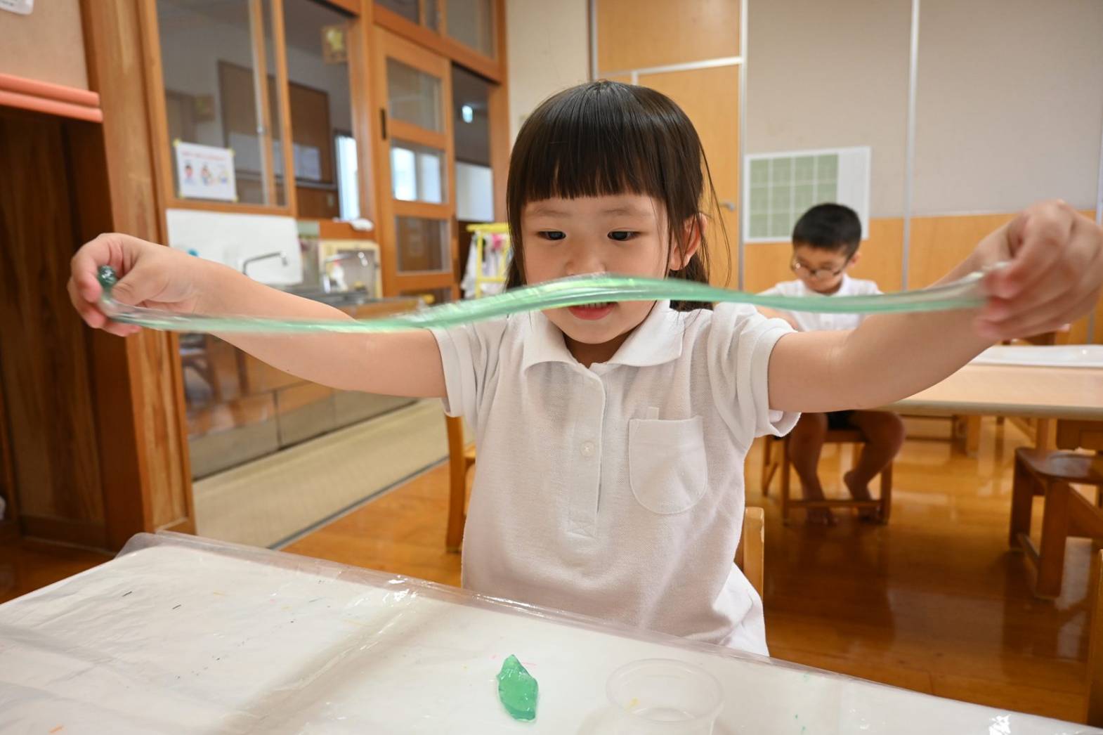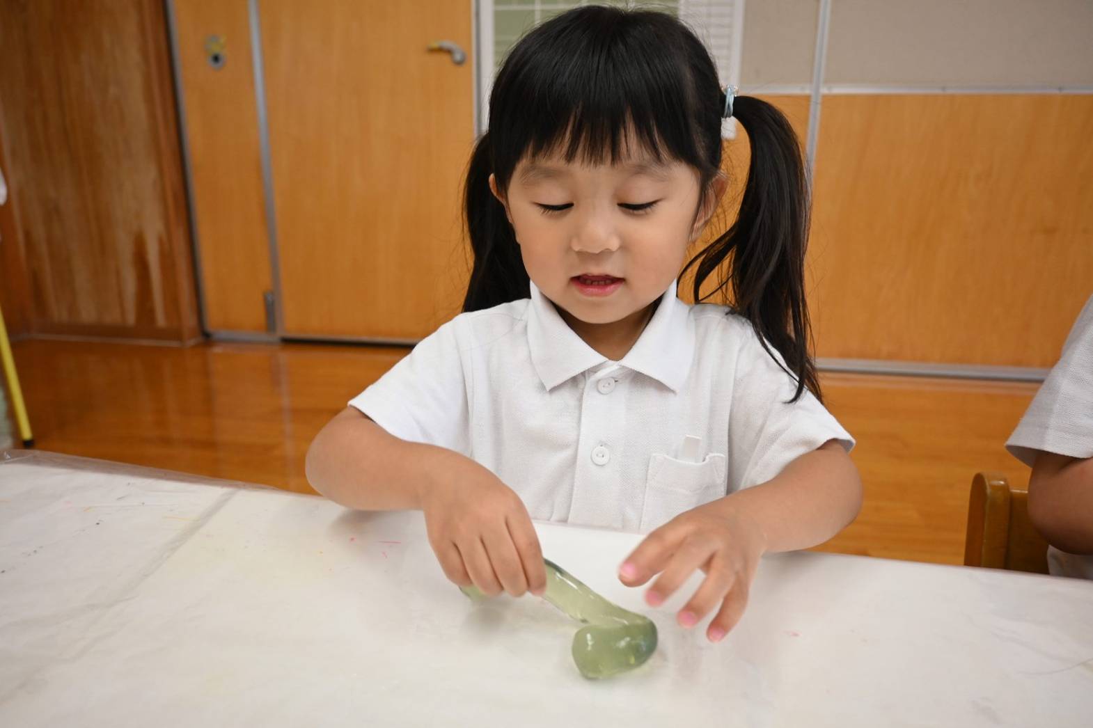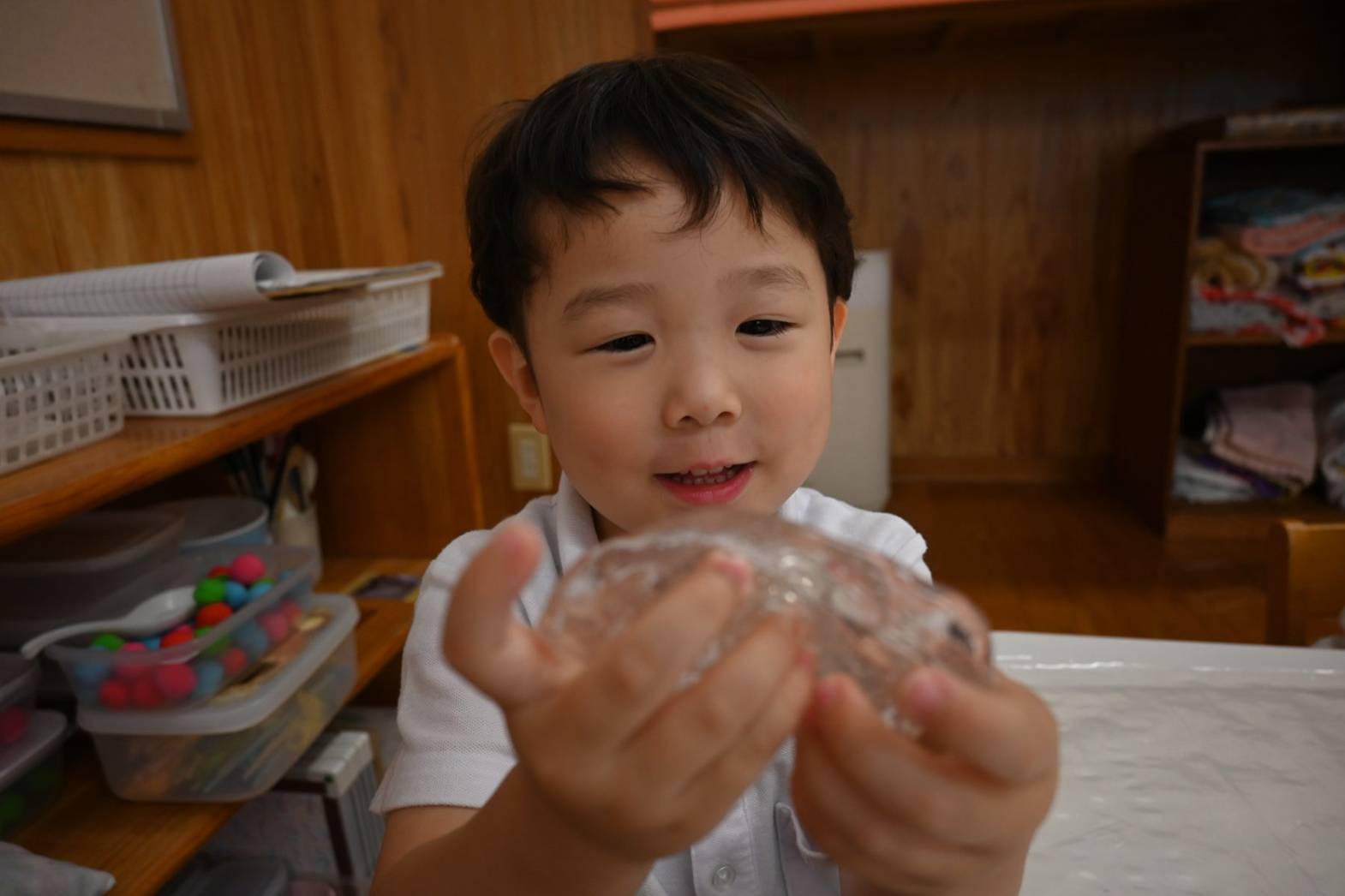 スライムを使って感触遊びを行ったりす組さん。 「僕オレンジにする。」、「順番ね。」と友だち同士で声を掛け合いながら、好きな色のスライムを手に取ります。 「みてみて、長いよ!」、「のびた~!」と伸ばしてこねて感触を楽しむ子どもたち。 「カップケーキできた!」、「ピザもあるよ。」と形を工夫しながら、様々な物に見立てて楽しむ姿がありました。