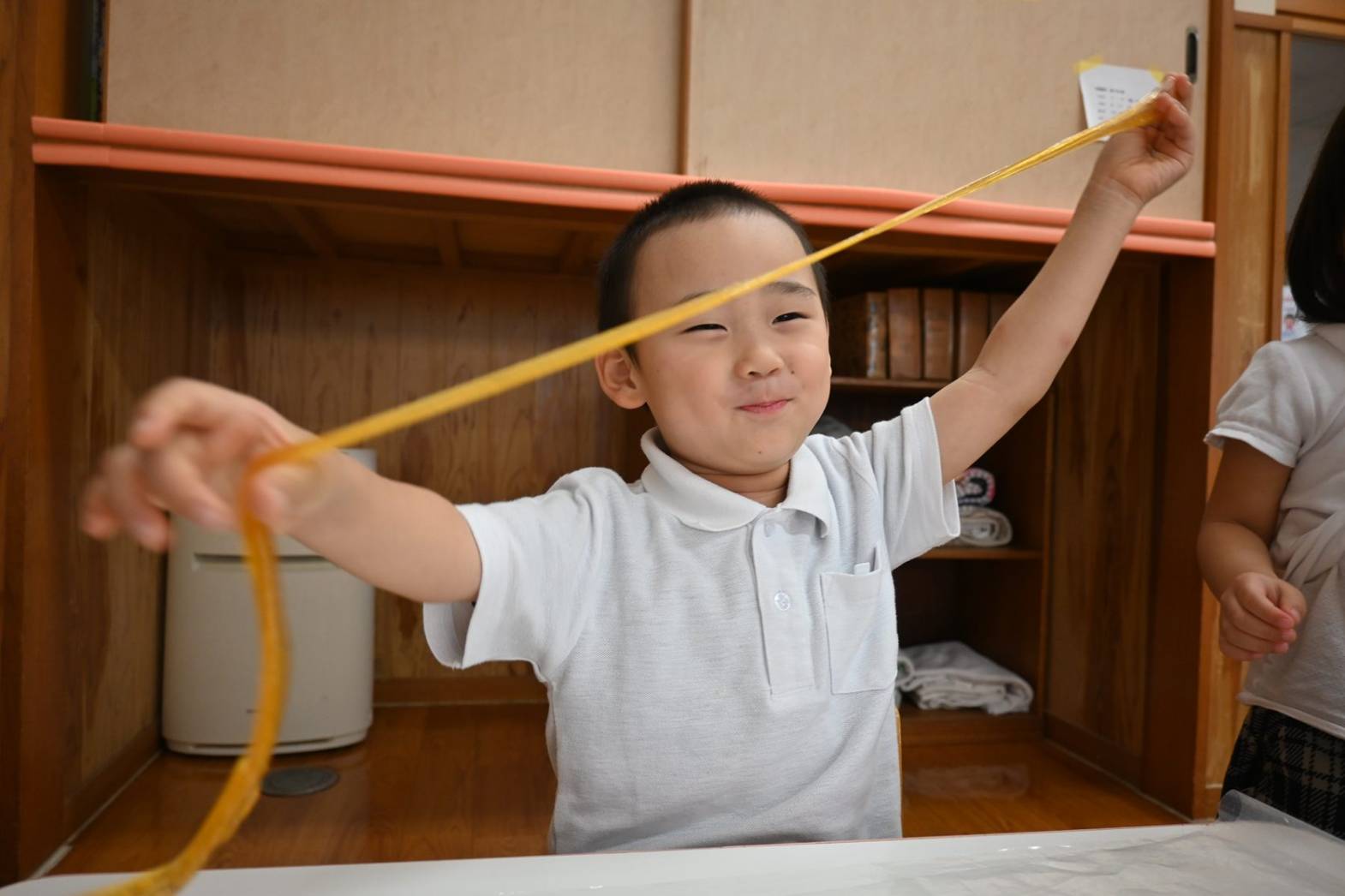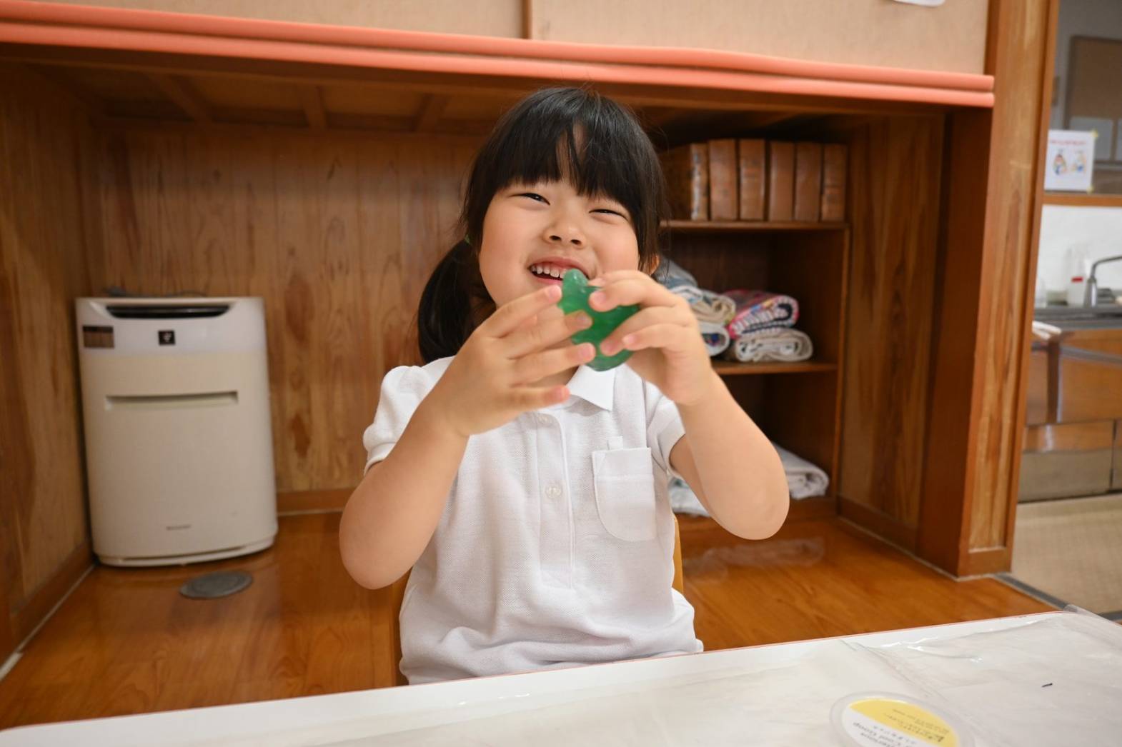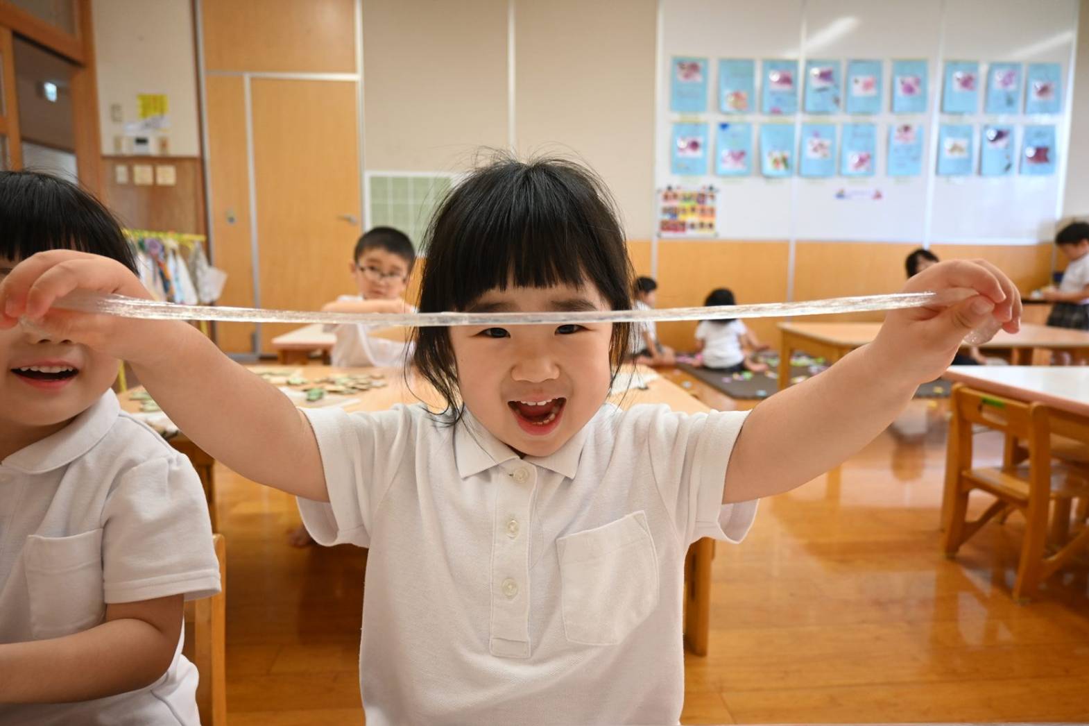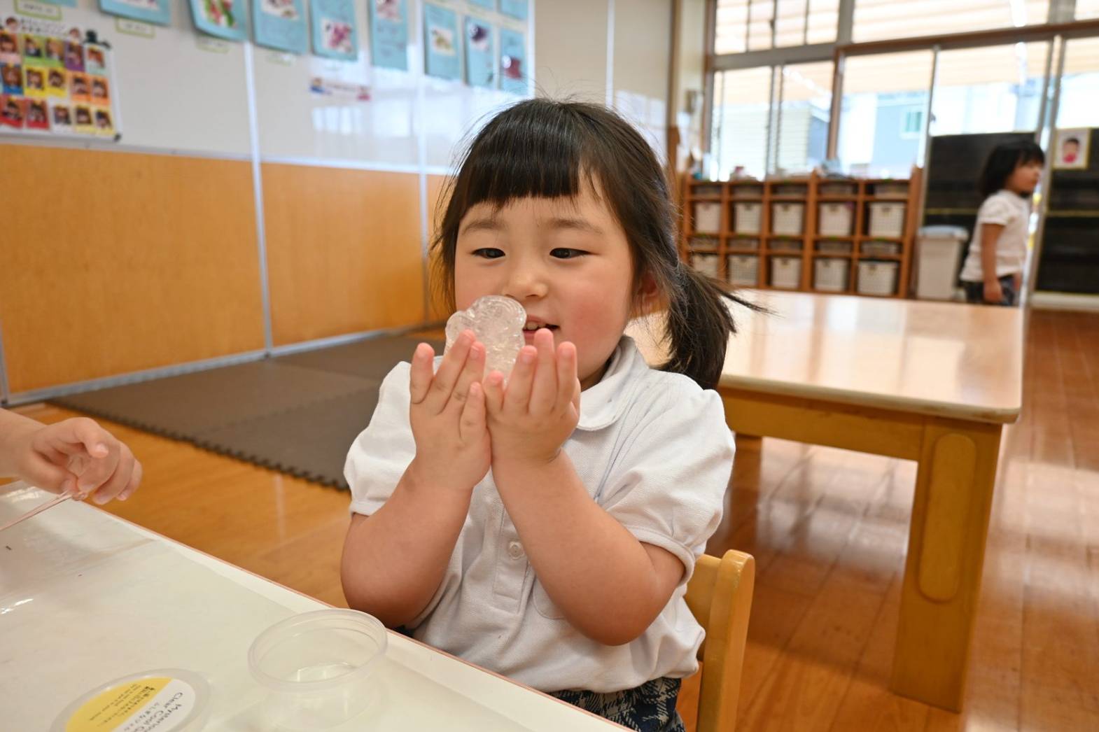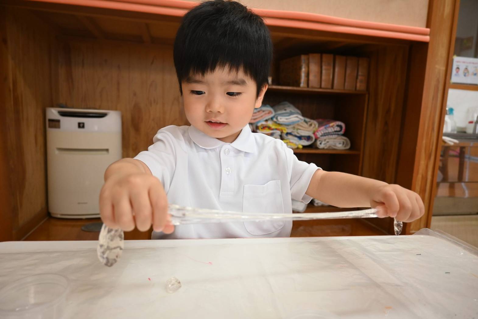 スライムを使って感触遊びを行ったりす組さん。 「僕オレンジにする。」、「順番ね。」と友だち同士で声を掛け合いながら、好きな色のスライムを手に取ります。 「みてみて、長いよ!」、「のびた~!」と伸ばしてこねて感触を楽しむ子どもたち。 「カップケーキできた!」、「ピザもあるよ。」と形を工夫しながら、様々な物に見立てて楽しむ姿がありました。
