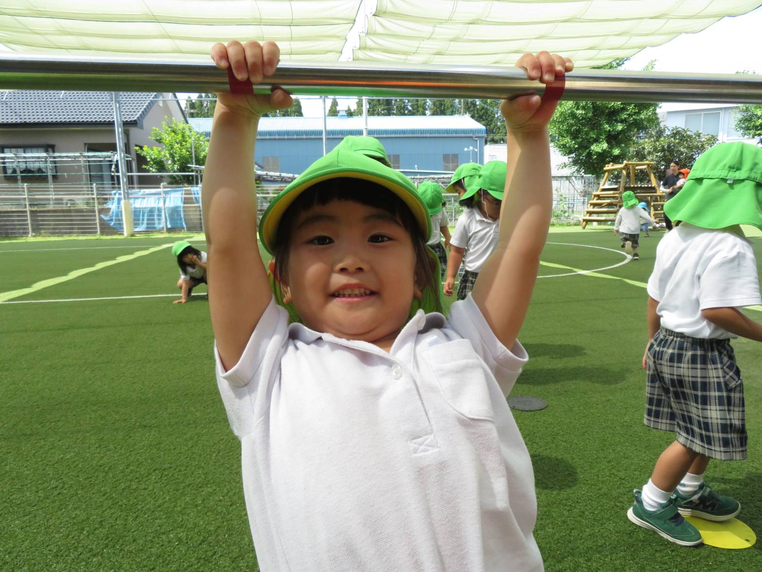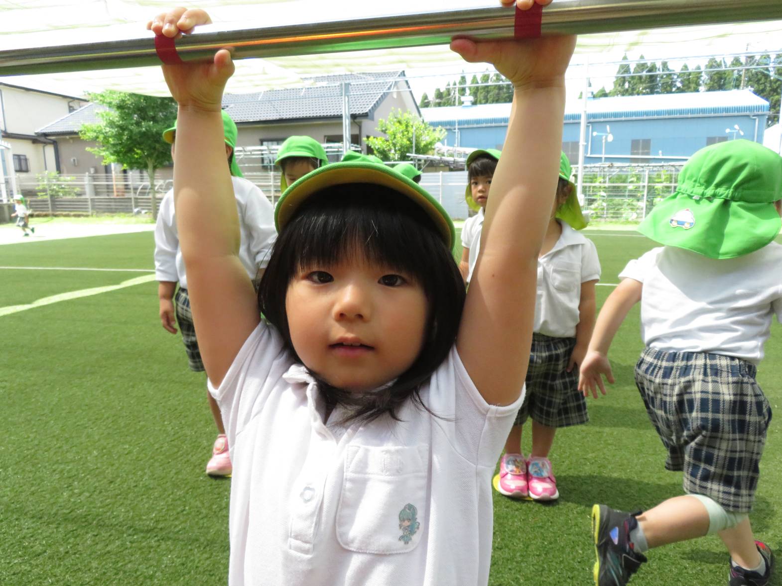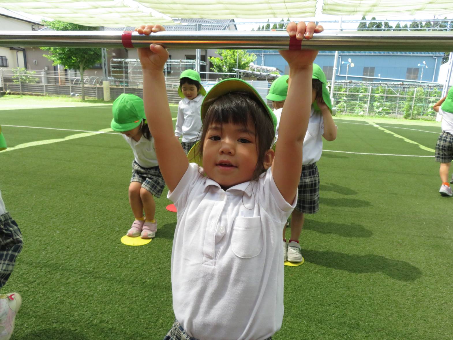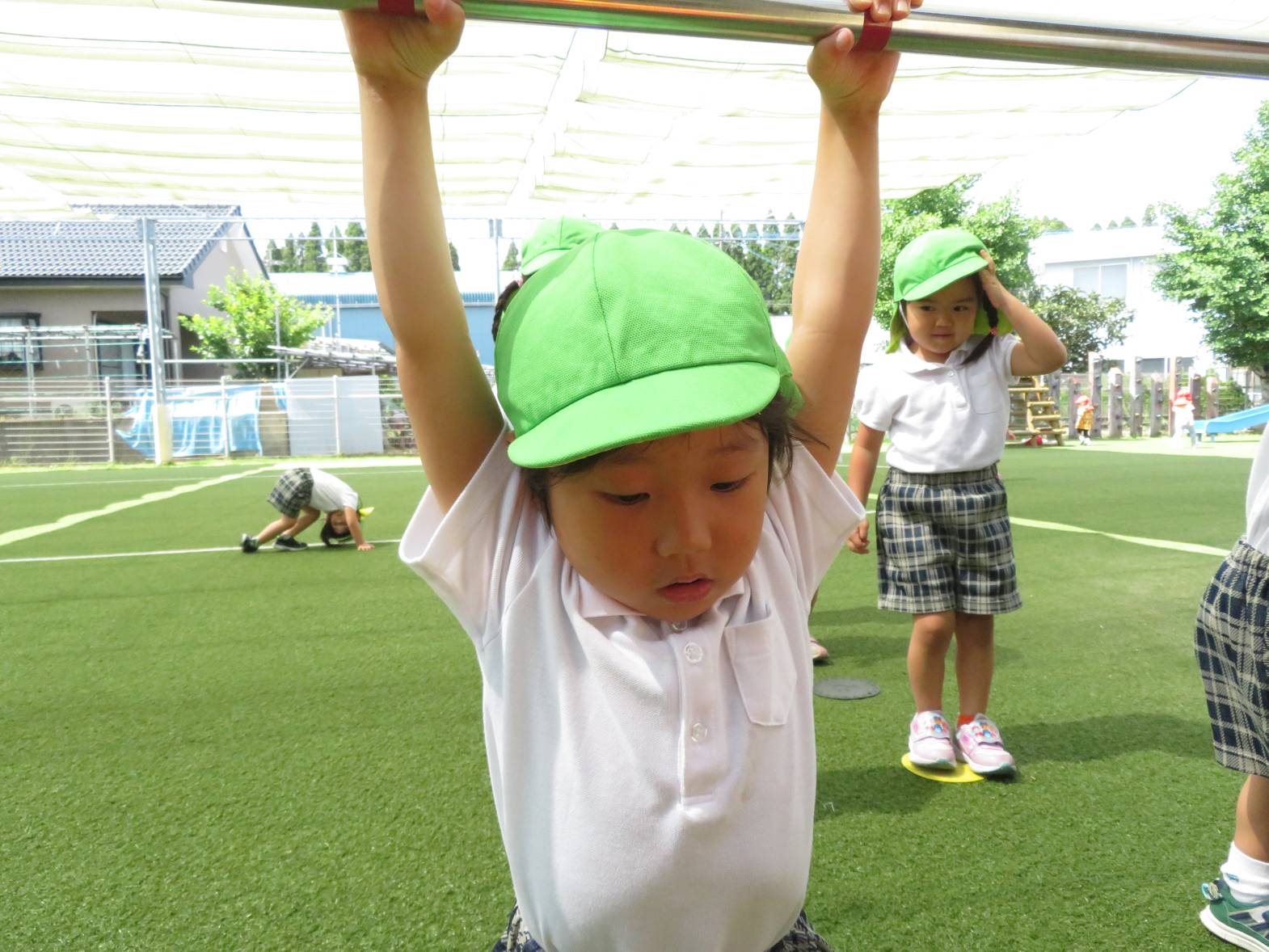 運動遊びでは、鉄棒に挑戦しました。 「パクパクギュッ!」と、鉄棒の握り方を教えてもらうと、「こう?」、「合ってる?」等と、一つひとつ確認しながら、真剣な表情で取り組む姿が見られました。 上手にぶら下がったり、こあらやお猿さんのポーズができたりすると、「できたー!」と、とても嬉しそうな子どもたちでした♪ 今後もいろいろなことに挑戦していきたいと思います!