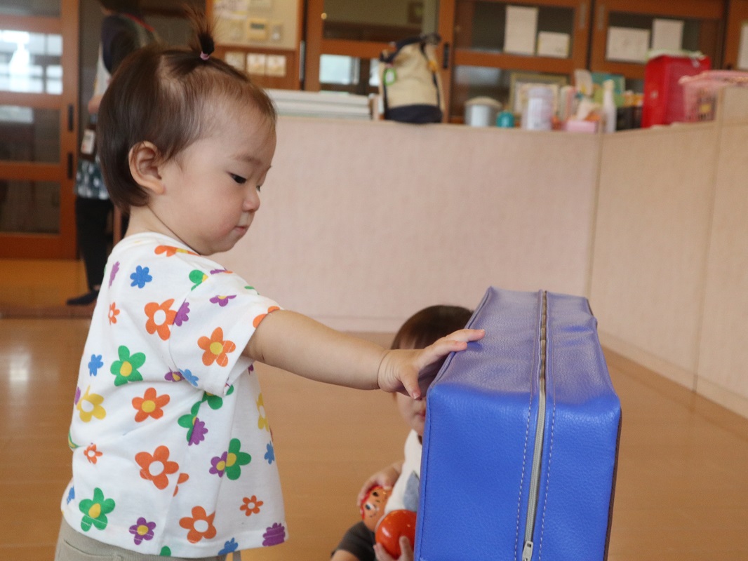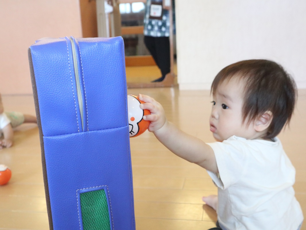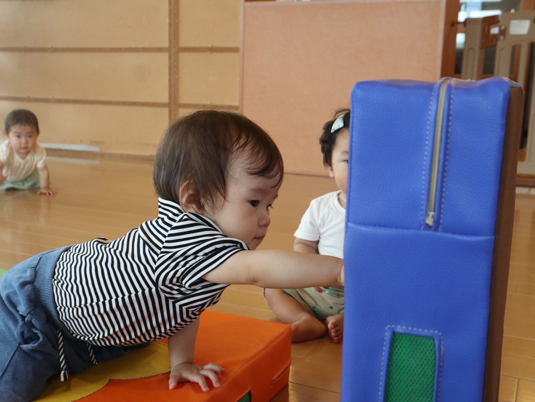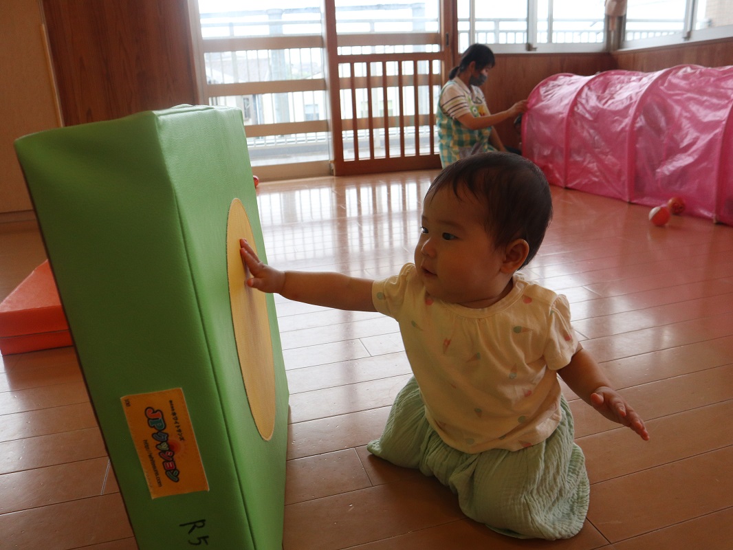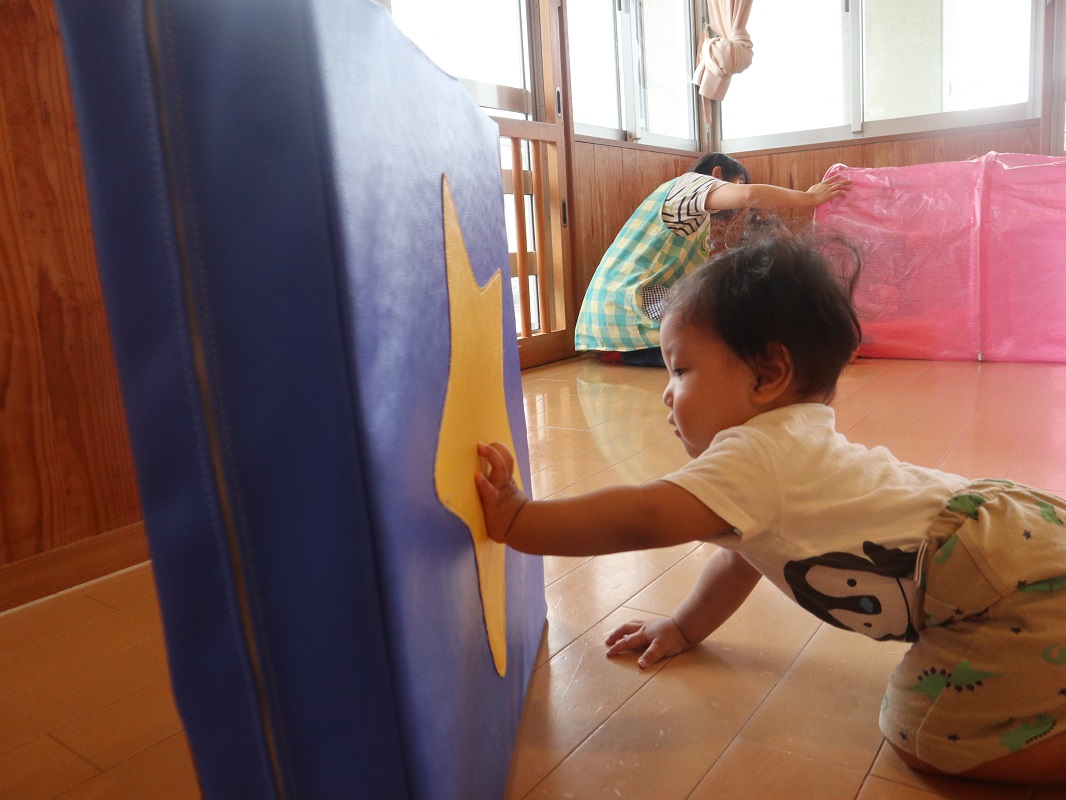 マット遊びの中で、子どもたちがはまっていることは、マット倒しです。 正方形のマットを立てると、「おっ!」と目をキラキラ輝かせながらマットに近づいていく子どもたち。 手を前に出しマットを押すと、マットが倒れる感覚や音が楽しいようで、ニコニコ笑って楽しそうな姿が見られています。 手の力もどんどん強くなり、色々なことができるようになってきている子どもたちです!
