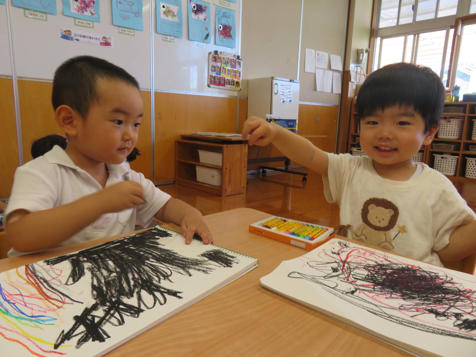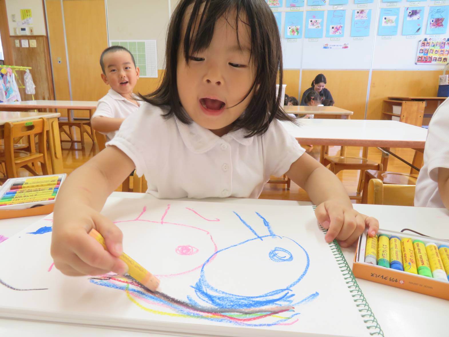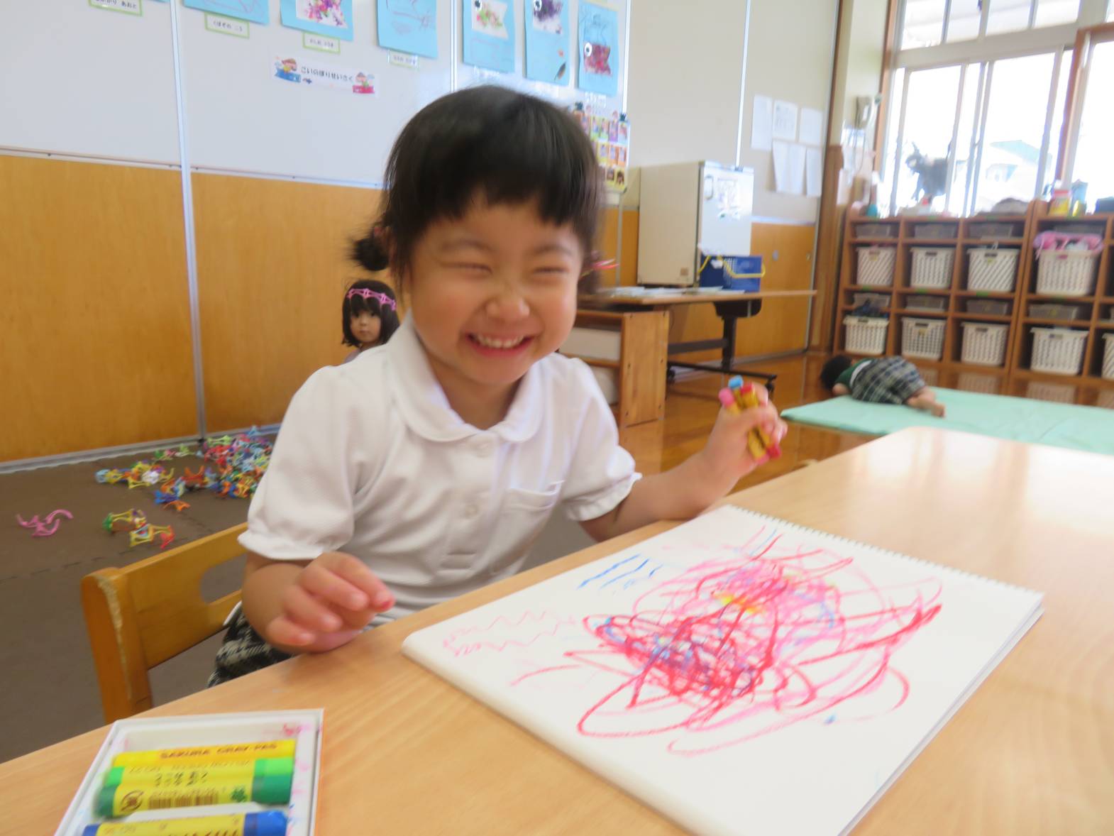 今日は、スケッチブックにお絵描きをしました。 名前を呼ばれるとニコニコ笑顔で棚から自分のスケッチブックとクレヨンを用意する子どもたち。 「何を描こうかな。」「ピンクで描くんだ!」とクレヨンを手にのびのび描いていきます! 「見て見て、クラゲ!」「虹描いたよ。」「まっくろくろすけ!」と描いたのを嬉しそうにお披露目してくれる子どもたち。 「お絵描き楽しかった。」「また明日もする?」と次なるお絵描きタイムが楽しみなりす組さんです。