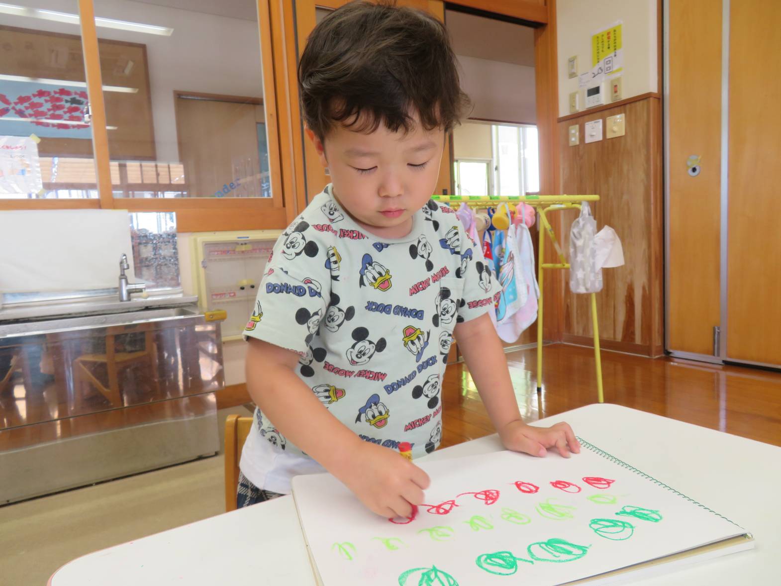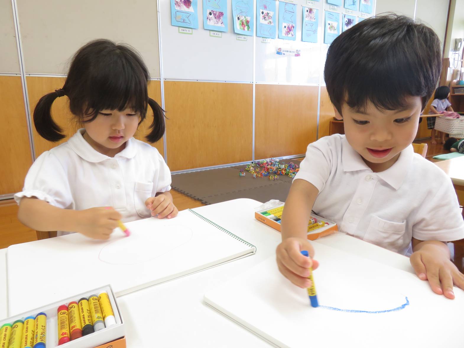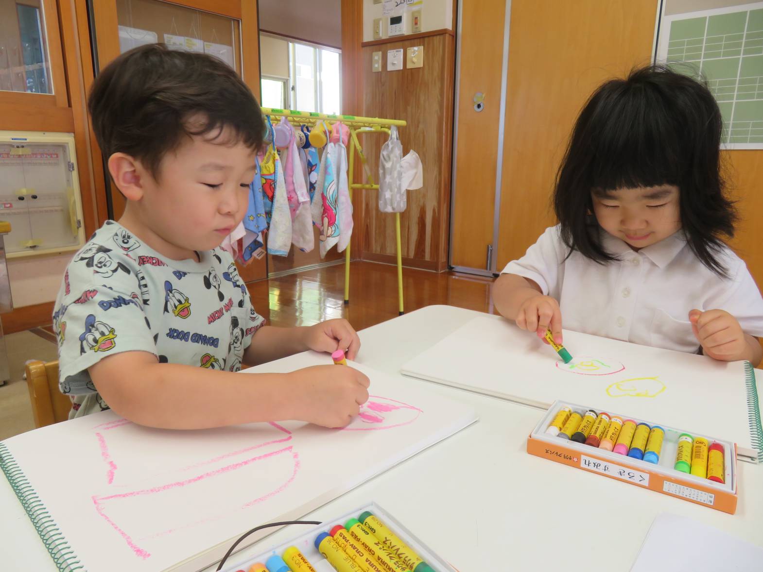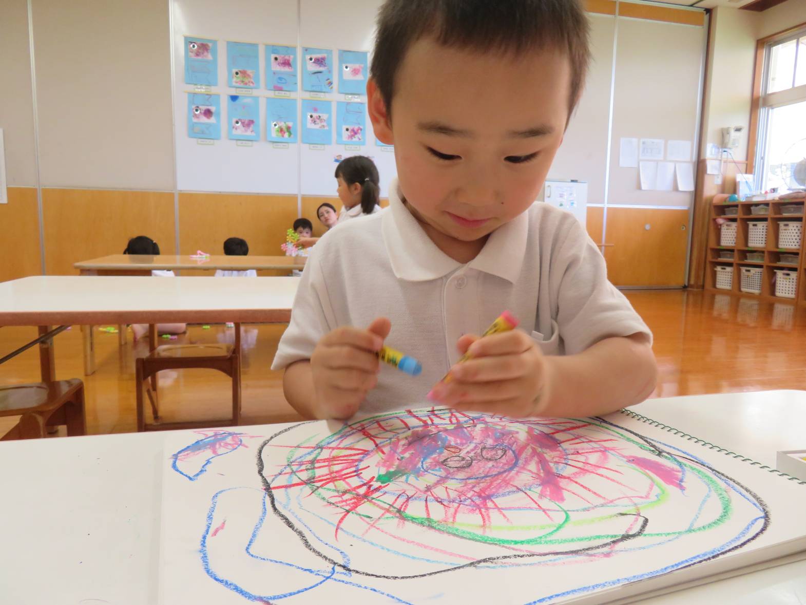 今日は、スケッチブックにお絵描きをしました。 名前を呼ばれるとニコニコ笑顔で棚から自分のスケッチブックとクレヨンを用意する子どもたち。 「何を描こうかな。」「ピンクで描くんだ!」とクレヨンを手にのびのび描いていきます! 「見て見て、クラゲ!」「虹描いたよ。」「まっくろくろすけ!」と描いたのを嬉しそうにお披露目してくれる子どもたち。 「お絵描き楽しかった。」「また明日もする?」と次なるお絵描きタイムが楽しみなりす組さんです。