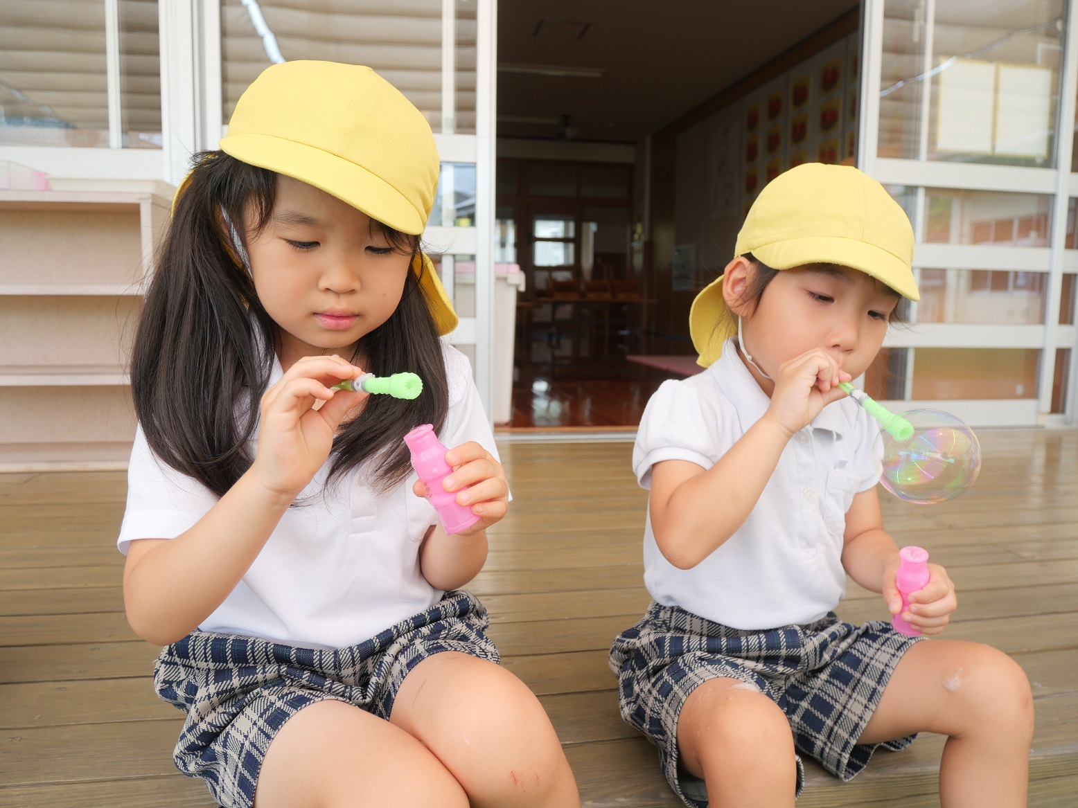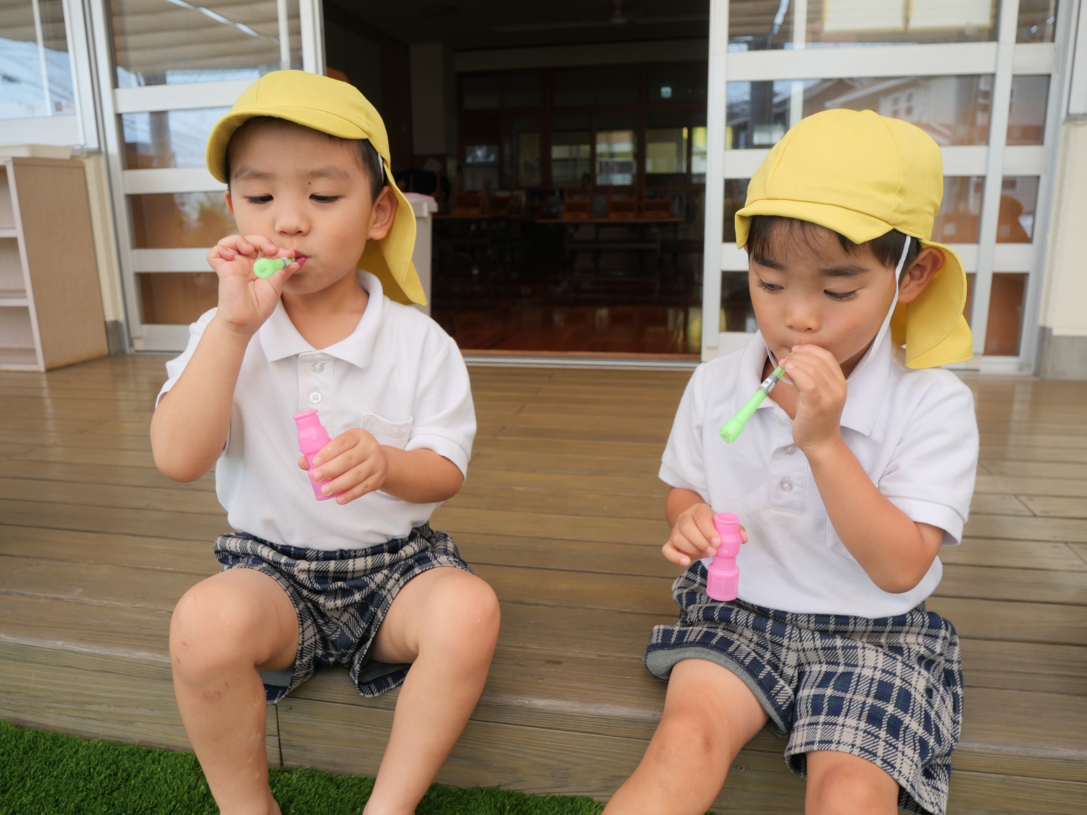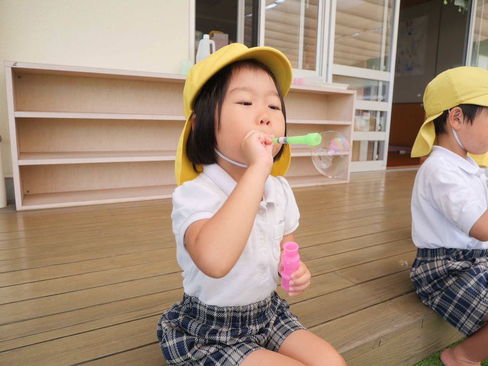 戸外遊びの中で、シャボン玉遊びを行った子どもたち。