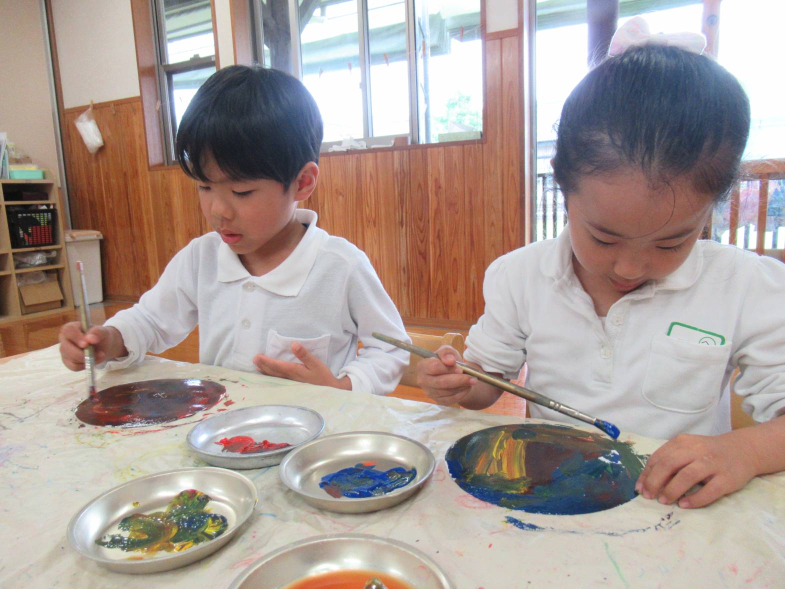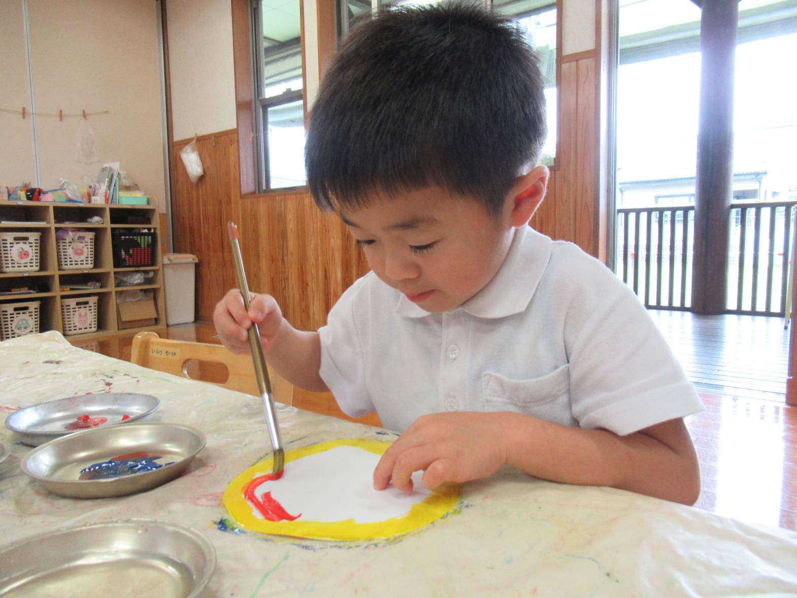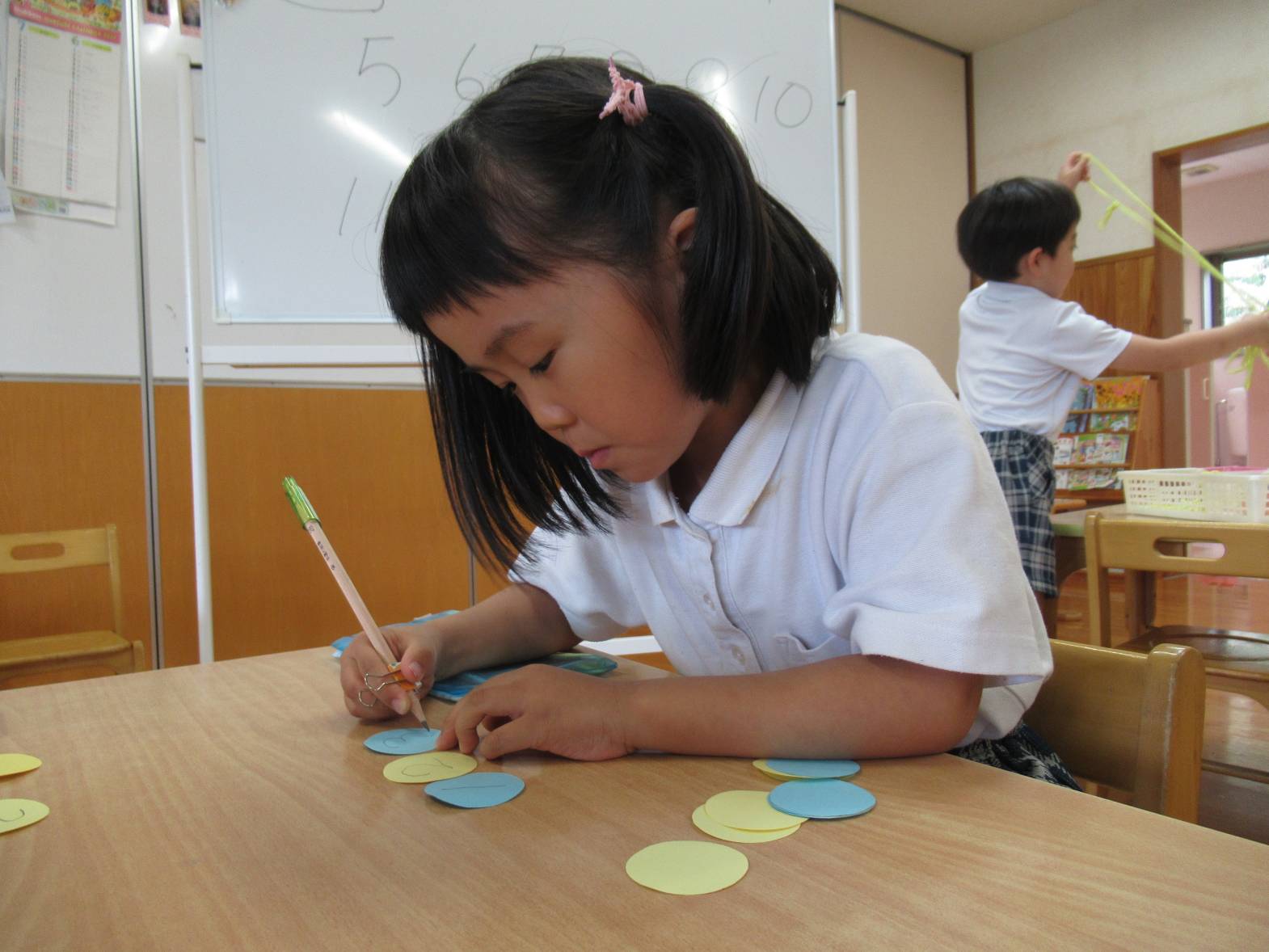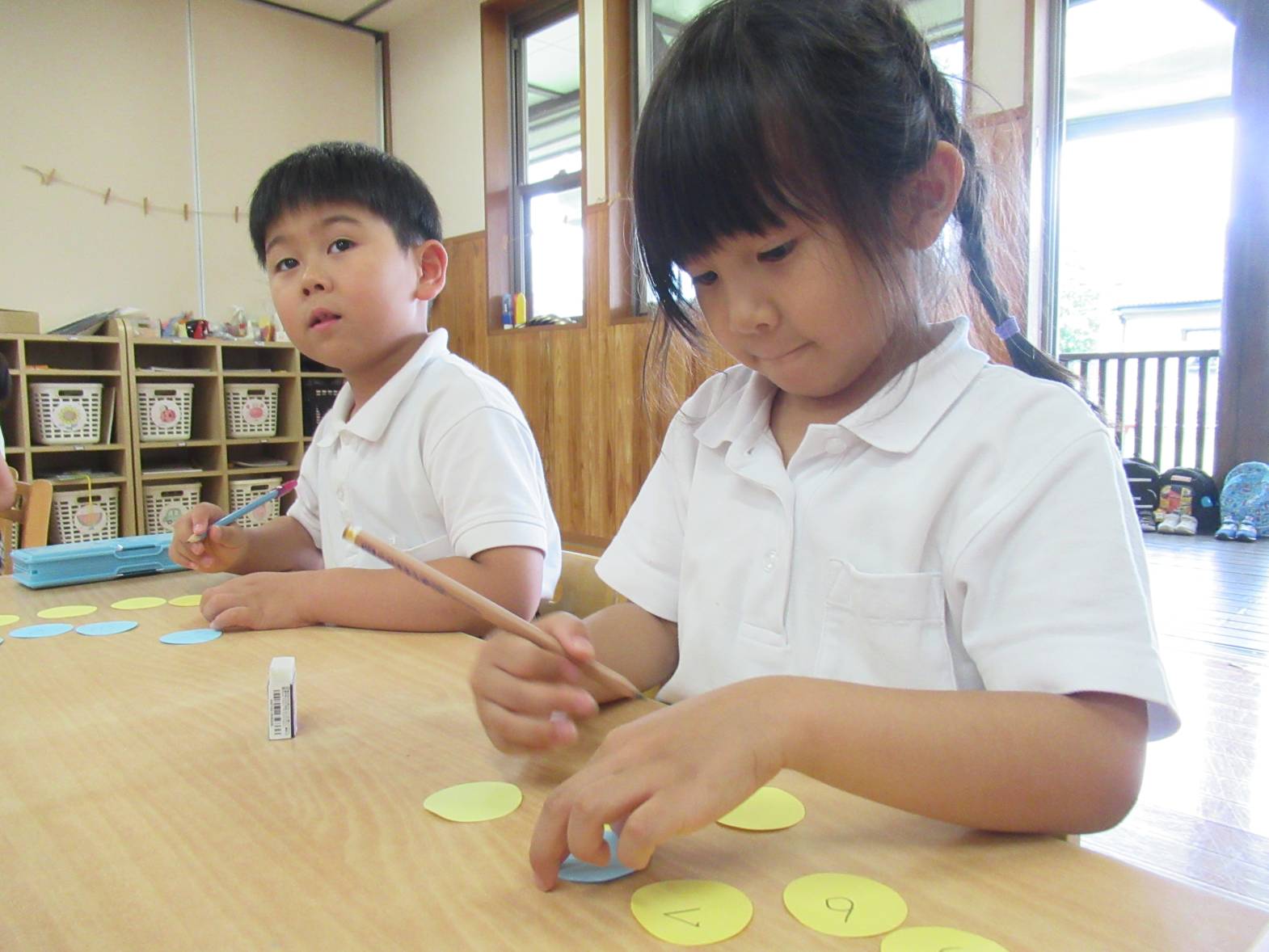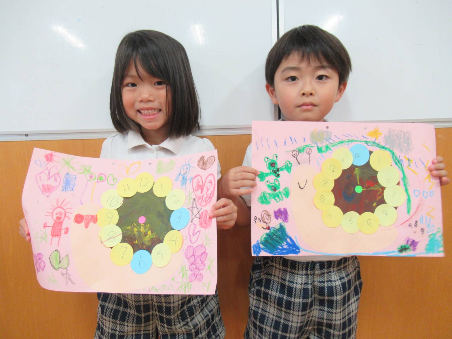 雨の日が続いた今週はかたつむり製作をしました。 まずは赤、青、黄色の3色を使い、かたつむりの殻の色付けをします。 「見て!オレンジになった!」と色の変化を友だちと共有しながら色付けをする子どもたち。 次に時計の数字を書いていきます。「自分で書けるよ!」と少しずつ書くことができるようになっています。 殻や数字を画用紙に貼り、絵を描いて完成! 「これ、私の!」、「カエル描いたんだ!」と友だちと見せ合うきりん組さんでした。