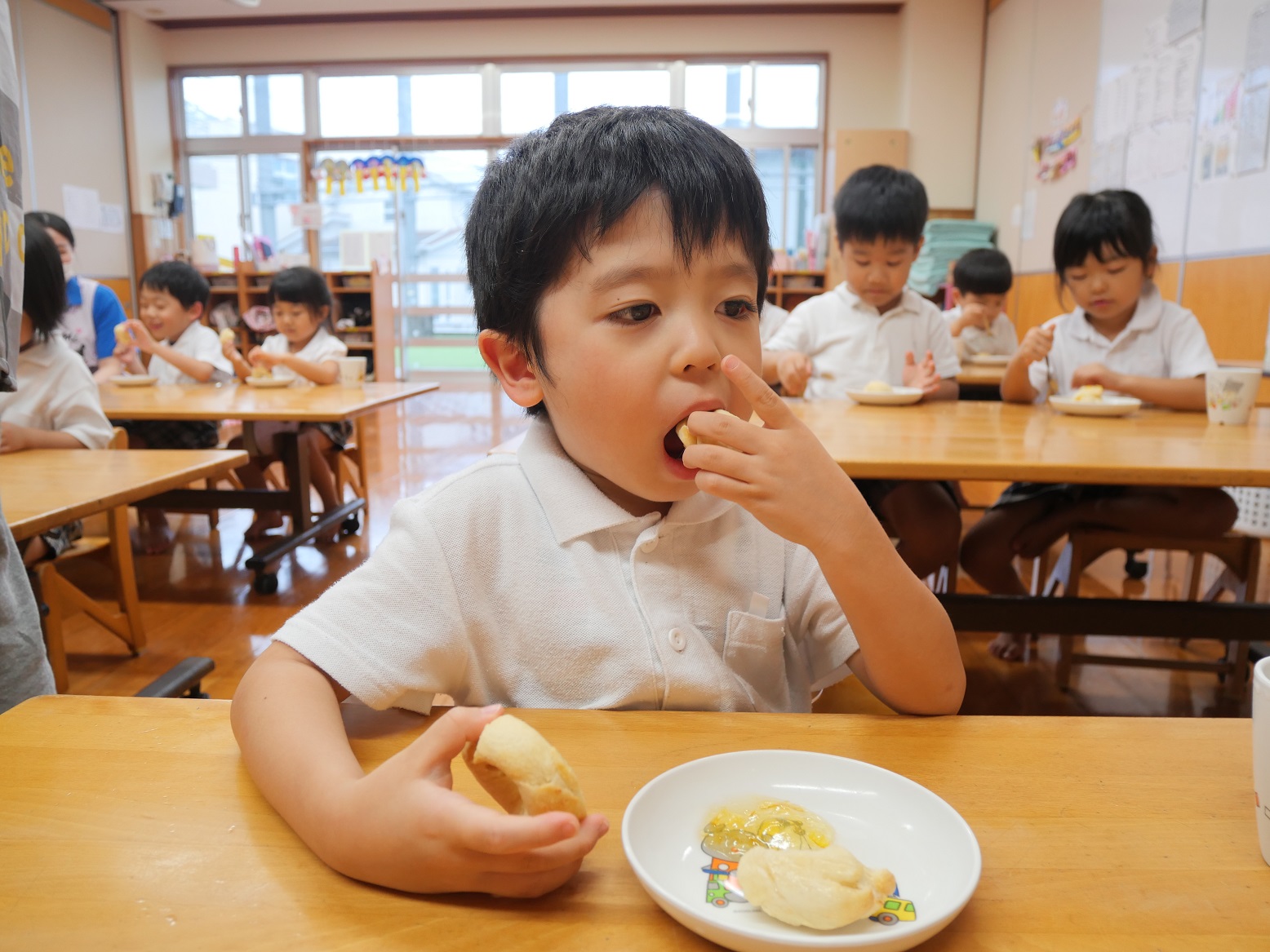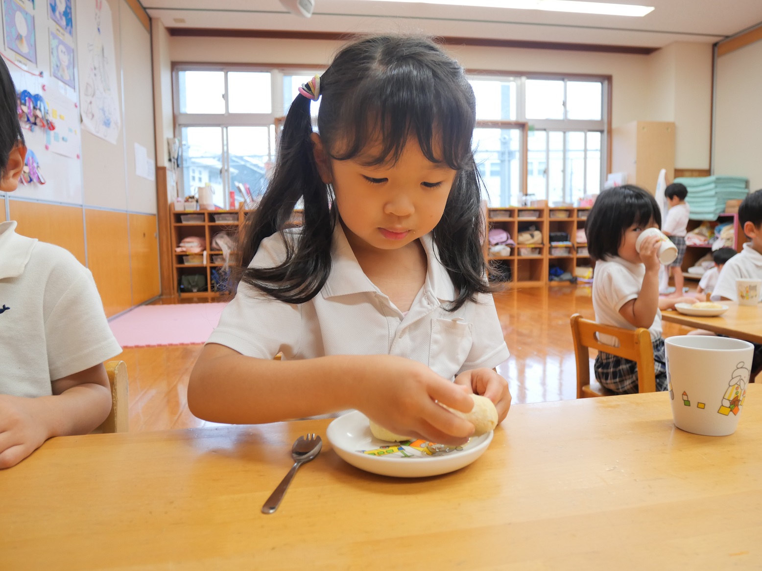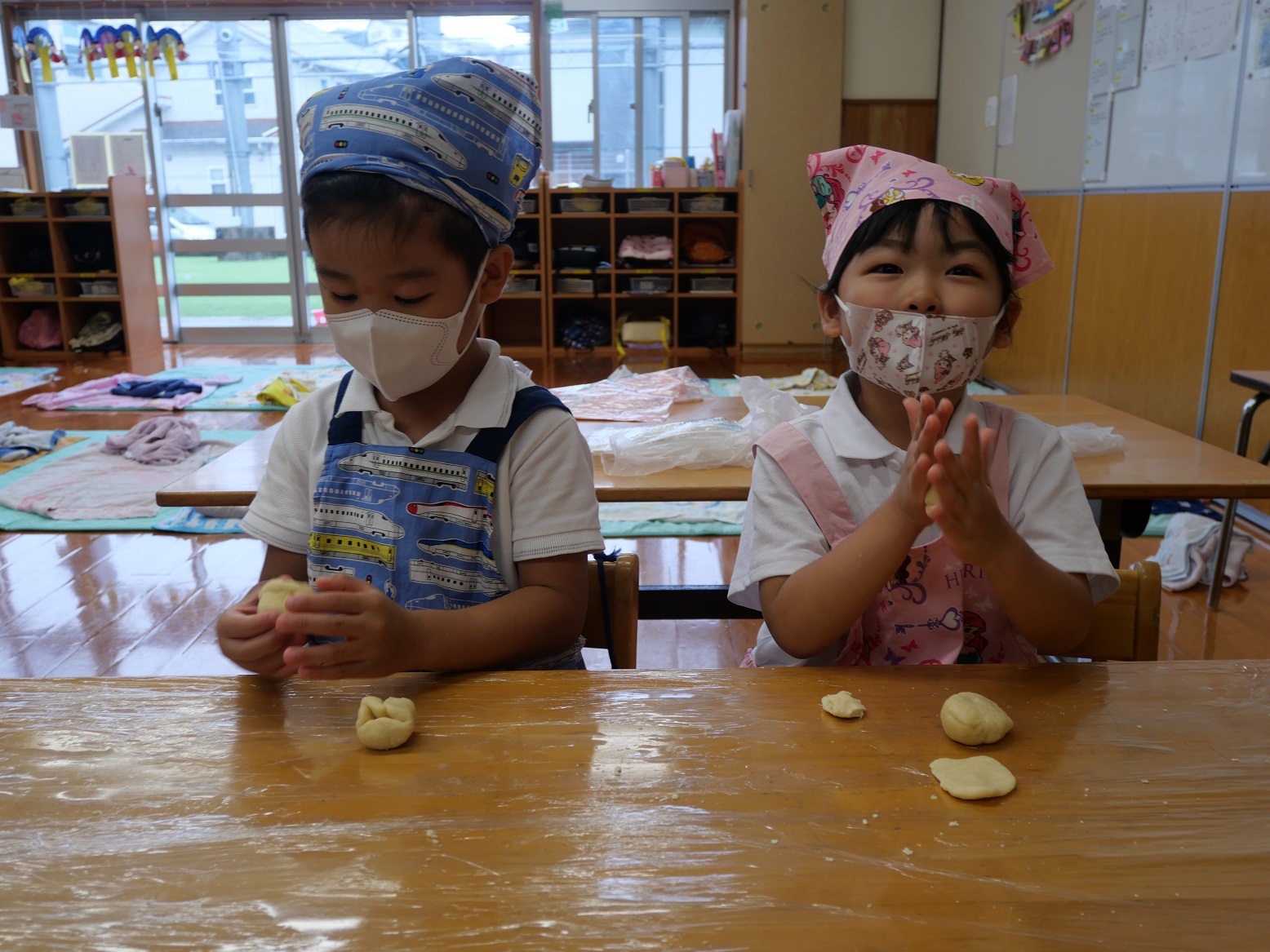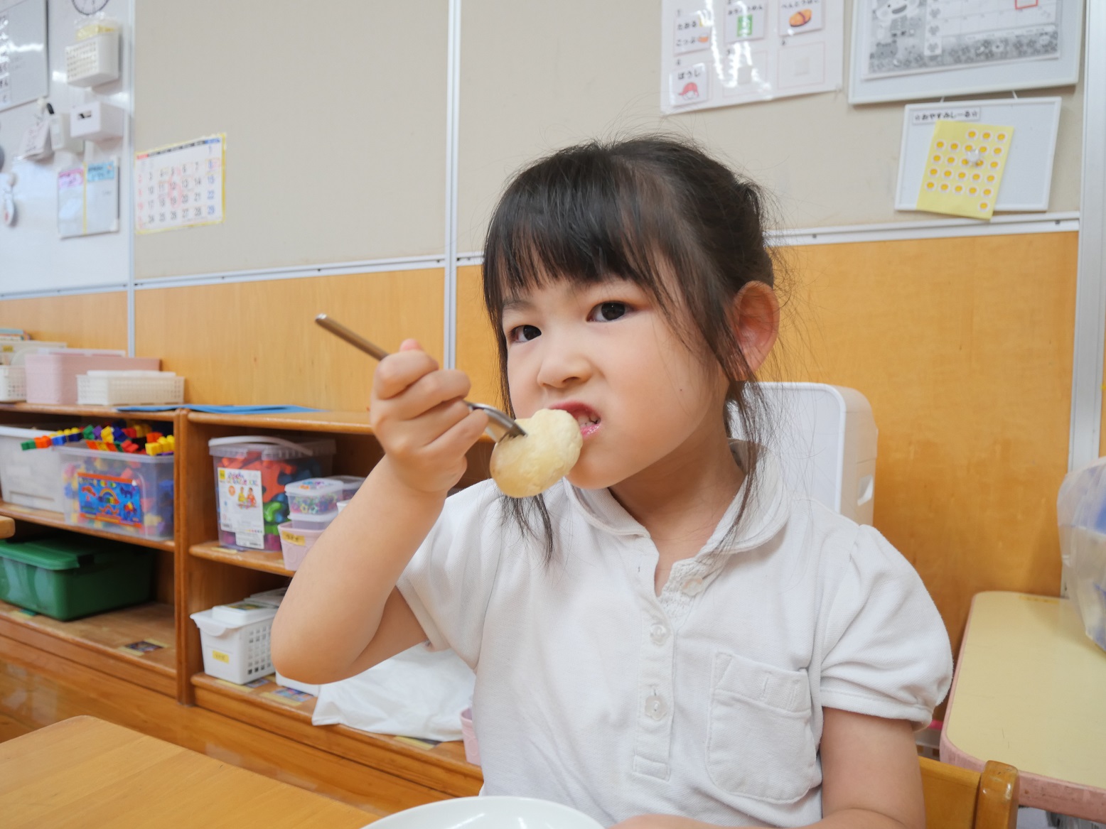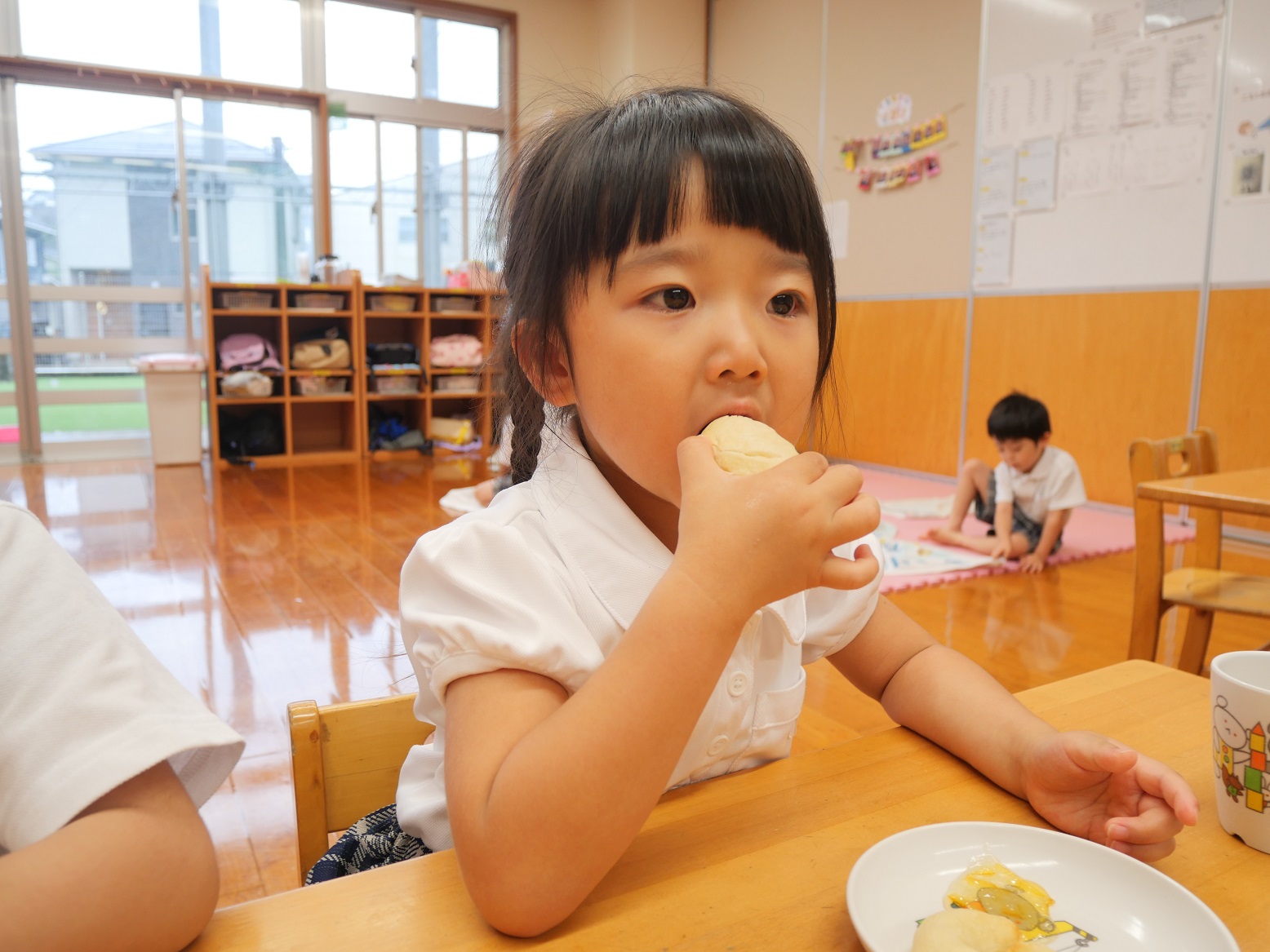 「焼いたらこんな形になるんだ。」「これ、自分で作ったんだよ!」と、嬉しそうな表情で食べていたうさぎ組さんです。