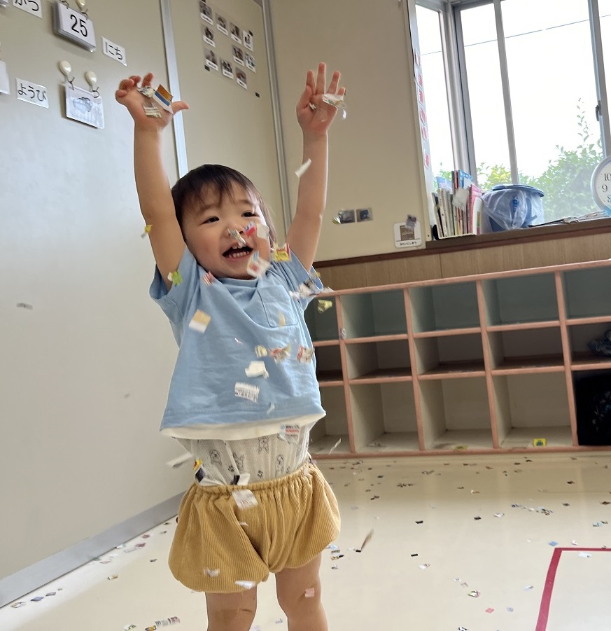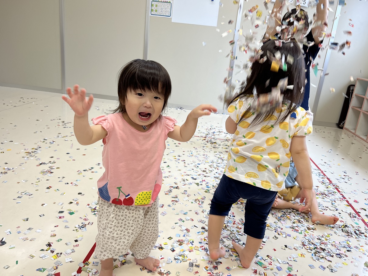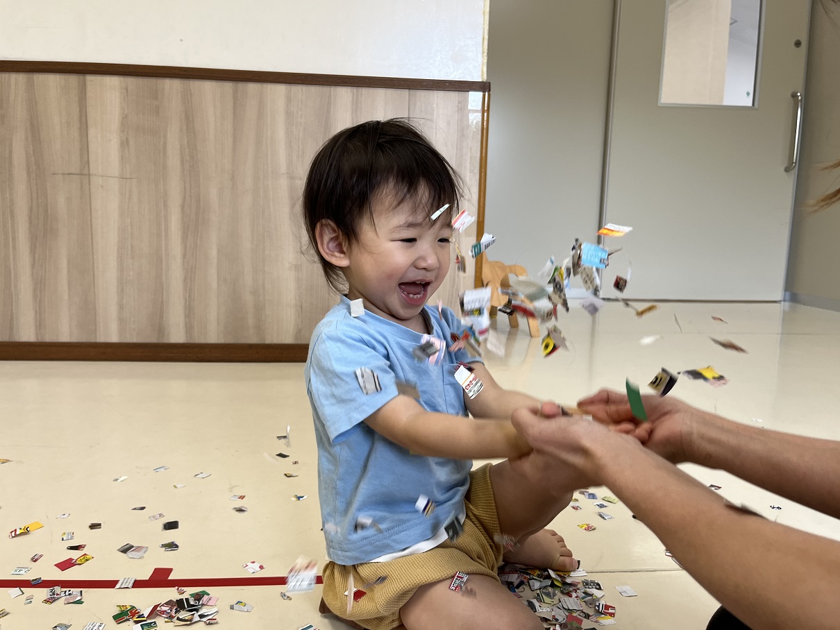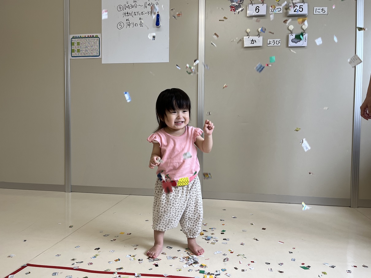 紙吹雪遊びを行いました。 初めての紙吹雪遊びでしたが、紙吹雪が上から降ってくると、「きゃー!」と両手を広げる子どもたち。 ぎゅっと握ったり、パラパラと床に落とし、紙吹雪が落ちて来る様子を見たりして遊ぶ姿が見られました。 また、オーガンジーの上に紙吹雪を乗せると、触ったり、足で蹴ったり、全身で紙吹雪の感触を味わうことができたいぬグループさんでした!
