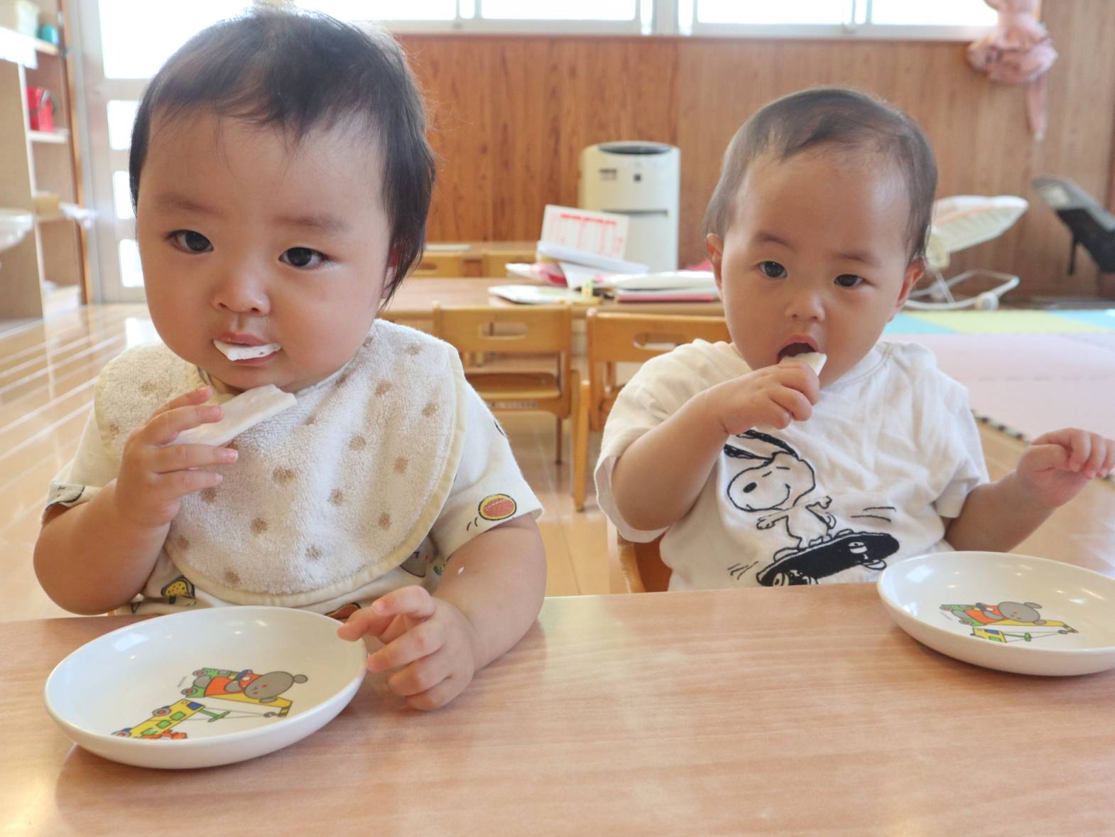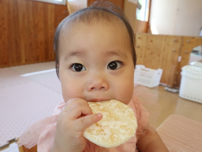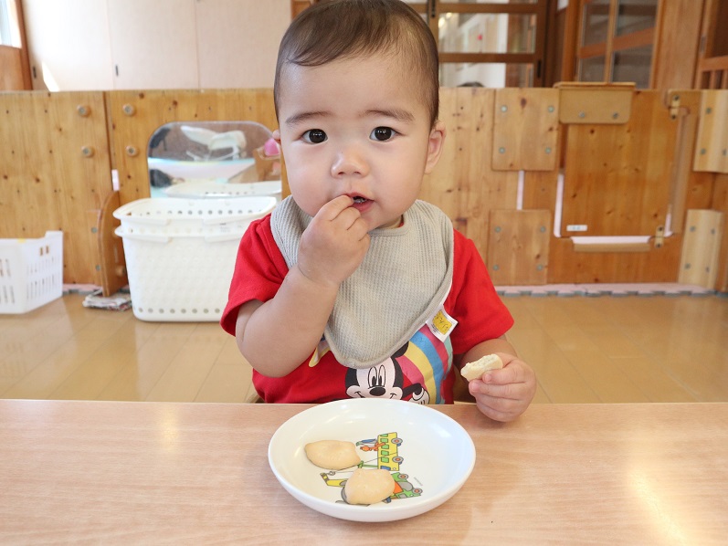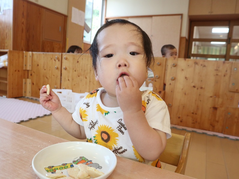おやつが大好きなひよこ組さん。 毎日のおやつを楽しみにしています。 椅子に座ったら、手を消毒して水分補給も済ませて準備はオーケー! 元気よく「いいただきます」をして食べ進めていきます。 自分でしっかりとおやつを持って口に運ぶ子どもたち。 全部食べたら、座っていた椅子を元に戻して、手口拭きをごみ箱に捨てておしまいです。 少しずつ自分の事は自分でできるようになってきたひよこ組さんでした。