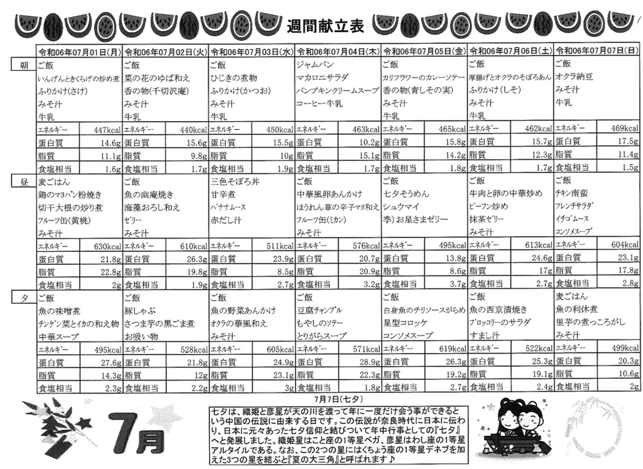 7月1日(月)~7月7日(日)の献立表になります。ぜひご覧ください。
