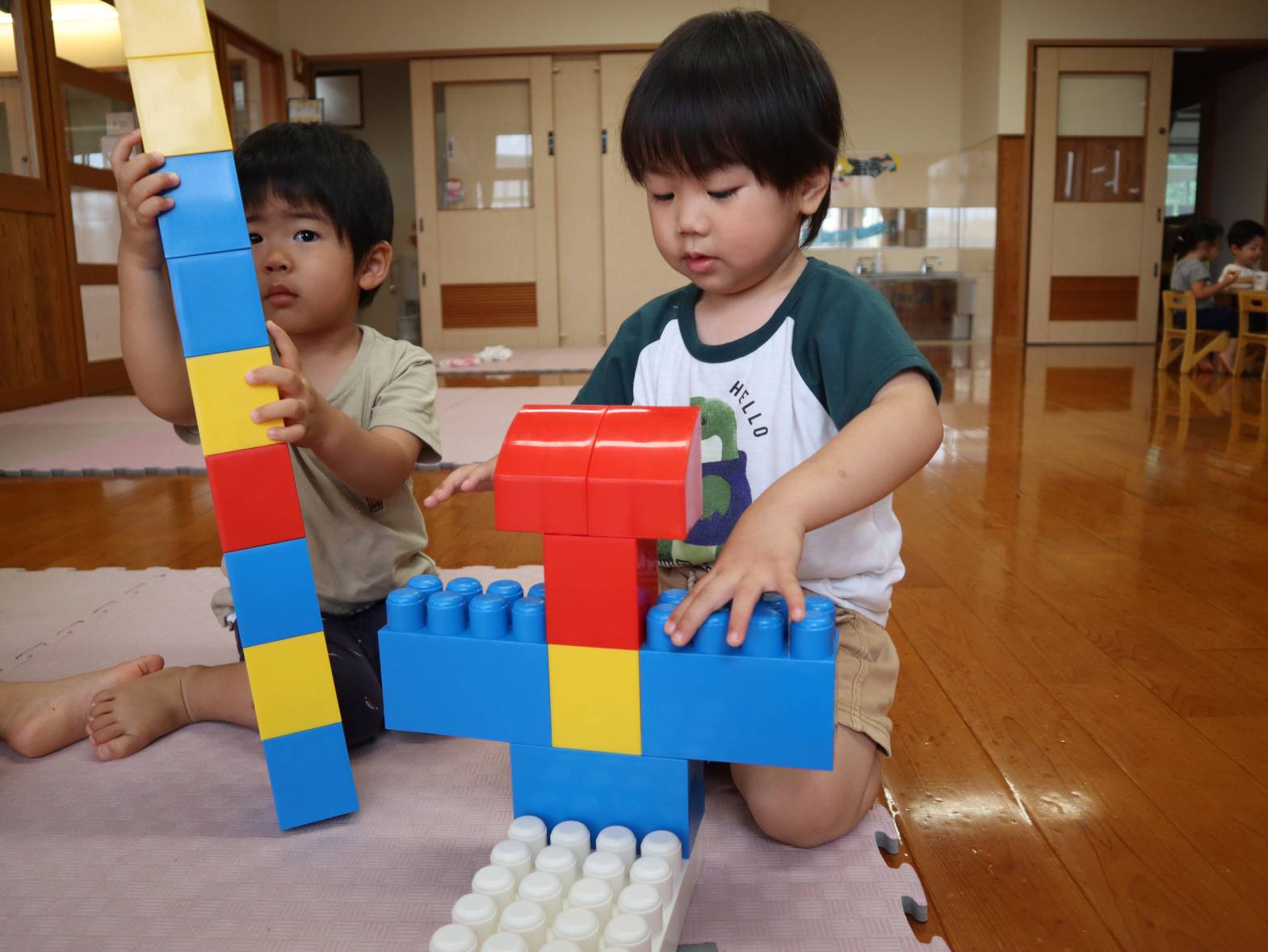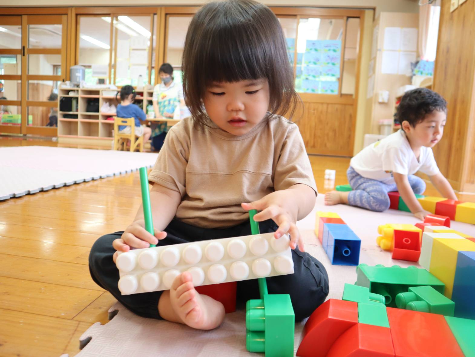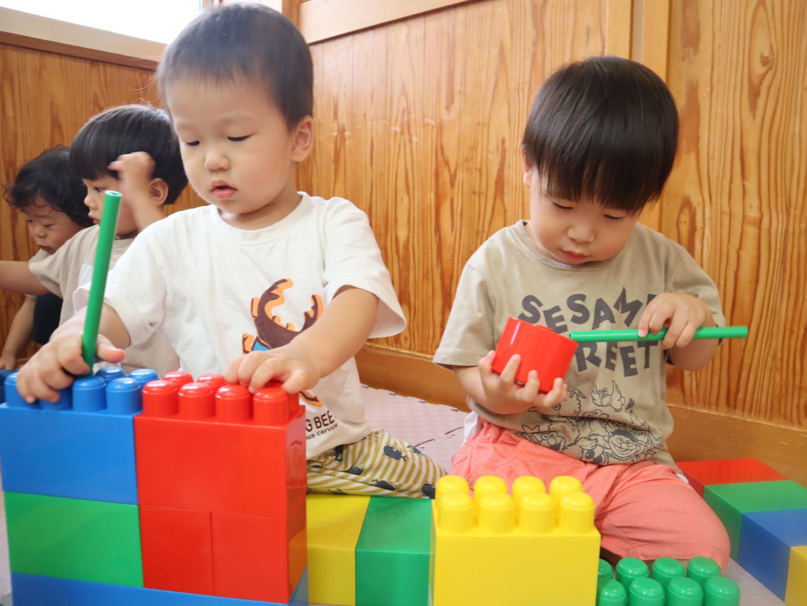 創造性の高まってきたぱんだ組の子どもたちは、最近大きなブロックに夢中です! 友だち同士で「こっち持ってて!」、「一緒に車作ろう!」と協力しながら色んな形を作っていく姿が見られます。 大きなブロックなので苦戦することも多いですが、試行錯誤しながらパーツを組み合わせていく子どもたち。 「今度は飛行機作りたいな。」、「また一緒に作ろうね。」と大満足のようです。