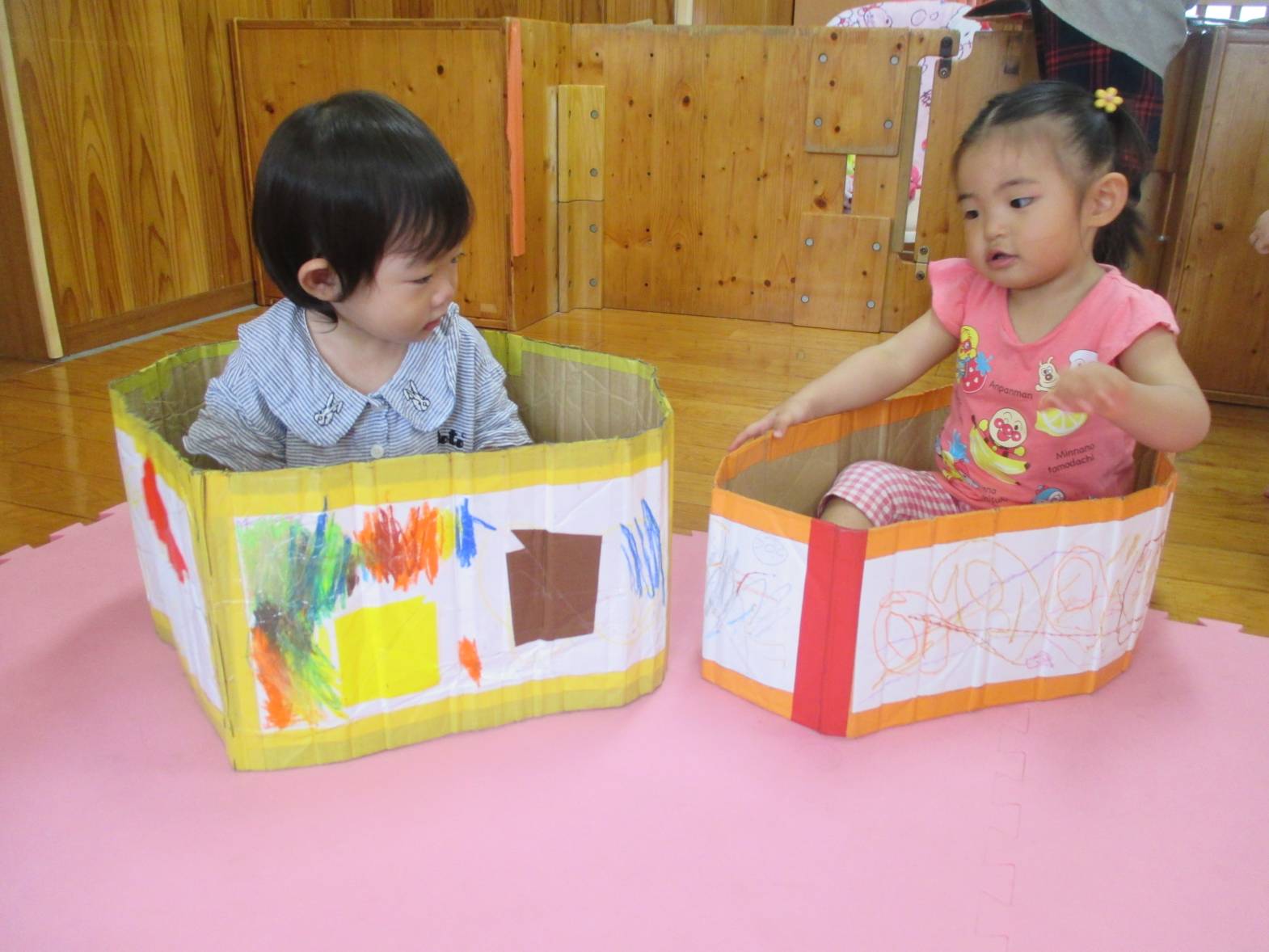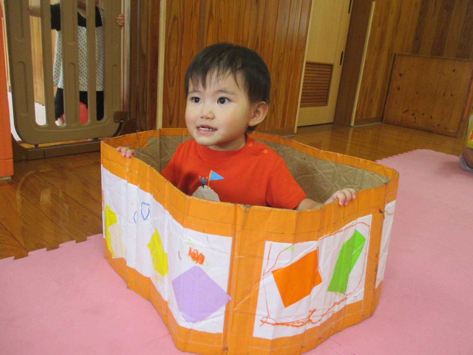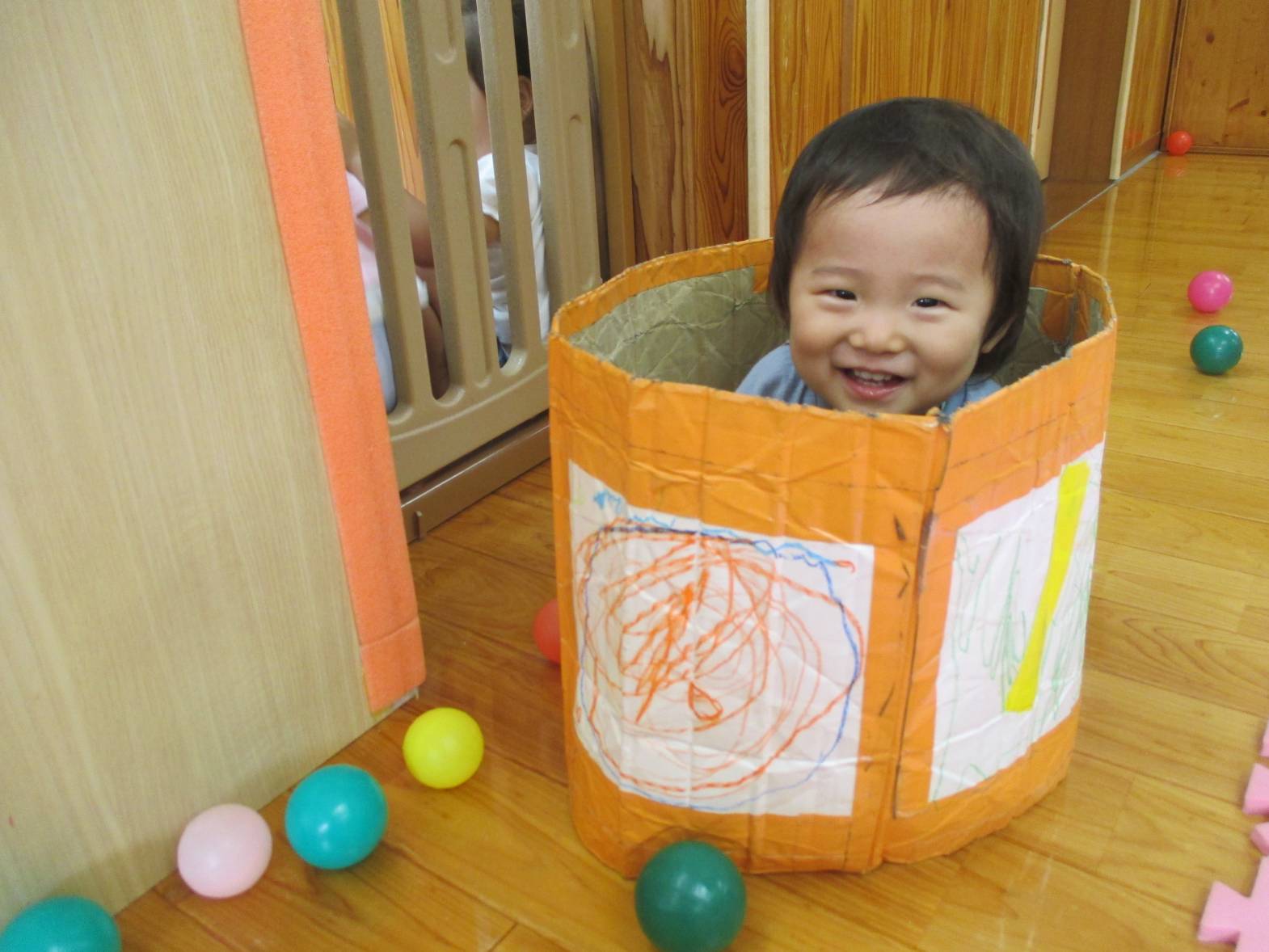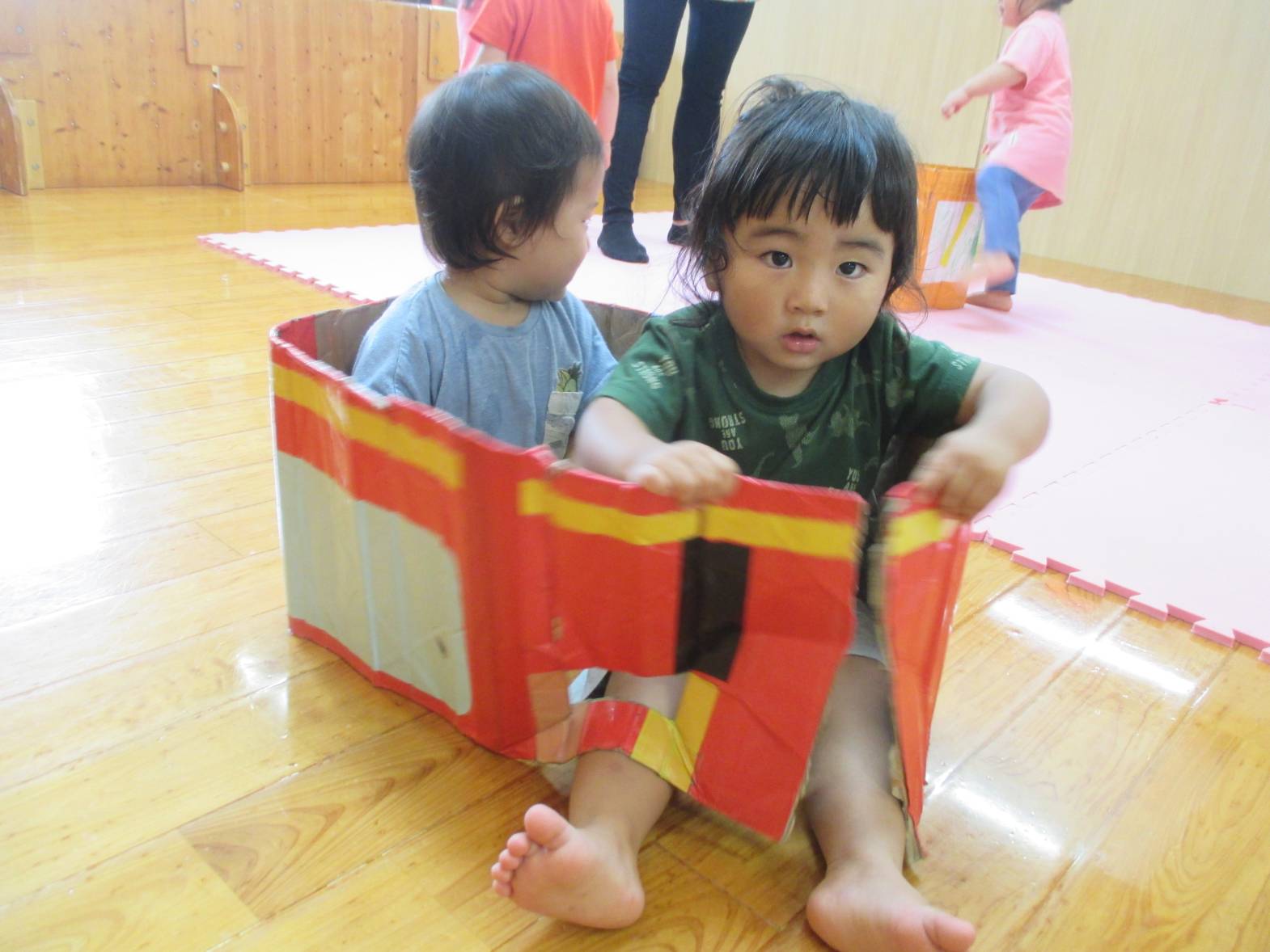 先週、段ボール電車で遊びました! わあ!とすぐに興味津々のこあら組さん。 保育者の真似をして中に入ると、上手に電車やバスごっこの始まりです。 “しゅっしゅっ、ぽっぽ!” ”がたんごとん、ブッブー!”と、友だちとすれ違うと嬉しそうな笑顔を見せてくれました。 友だちと二人で歩いたり入ったりと、仲良く使うことができた子どもたち。 お風呂のように中に入ったり、隠れて顔を出したりと様々な遊び方を楽しむ子どもたちでした!