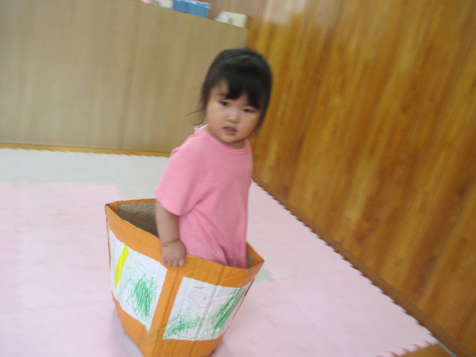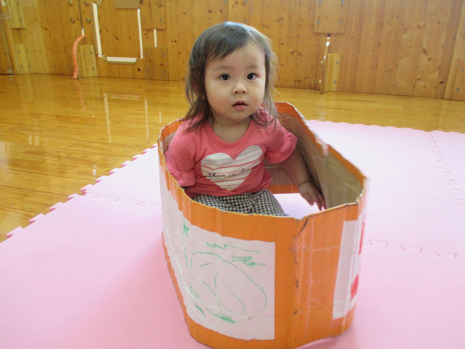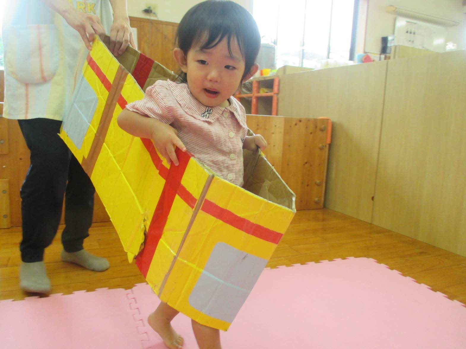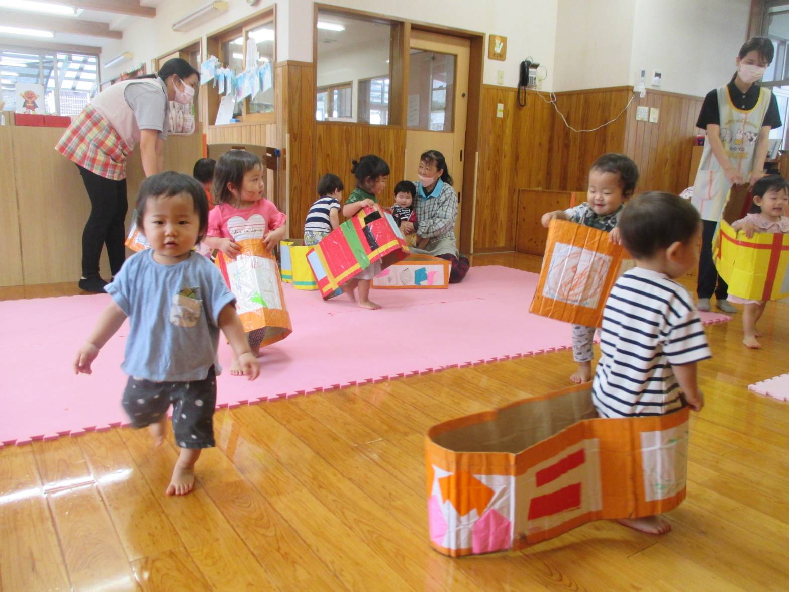 先週、段ボール電車で遊びました! わあ!とすぐに興味津々のこあら組さん。 保育者の真似をして中に入ると、上手に電車やバスごっこの始まりです。 “しゅっしゅっ、ぽっぽ!” ”がたんごとん、ブッブー!”と、友だちとすれ違うと嬉しそうな笑顔を見せてくれました。 友だちと二人で歩いたり入ったりと、仲良く使うことができた子どもたち。 お風呂のように中に入ったり、隠れて顔を出したりと様々な遊び方を楽しむ子どもたちでした!