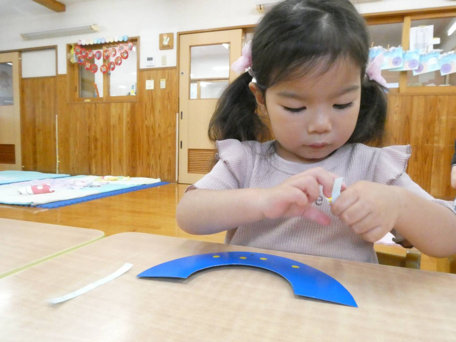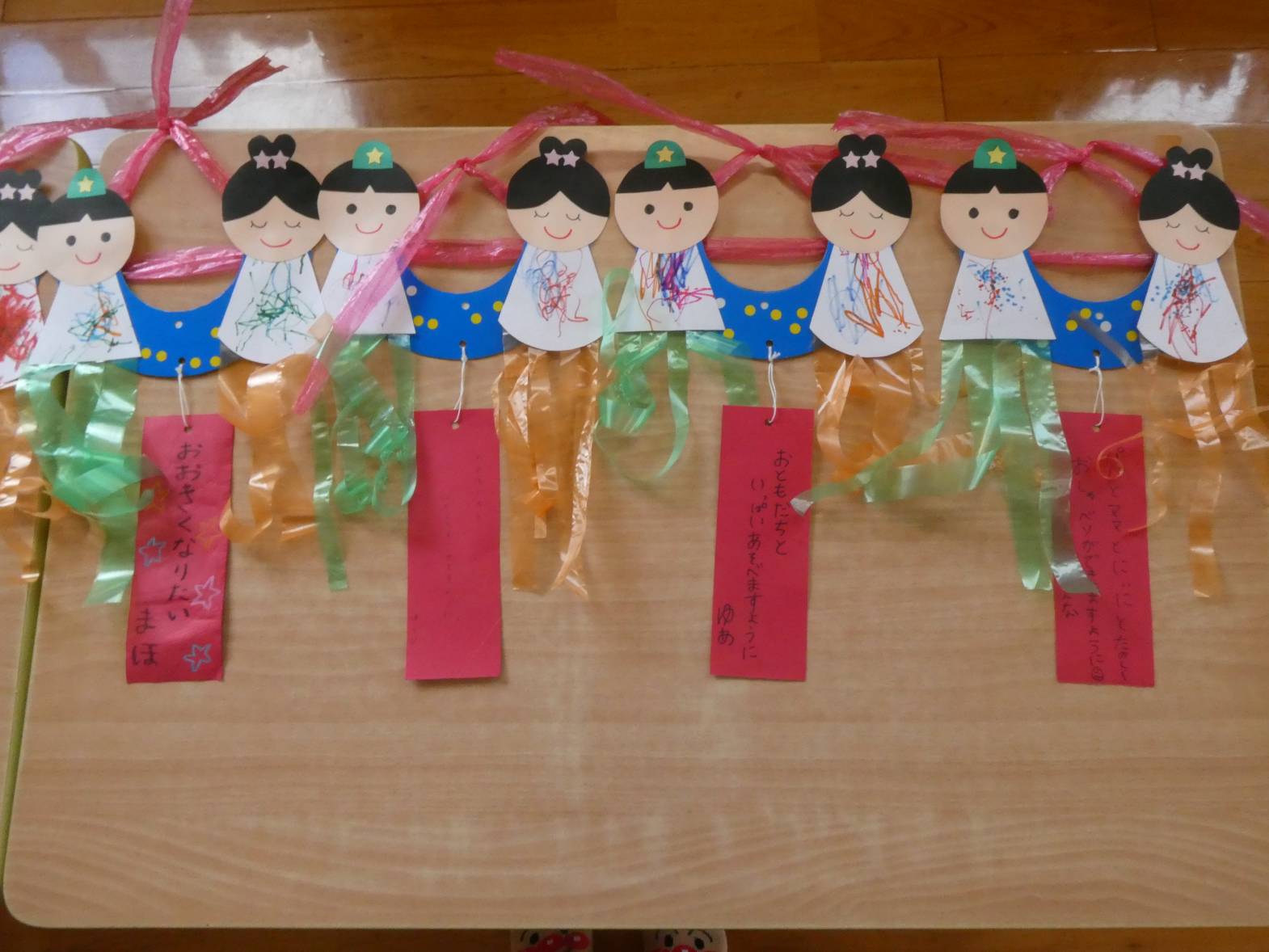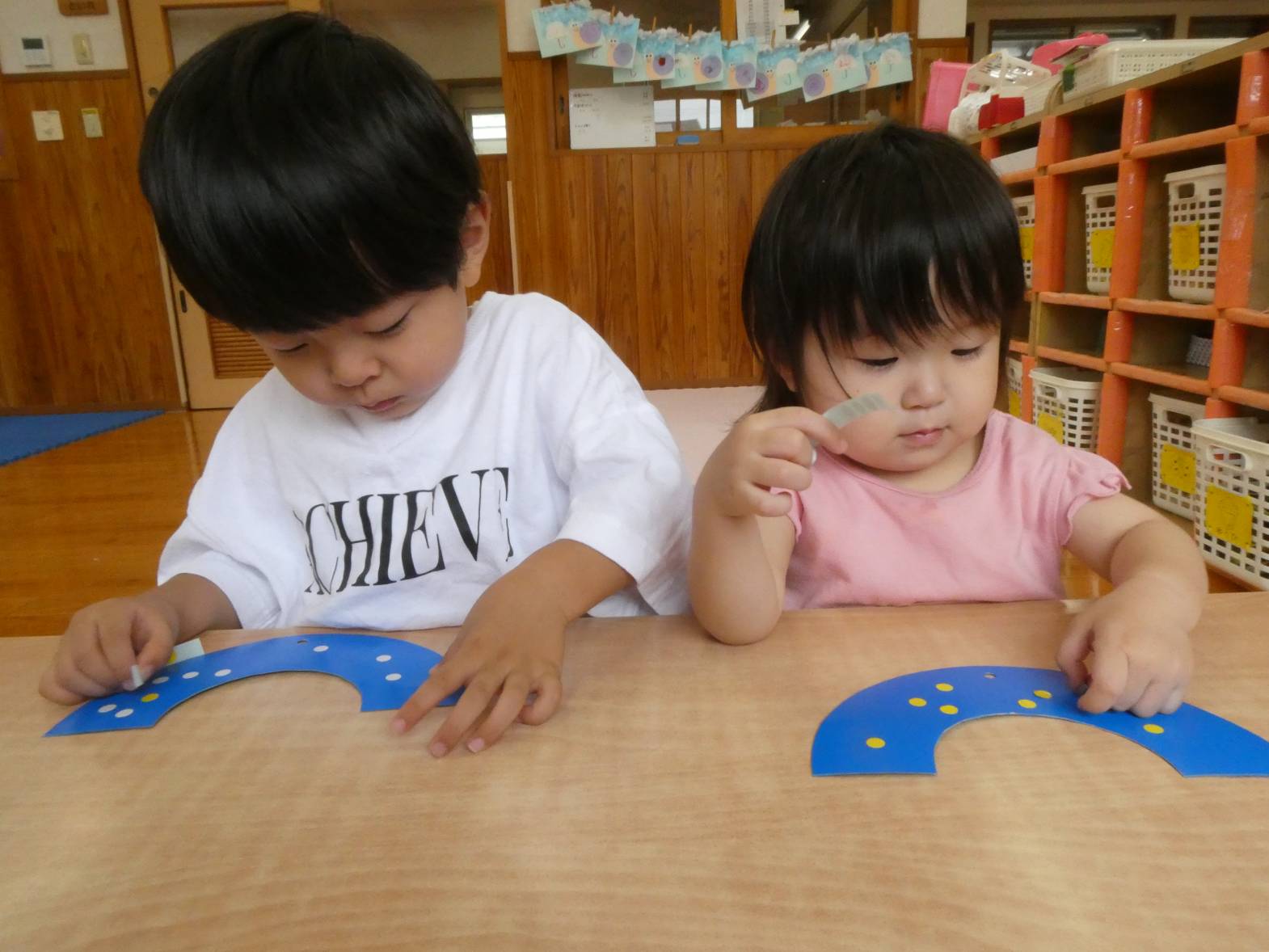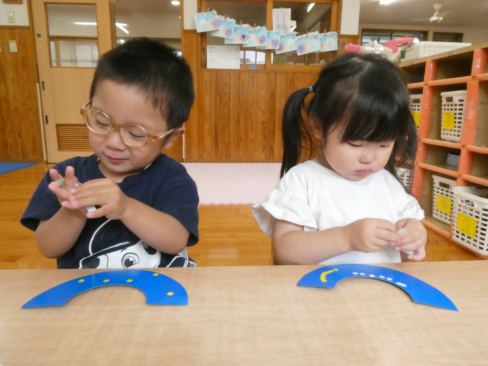 七夕に向けて製作をしました。 まずは、織姫と彦星の洋服の形に切った画用紙に、ペンで模様を描いていきます。 「私は、紫色が好きだから紫色で描こう!」、「僕は、いろんな色で描く。」等、楽しそうに取り組む子どもたち。 次に青色の画用紙に、黄色と白色のシールを貼っていきます。 小さめのシールだったため、台紙から取りにくそうな様子も見られましたが、頑張っていた子どもたち。 最後に装飾をして、七夕製作の完成です。 ぱんだ組さんの願い事が、叶いますように☆