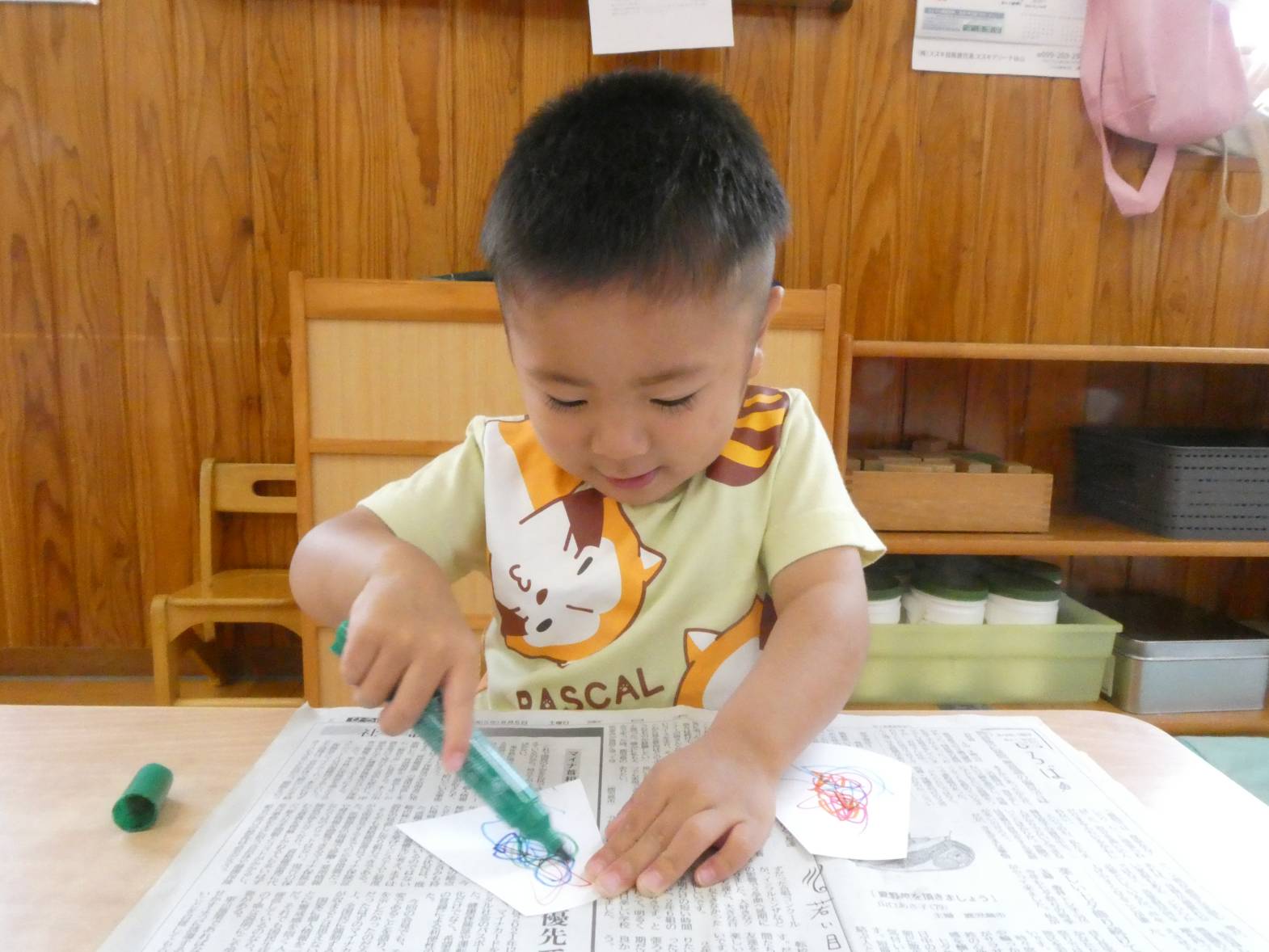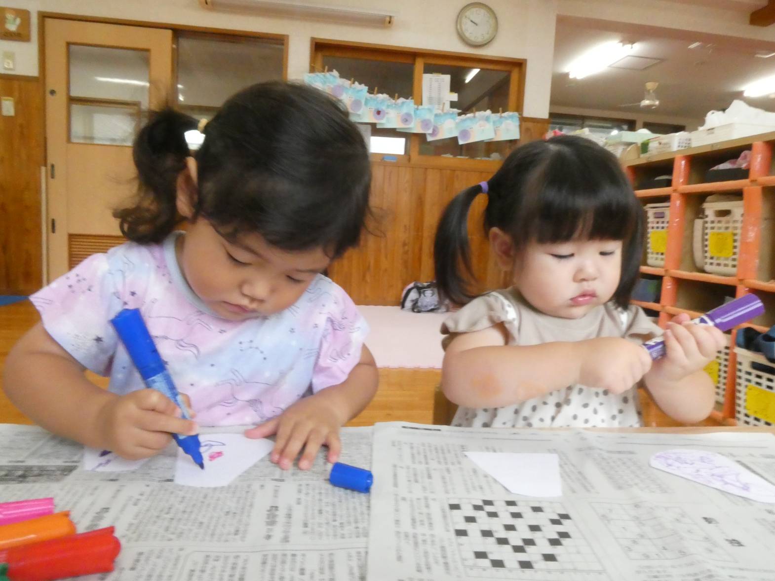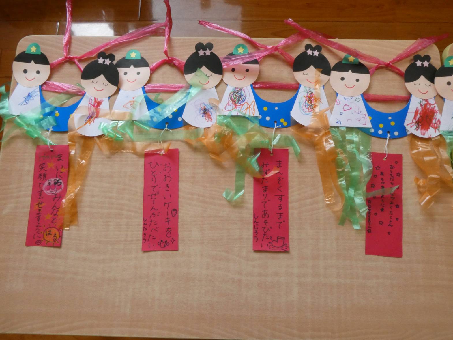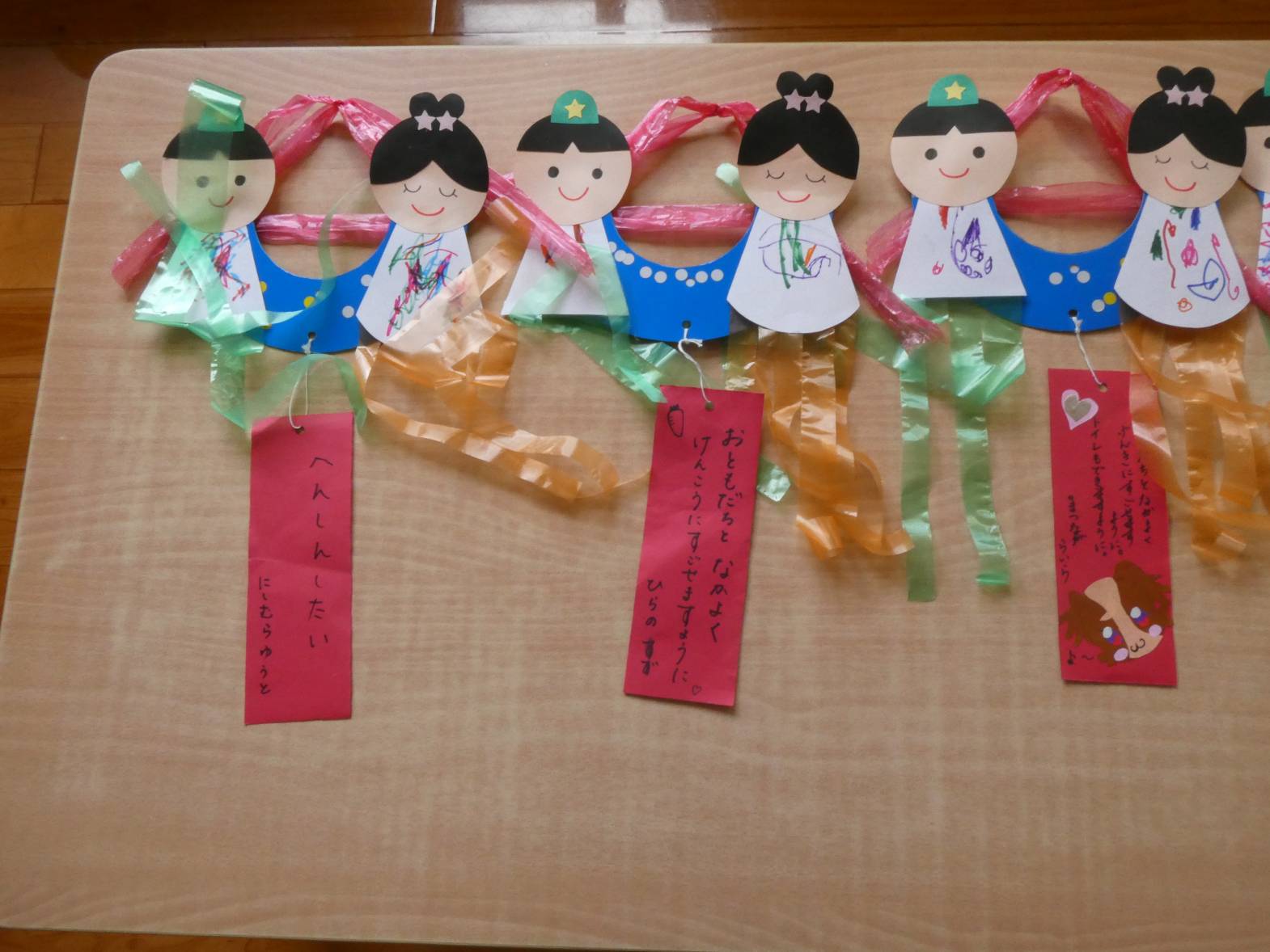 七夕に向けて製作をしました。 まずは、織姫と彦星の洋服の形に切った画用紙に、ペンで模様を描いていきます。 「私は、紫色が好きだから紫色で描こう!」、「僕は、いろんな色で描く。」等、楽しそうに取り組む子どもたち。 次に青色の画用紙に、黄色と白色のシールを貼っていきます。 小さめのシールだったため、台紙から取りにくそうな様子も見られましたが、頑張っていた子どもたち。 最後に装飾をして、七夕製作の完成です。 ぱんだ組さんの願い事が、叶いますように☆